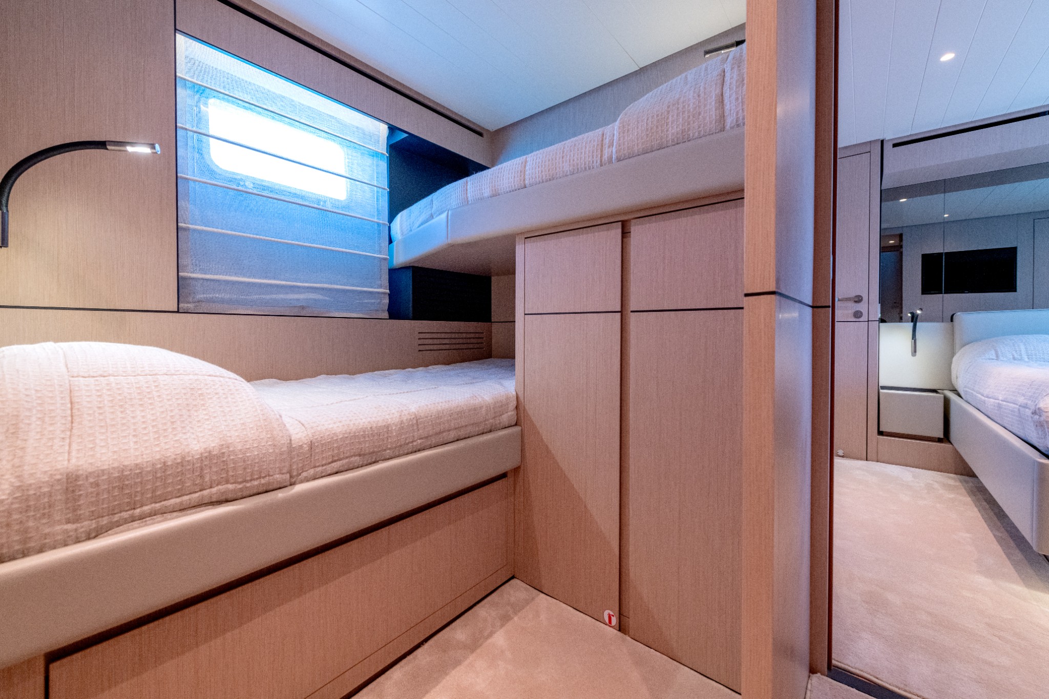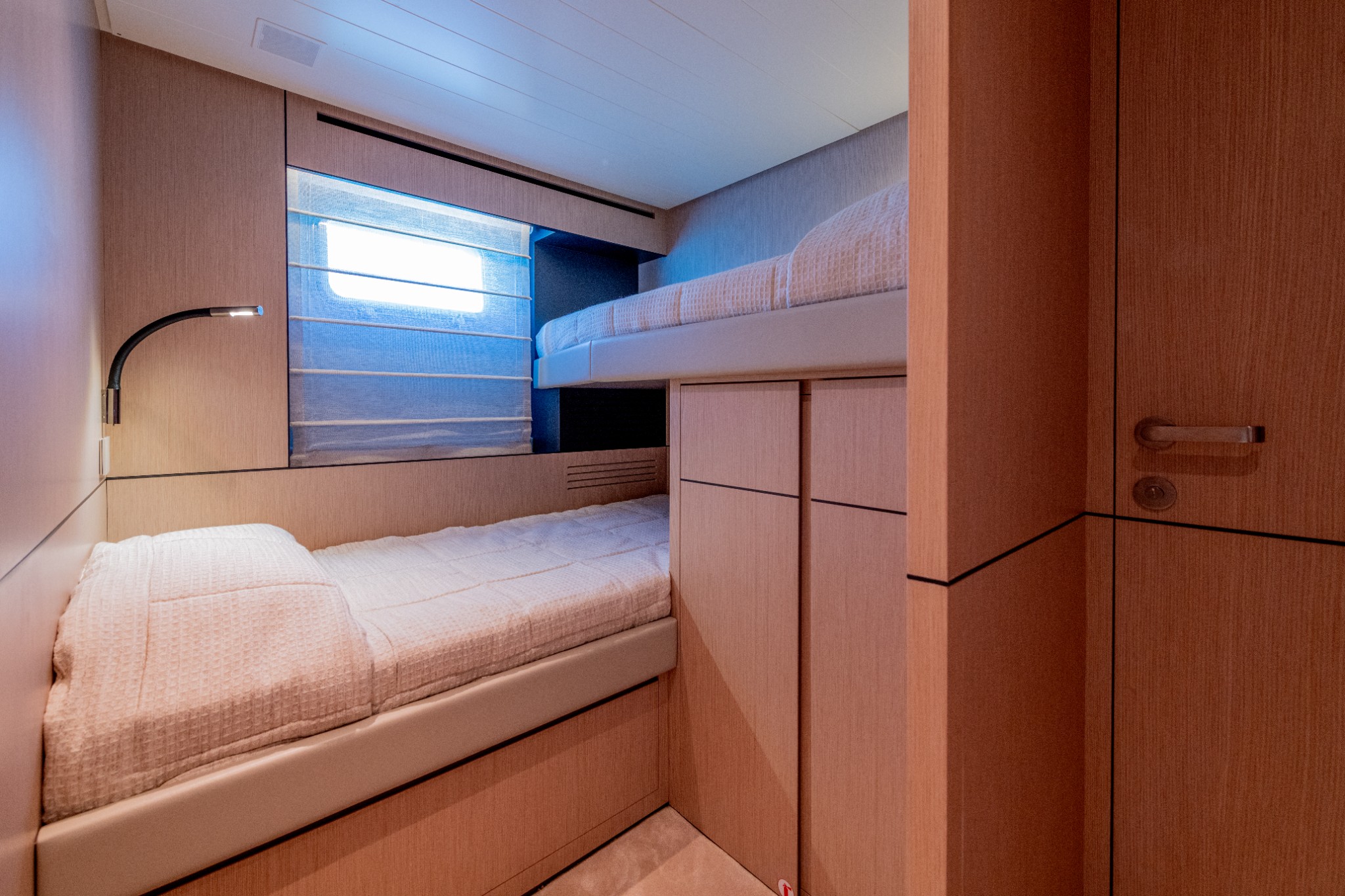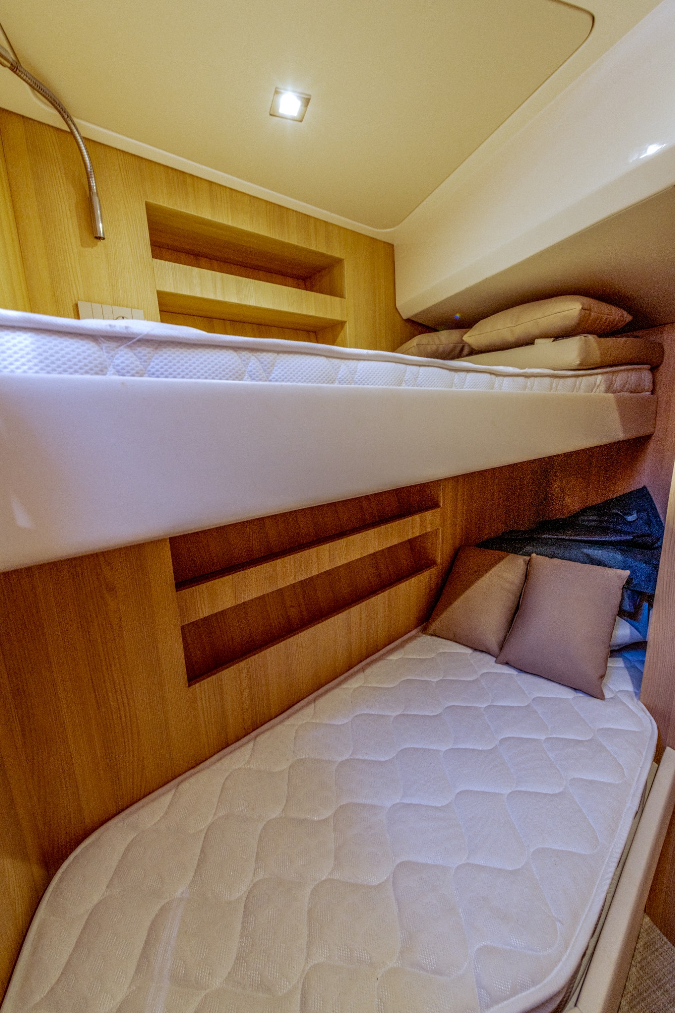 Bunk bed to port, reading light, storage cabinet and synthetic floor