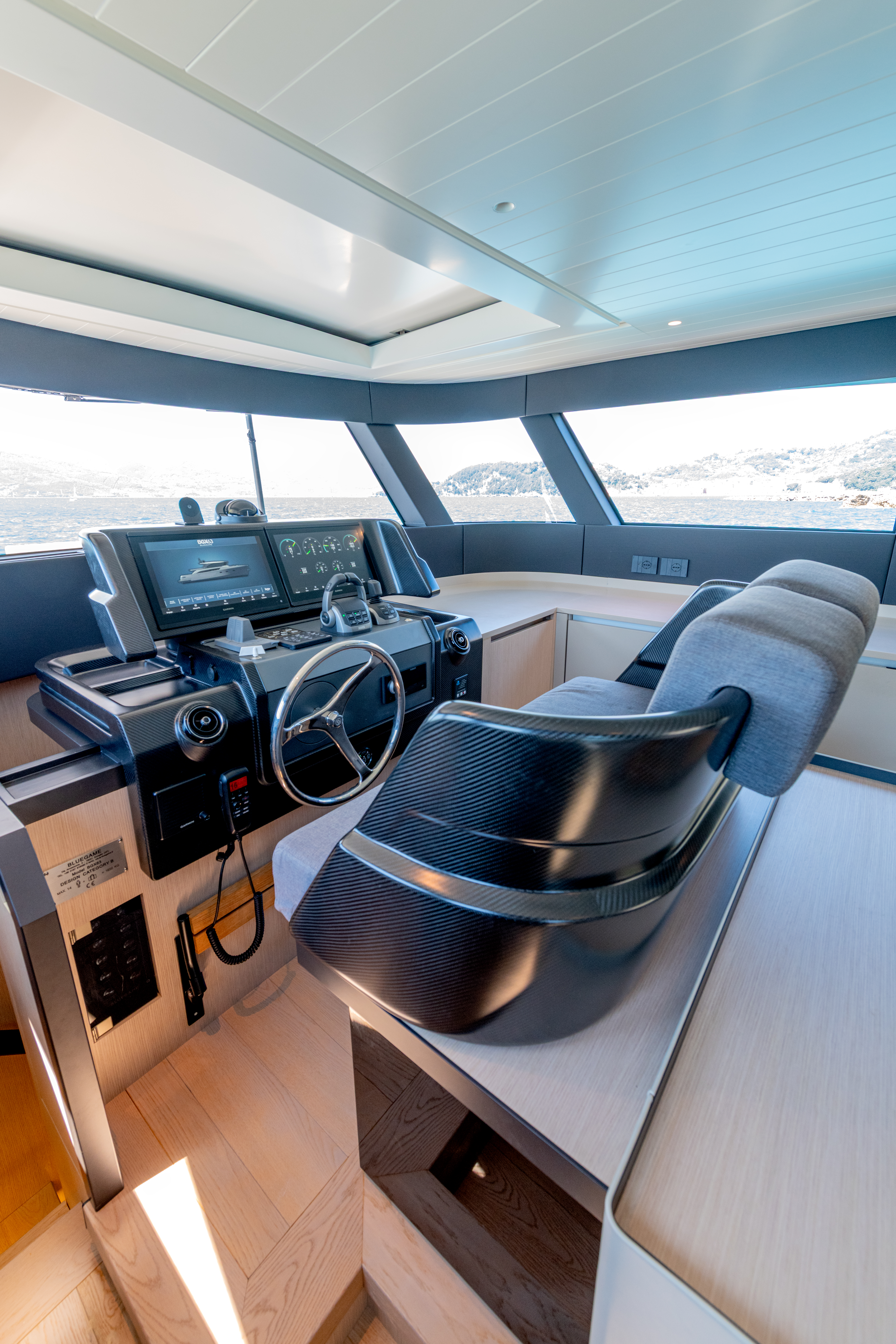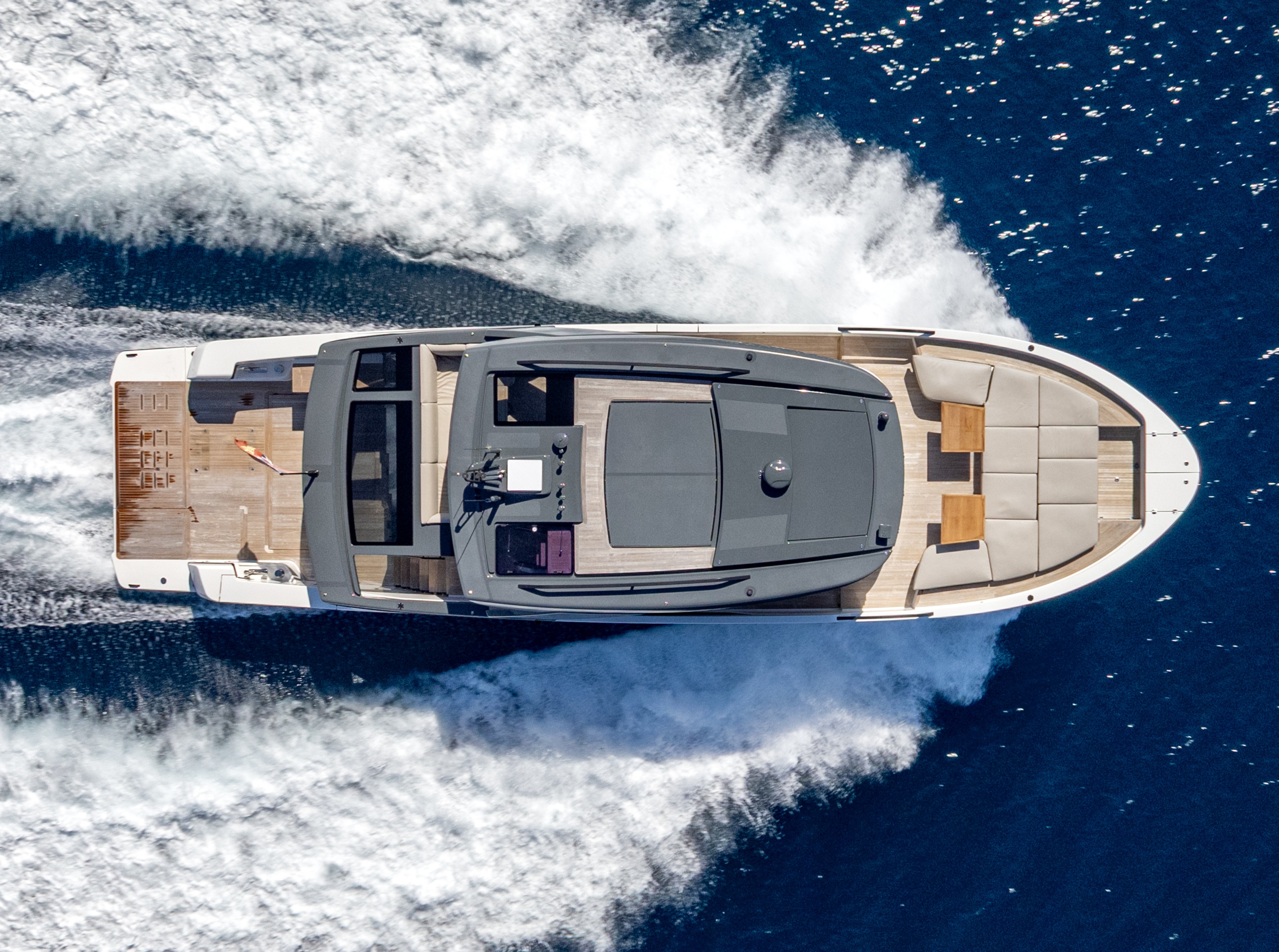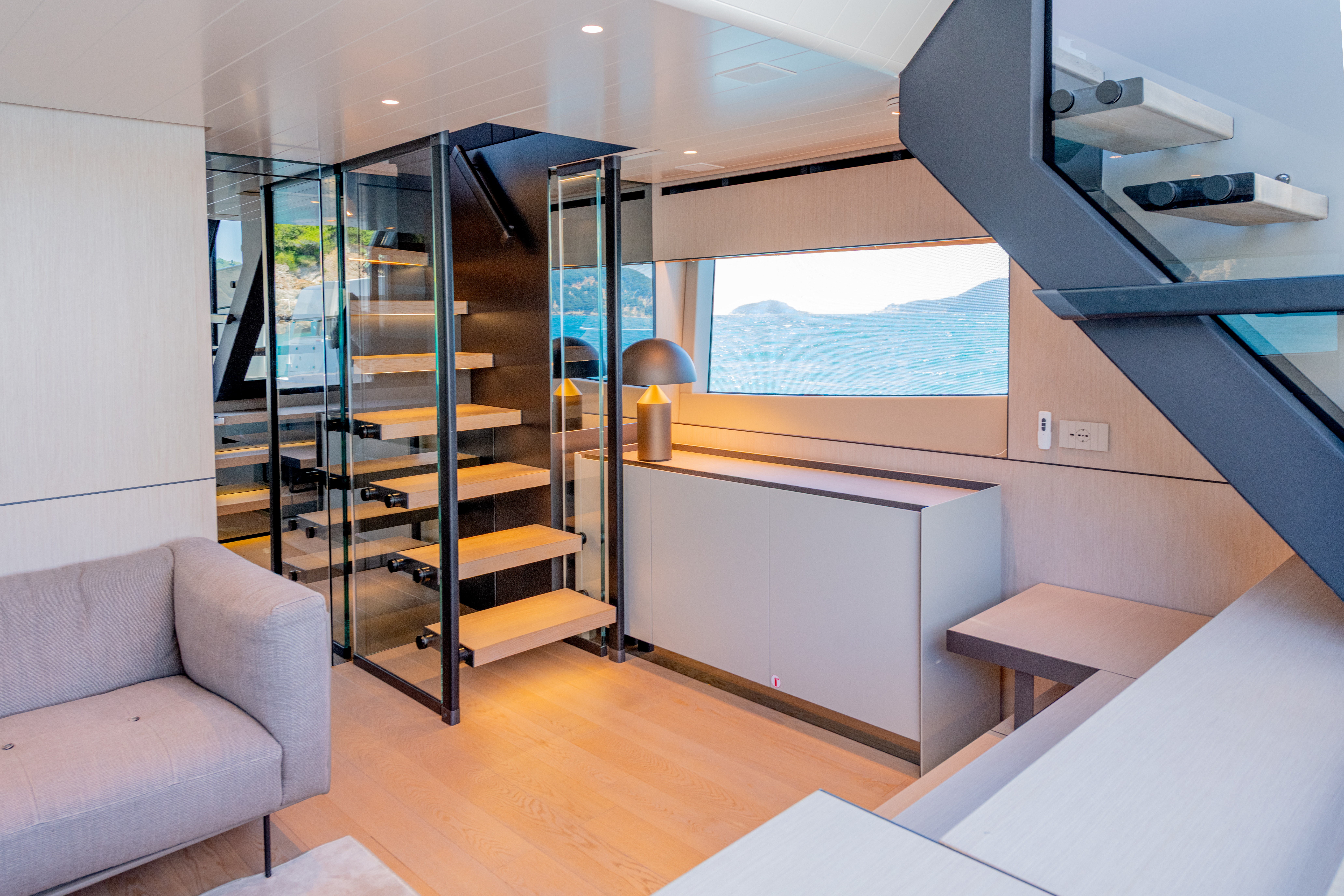 Port side pantograph door, electric sliding sunroof, sliding glass door aft, L shape sofa with table and two Living Divani stools, 42" Samsung Smart TV from electric ceiling dropdown, carbon fibre pilot and co-pilot bench, wine fridge (under helm bench), stairs from/to main saloon and stairs to guest area