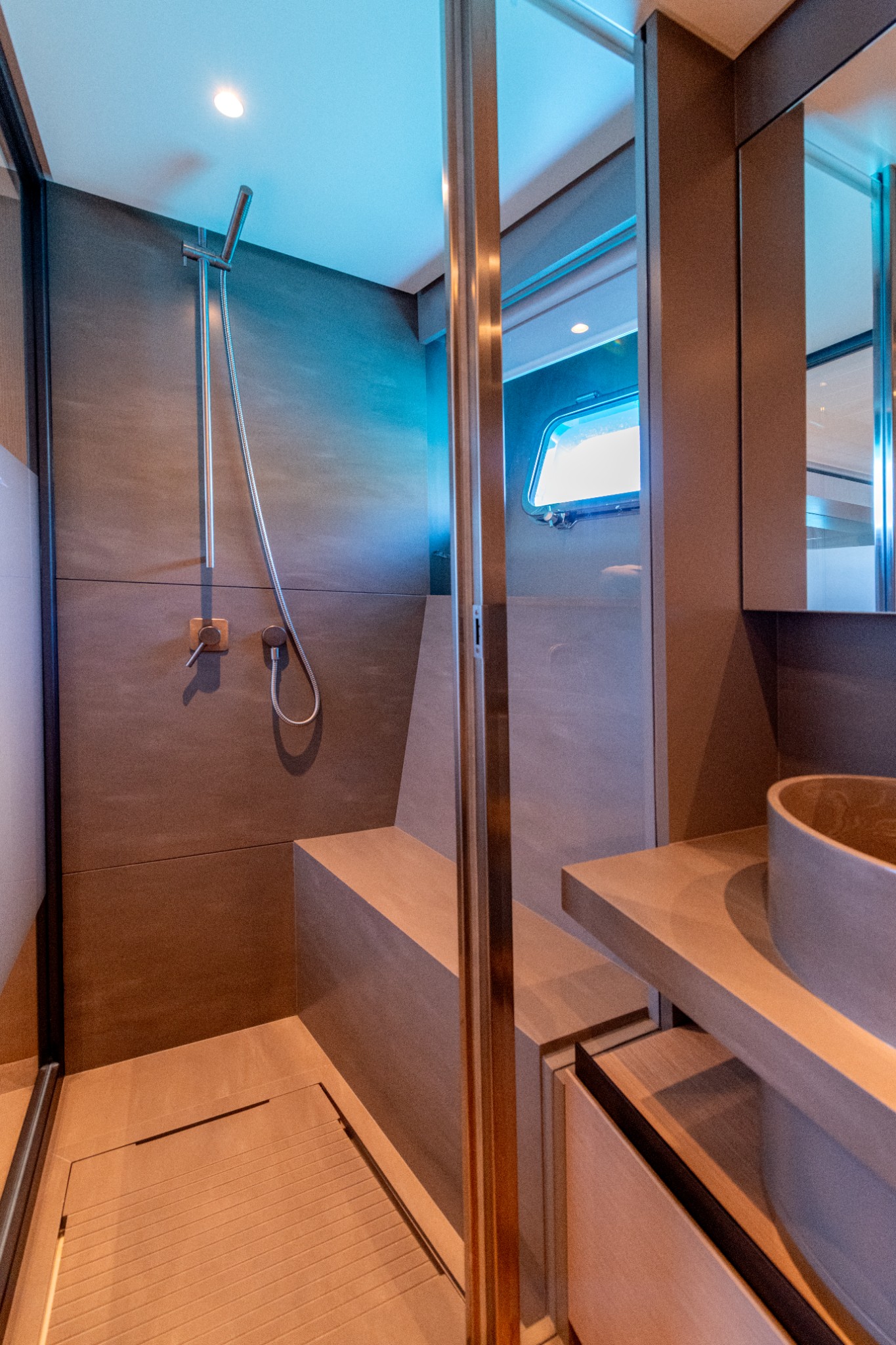 Fresh water electric WC, wooden floor, storage cabinet, sink and shower