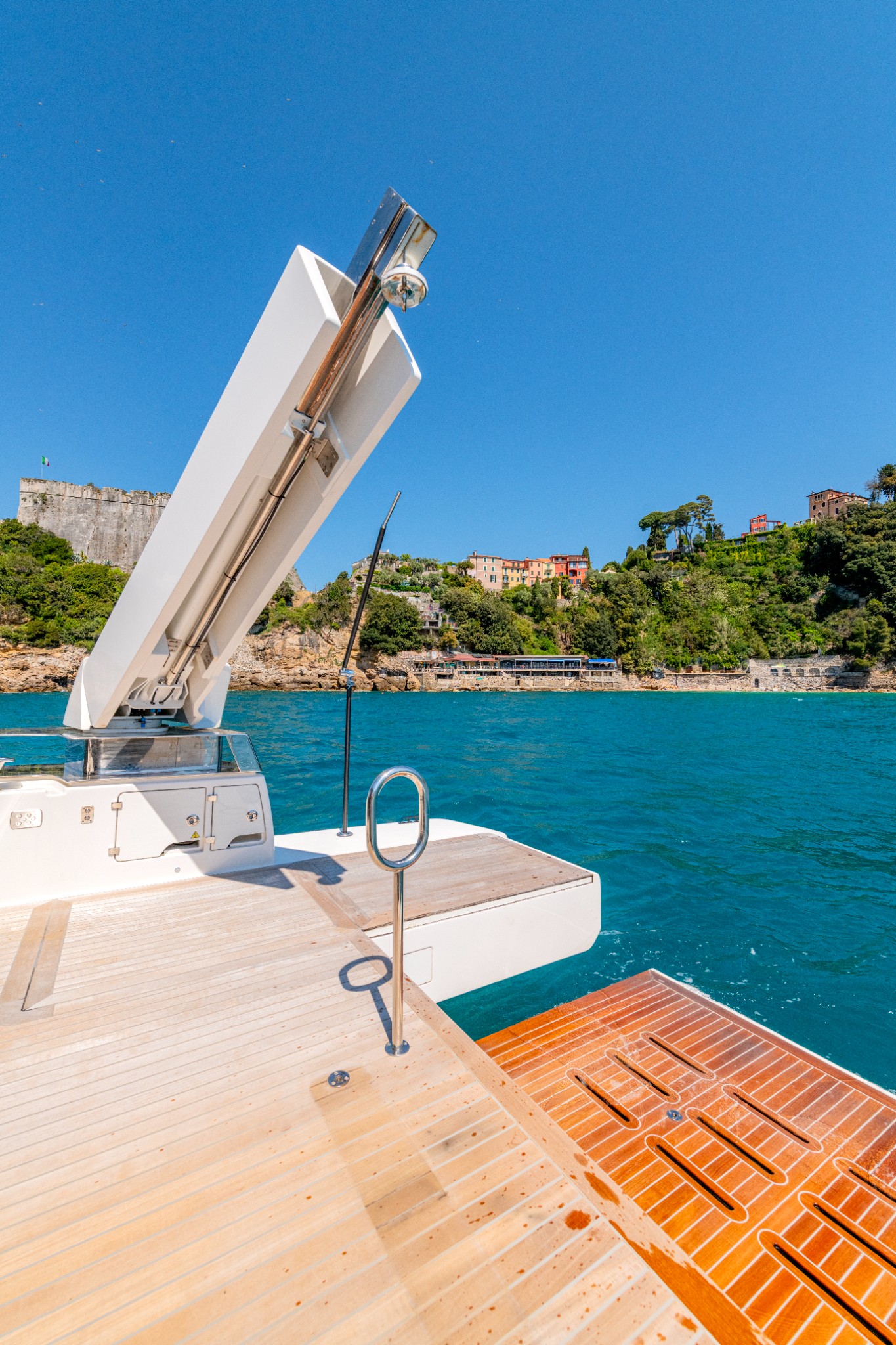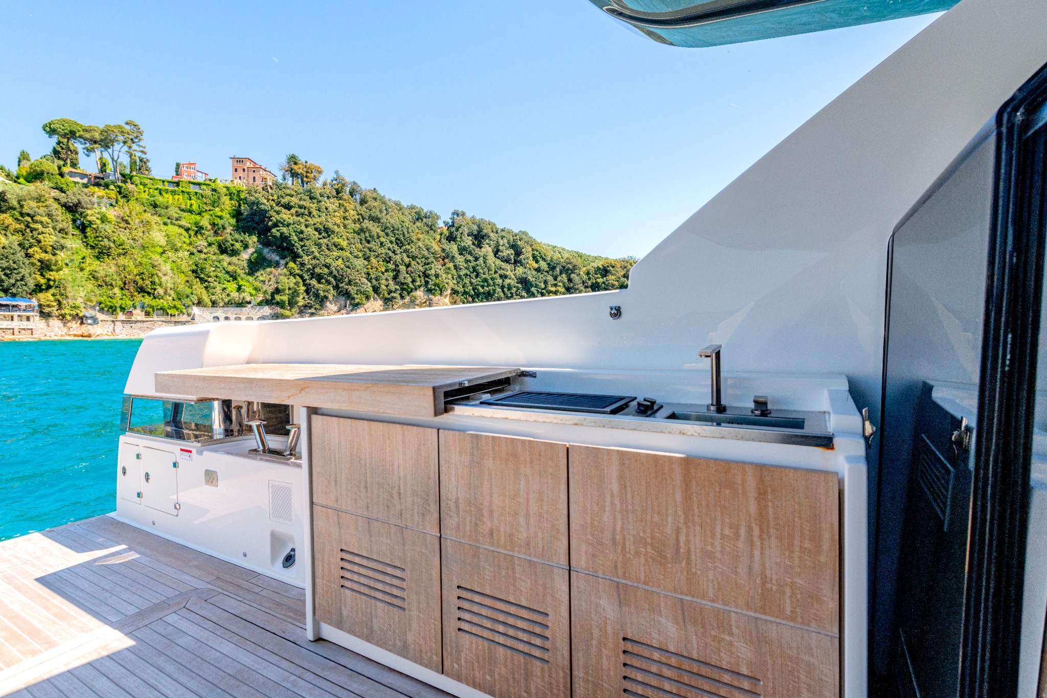 Teak stairs to upper deck, sliding glass door to main salon, Opacmare 180° launching crane with 500 kg lifting capacity, Opacmare gangway up/down steps, 3/4 length Opacmare hydraulic platform with 500 kg lifting capacity, sun awning with carbon fibre poles, wet bar with basin, icemaker, storage, bin, power socket and electric grill, hand held and ELKA carbon fibre removable hot/cold shower, Seabob F5 stand (for two Seabobs), port and starboard storage compartments, courtesy lights, large electric opening engine room hatch and manual inspection hatch