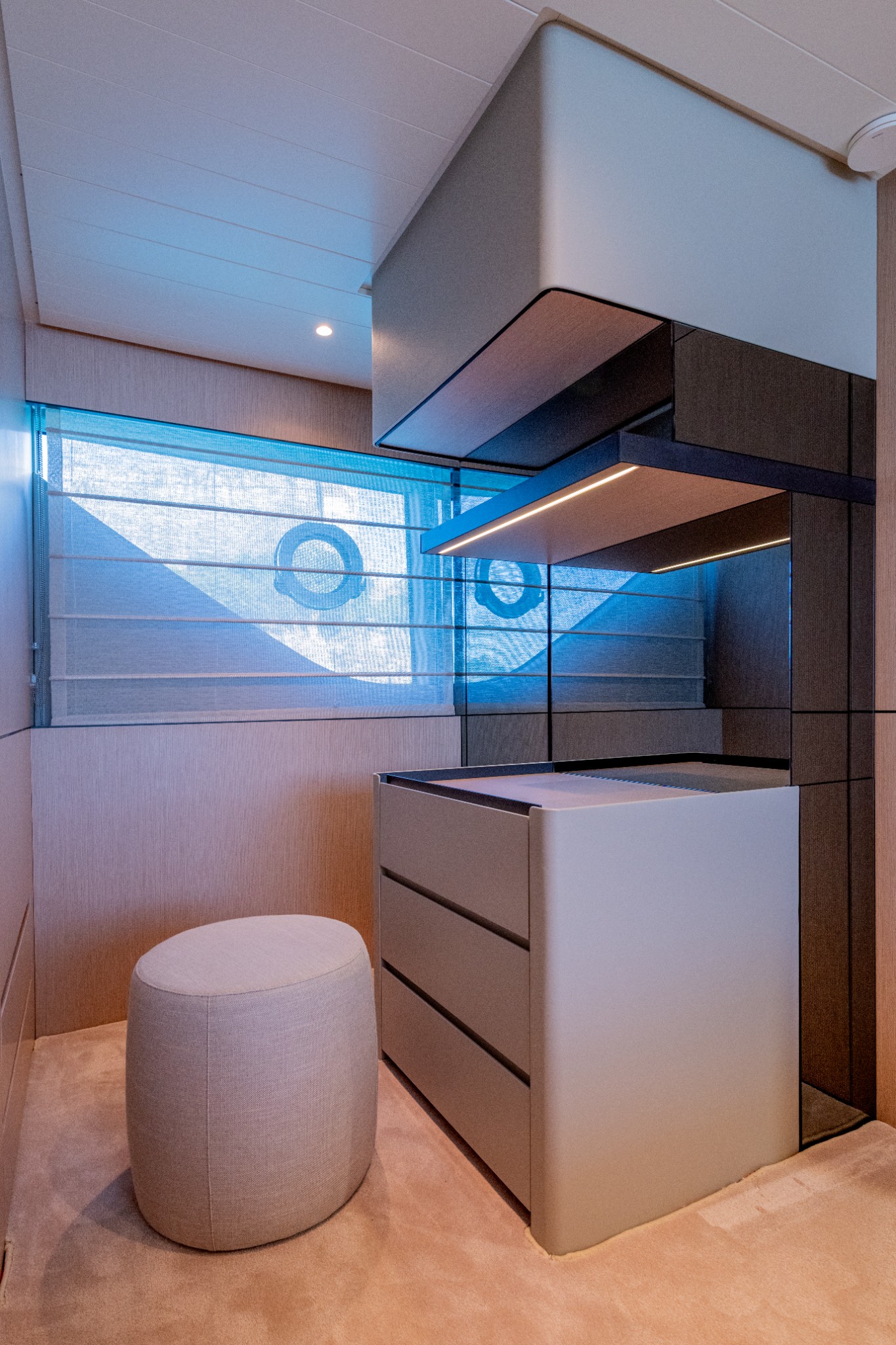 Double ottoman bed with bed spreads, reading lights, bedside cabinets, custom drawer below vanity unit built by Bluegame during build, Meridiani Charlot stool, safe, 32” Samsung Smart TV, wardrobe, storage, drawers and optional access door into guest cabin