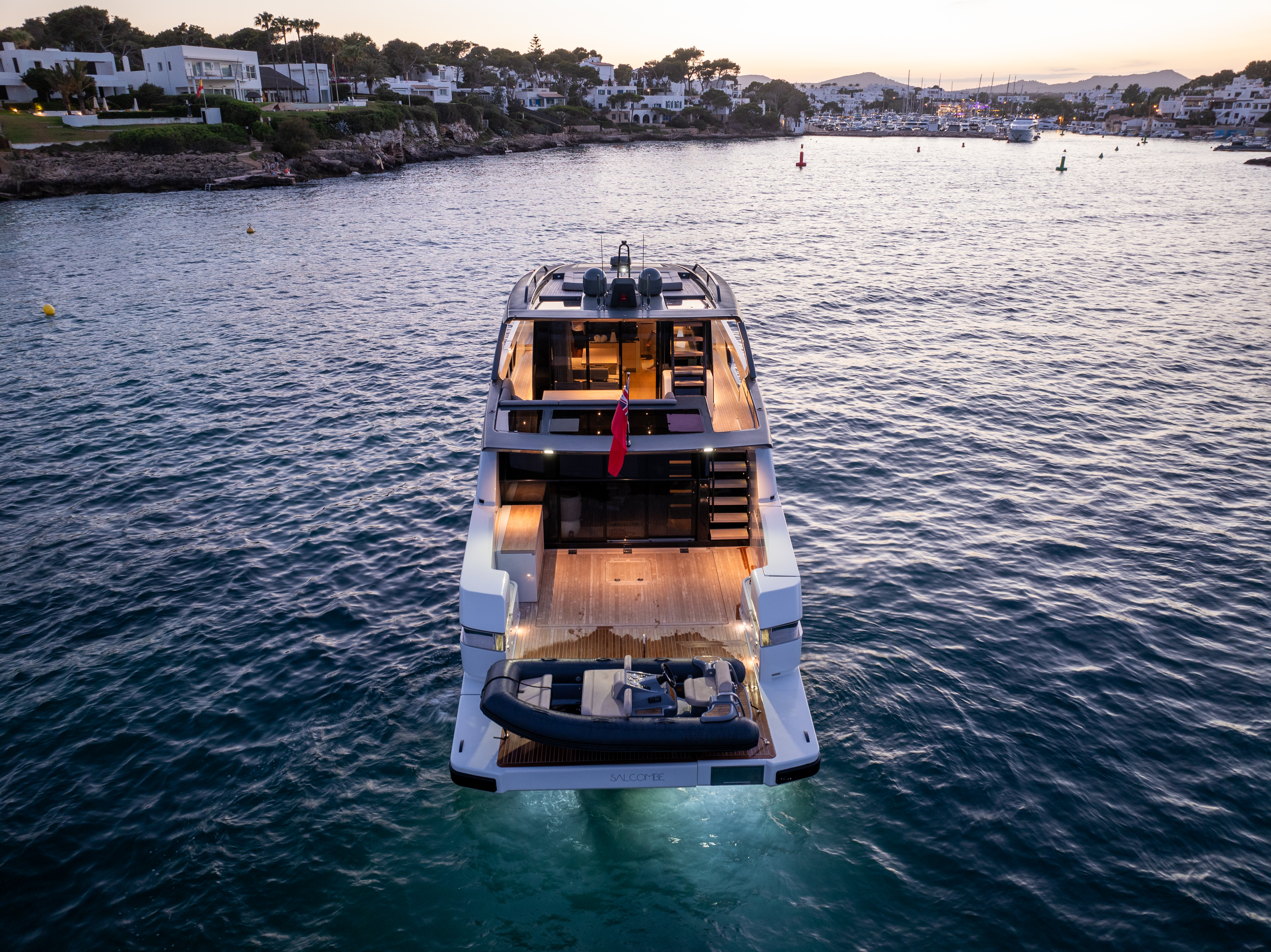 Located aft, teak steps to upper deck, 180° launching crane with 500 kg lifting capacity, retractable up/down gangway, extended stern with 3/4 500kg hydraulic platform, wet bar with basin, fridge, storage, bin and teppanyaki electric grill, handheld shower, two speakers & subwoofer connected to the saloon area, floor and side storage compartments, courtesy lights, sliding glass door to main saloon, large electrical engine room hatch and manual inspection hatch
