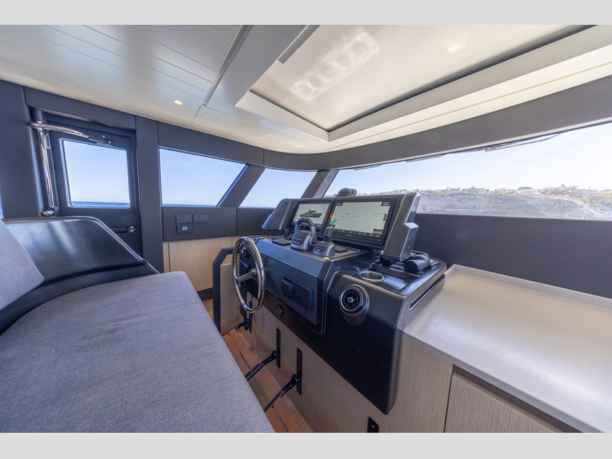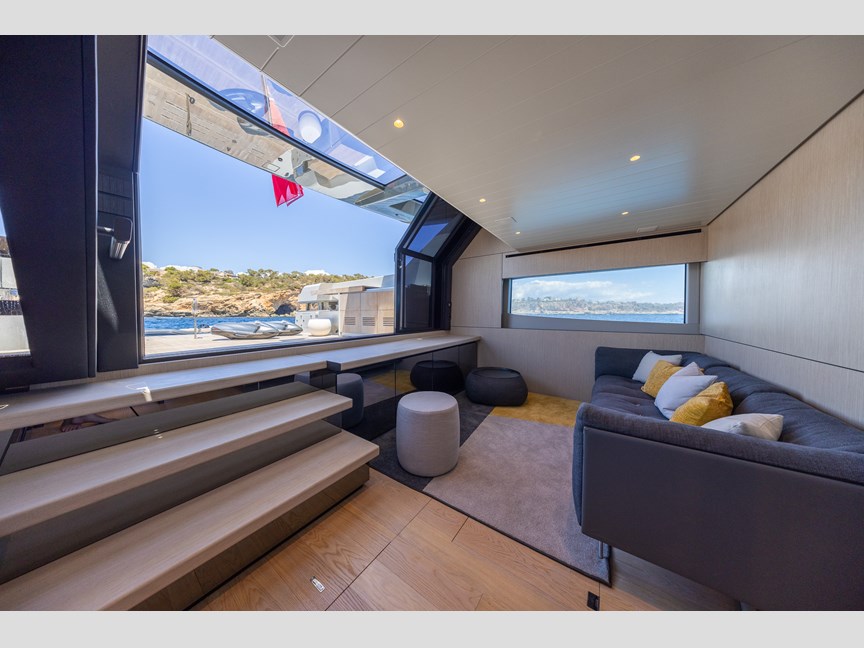 Located Midships on the upper deck, pantograph door to port, electric opening sunroof, sliding glass door aft with curtain, wooden floor, wooden venetian blinds, L shape sofa with table and two stools, 42" TV with electric ceiling dropdown, carbon pilot and co-pilot bench, helm station with navigation equipment, 1kg fire extinguisher, smoke detector, stairs from/to main saloon and stairs to guest area