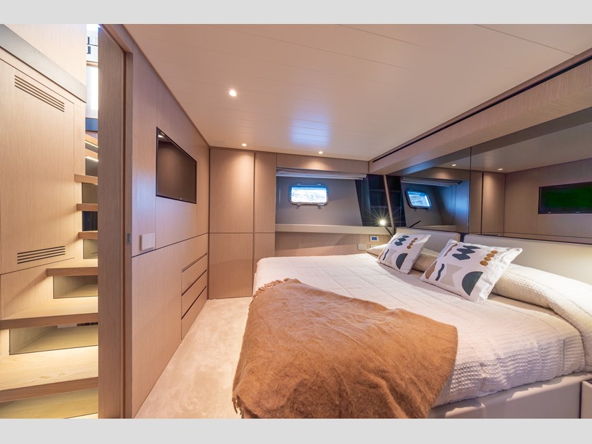 Located midships, double bed with memory foam mattress, reading lights, nightstands, vanity desk with stool, carpet floor, safe, 32” TV, HI-FI & two speakers, smoke detector, 1kg fire extinguisher, wardrobe, storage draws and access door into guest cabin