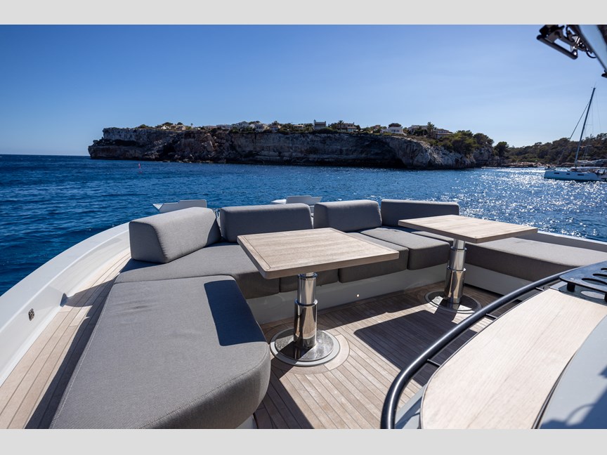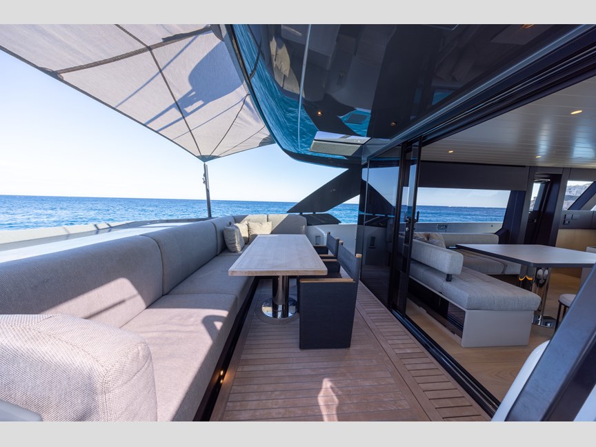 Located Midships aft on the upper deck, L shaped sofa on stern with teak table, glass skylight, sun awning with carbon poles, ladder to sundeck with manual hatch, two speakers in stern area with are connected to the deckhouse area