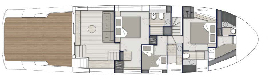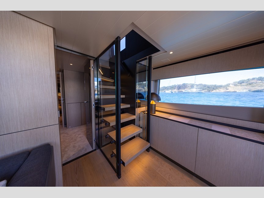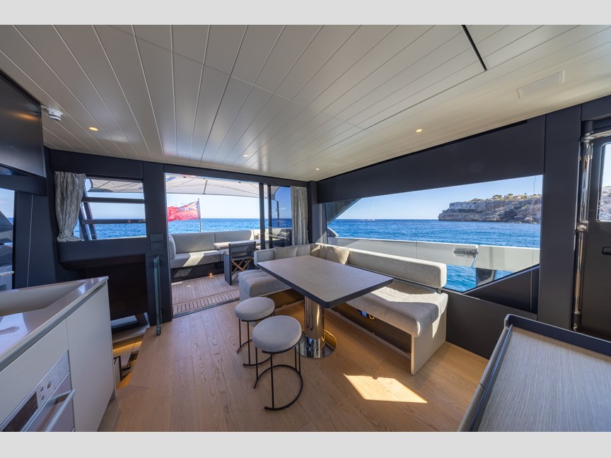 Located midships aft, sliding door to beach club area with electric blind, steps from beach club to saloon, sofa, coffee table, wooden floor, wooden venetian blinds, 50” TV on electric hi/low, hi-fi, four speakers, storage cabinet with ice maker, smoke detector, 1kg fire extinguisher, stairs to deckhouse and owners cabin entrance