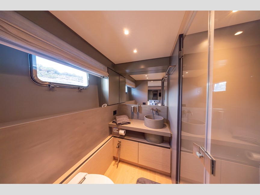 Located to port, fresh water electric WC, wooden floor, storage cabinet, sink, shower, smoke detector, 1kg fire extinguisher