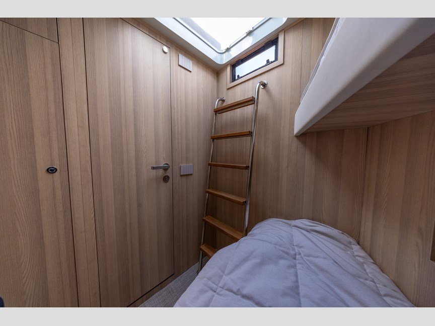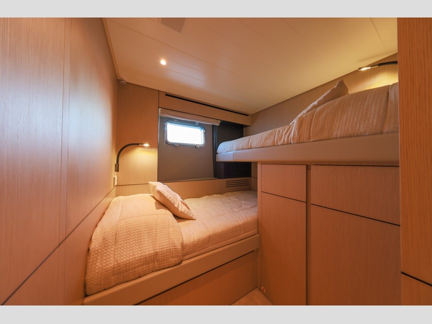Located midships to starboard, two crossed single beds with memory foam mattresses, reading lights, wardrobe, carpet floor, HI-FI, two speakers and access door from owners cabin
