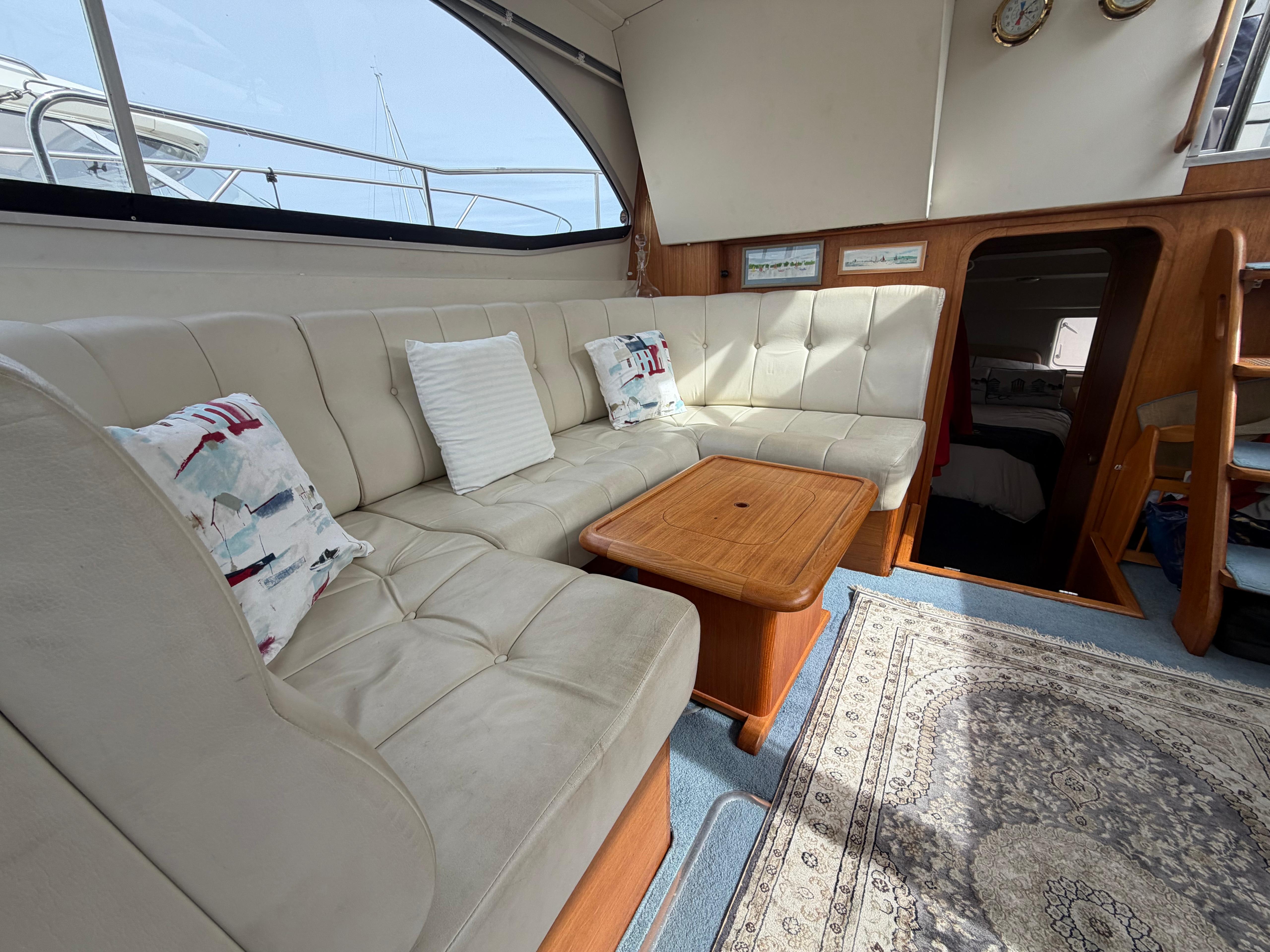 Large U-shaped settee on the starboard side with coffee table