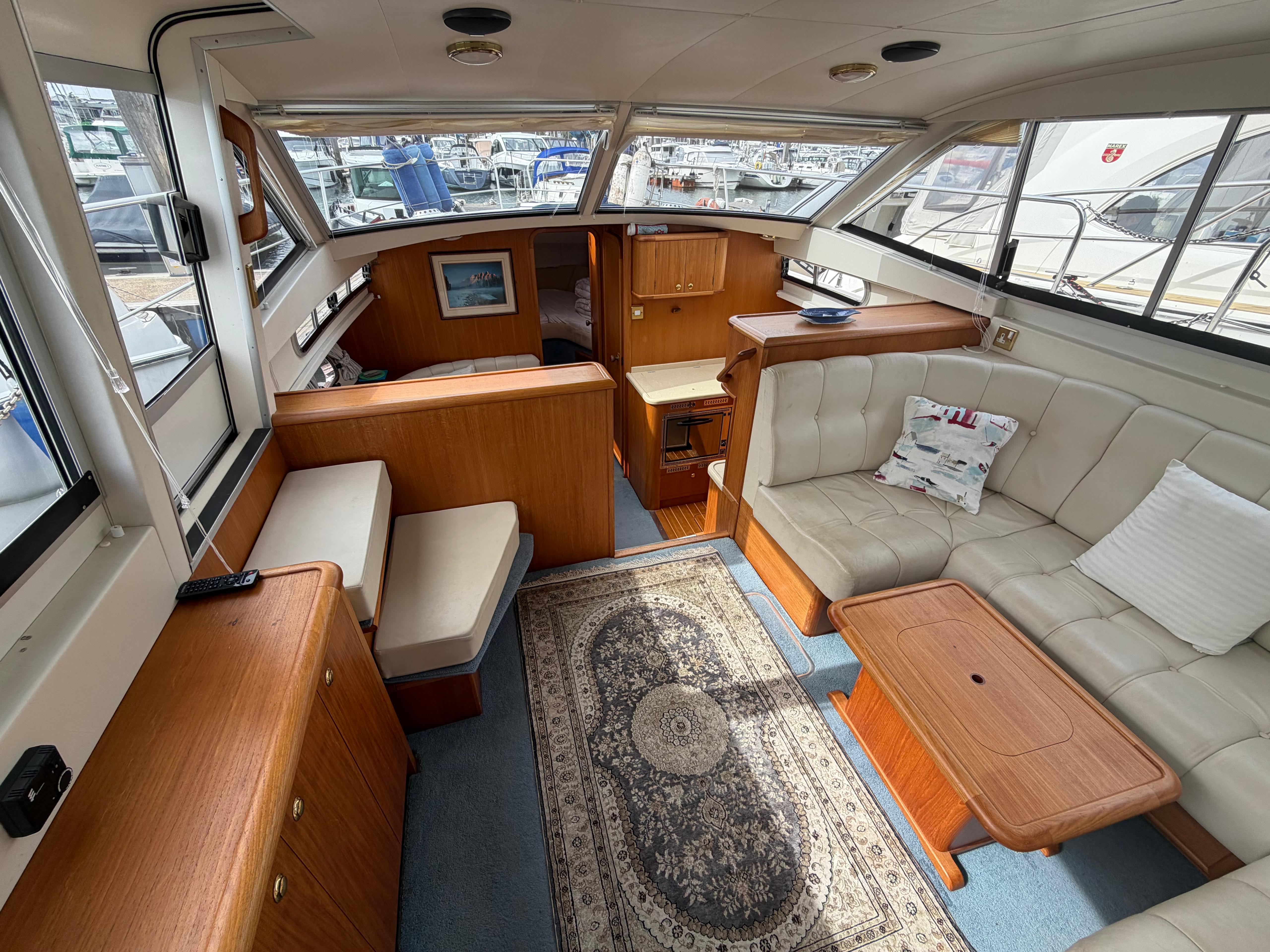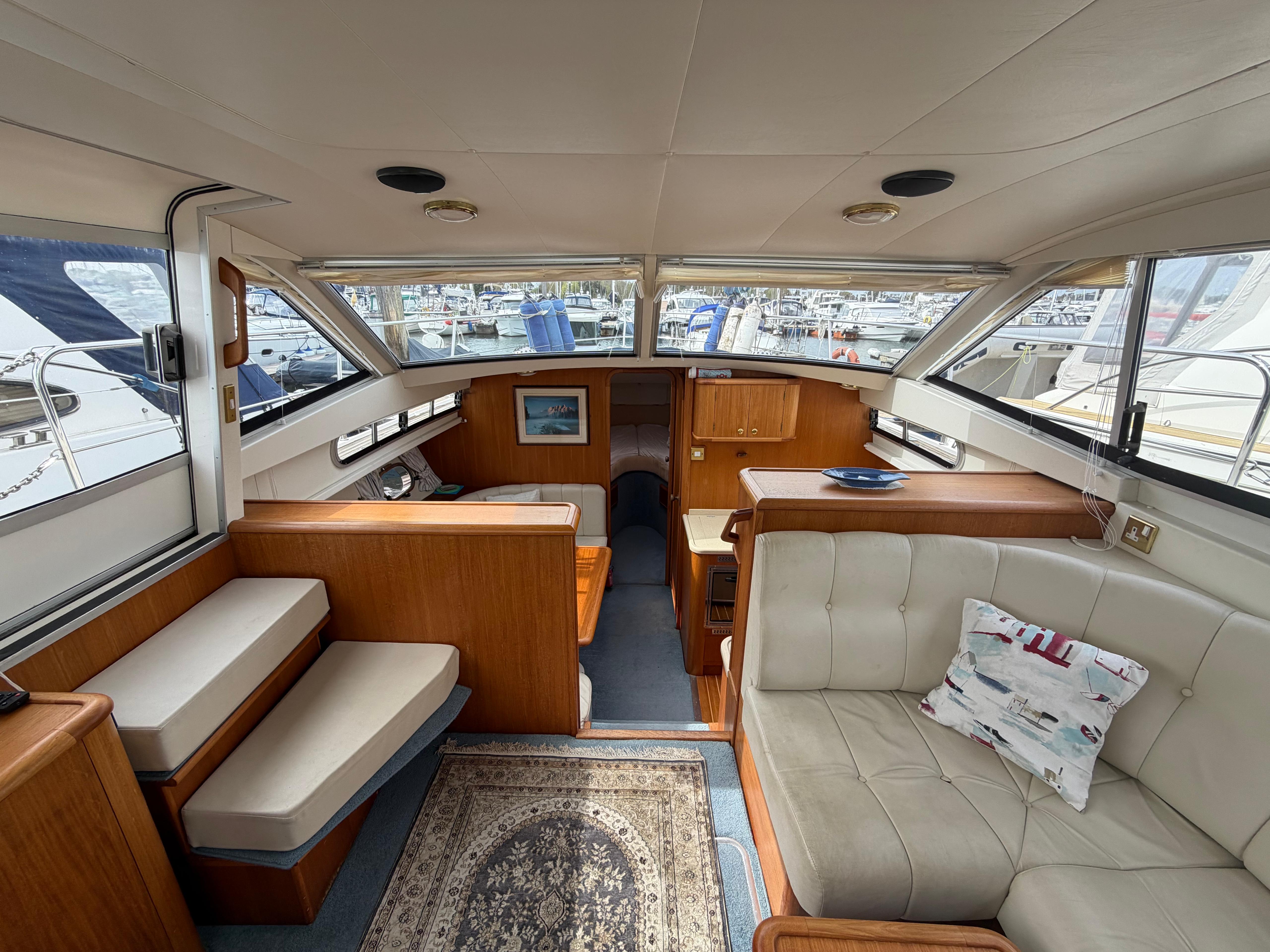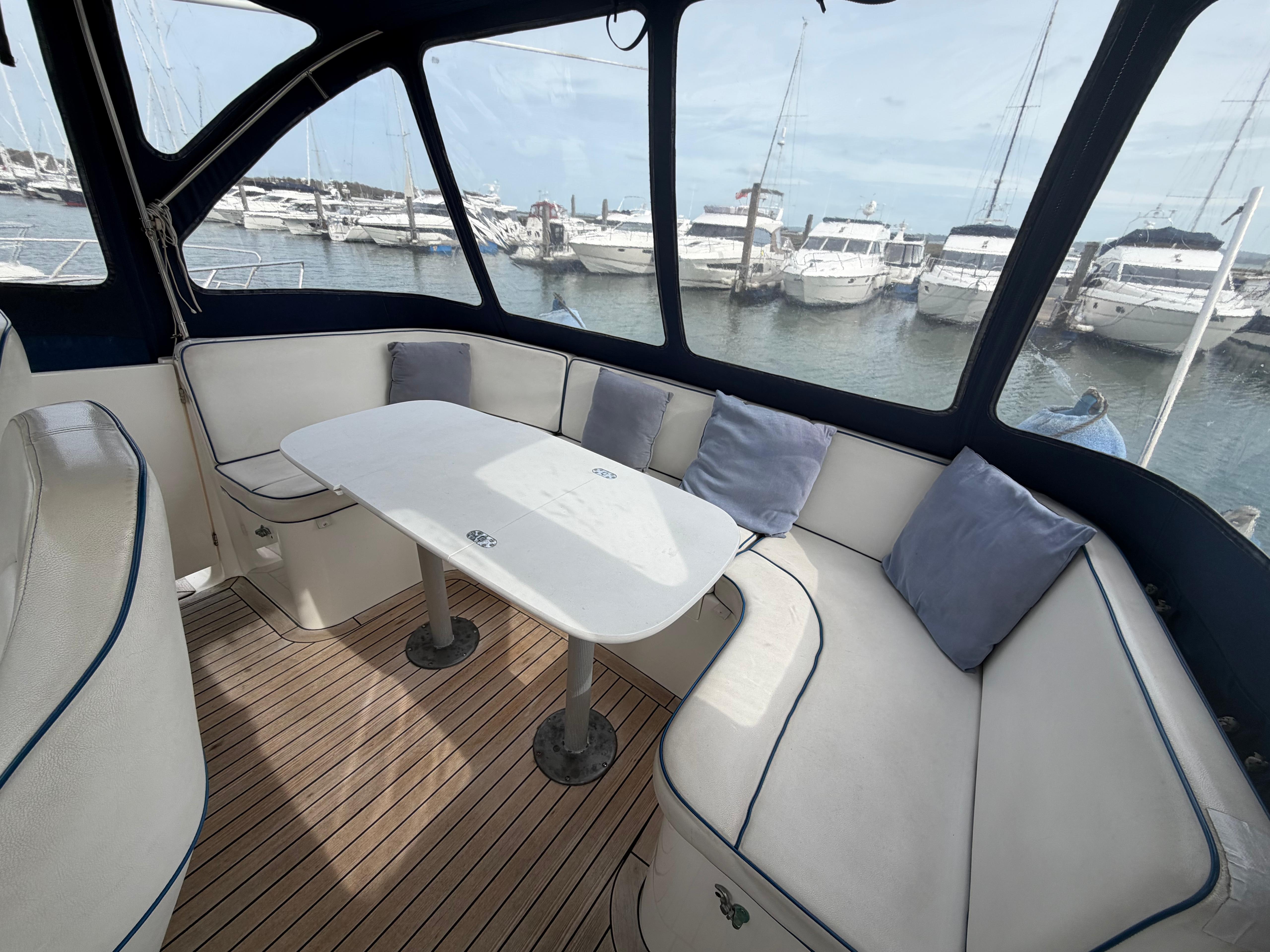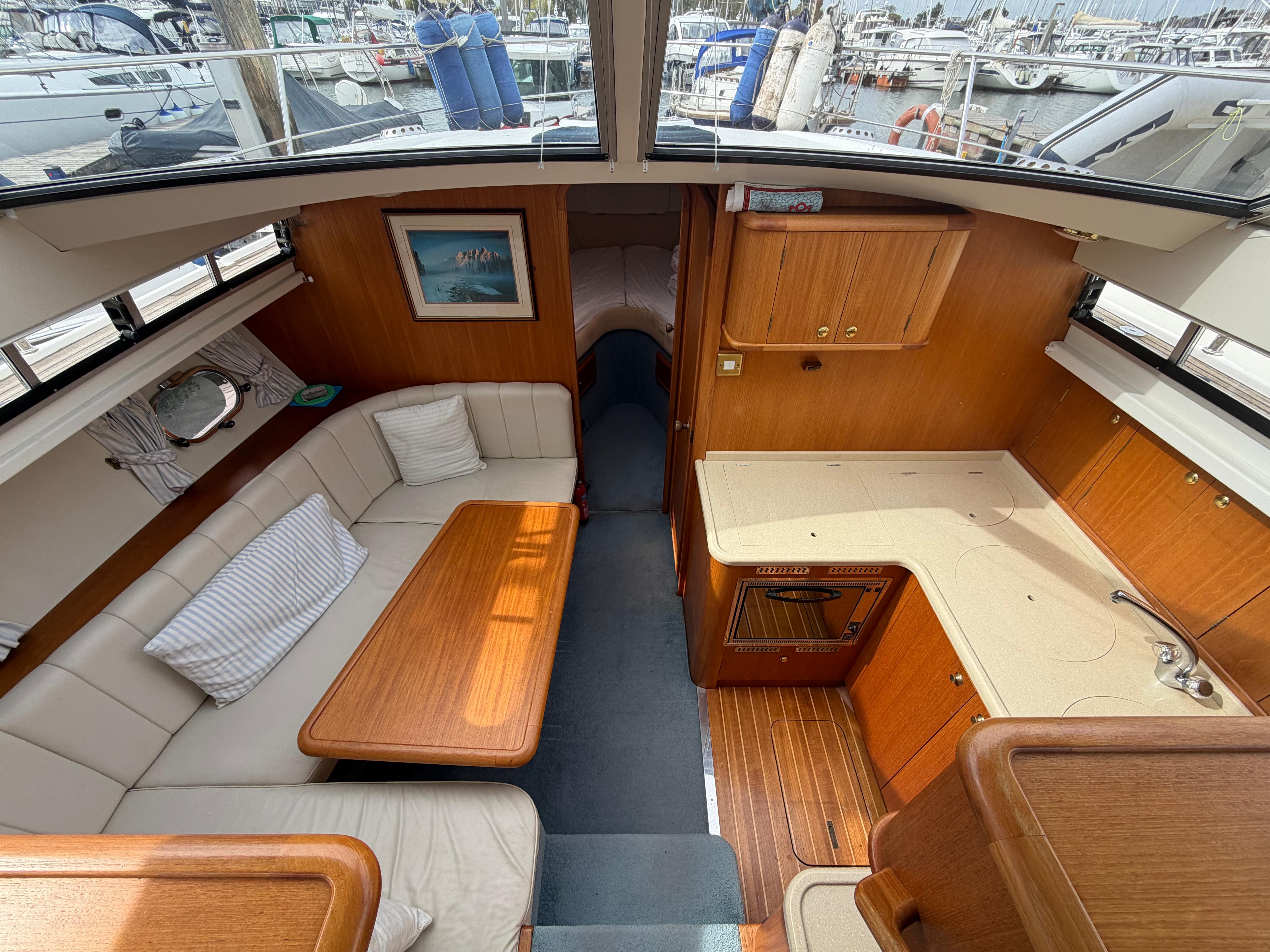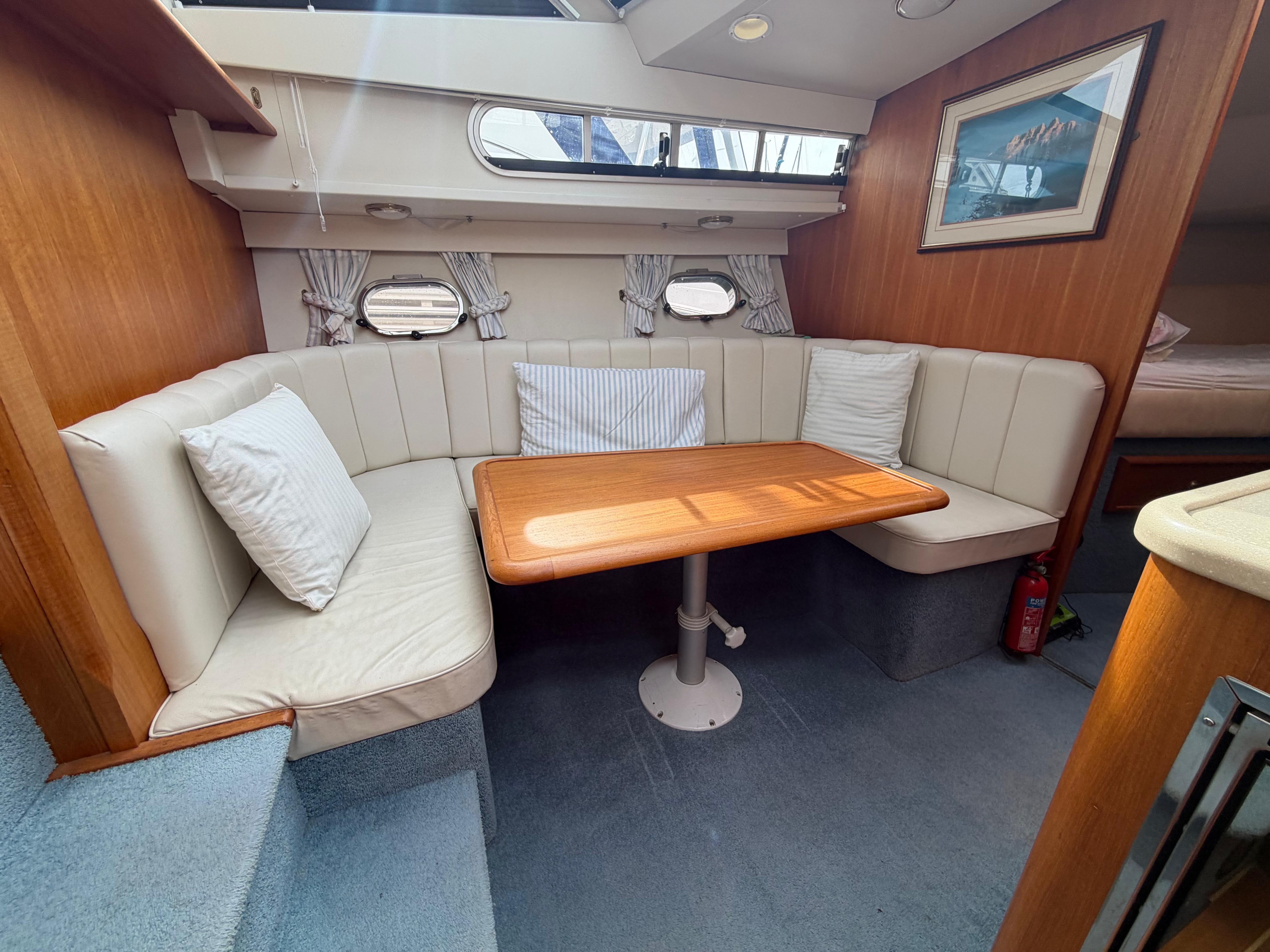 Dinette to port, U-Shaped seating with infill for double berth conversion around large lowering table