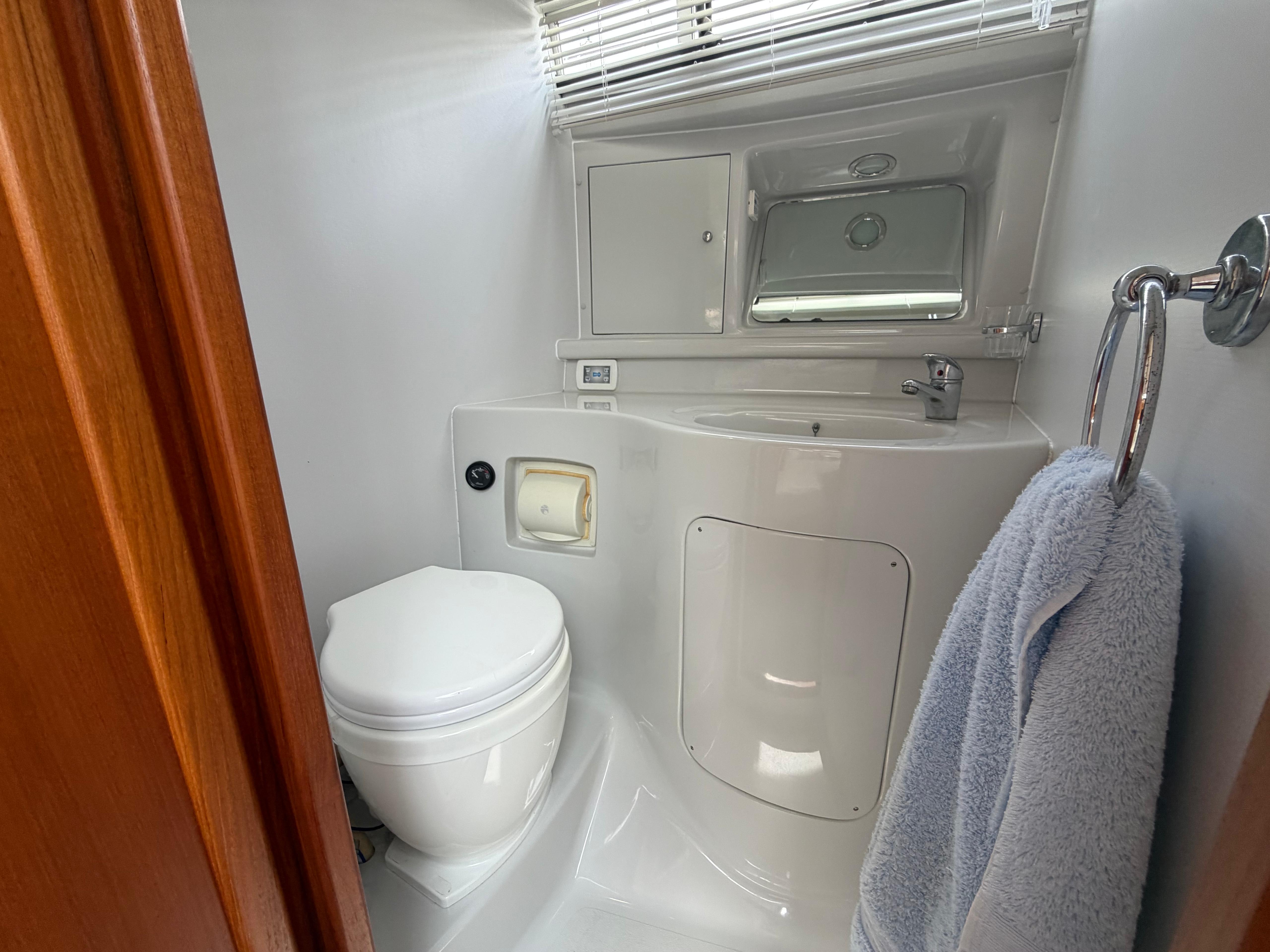 En-suite electric heads to port, wash basin with mixer tap and separate shower compartment to starboard