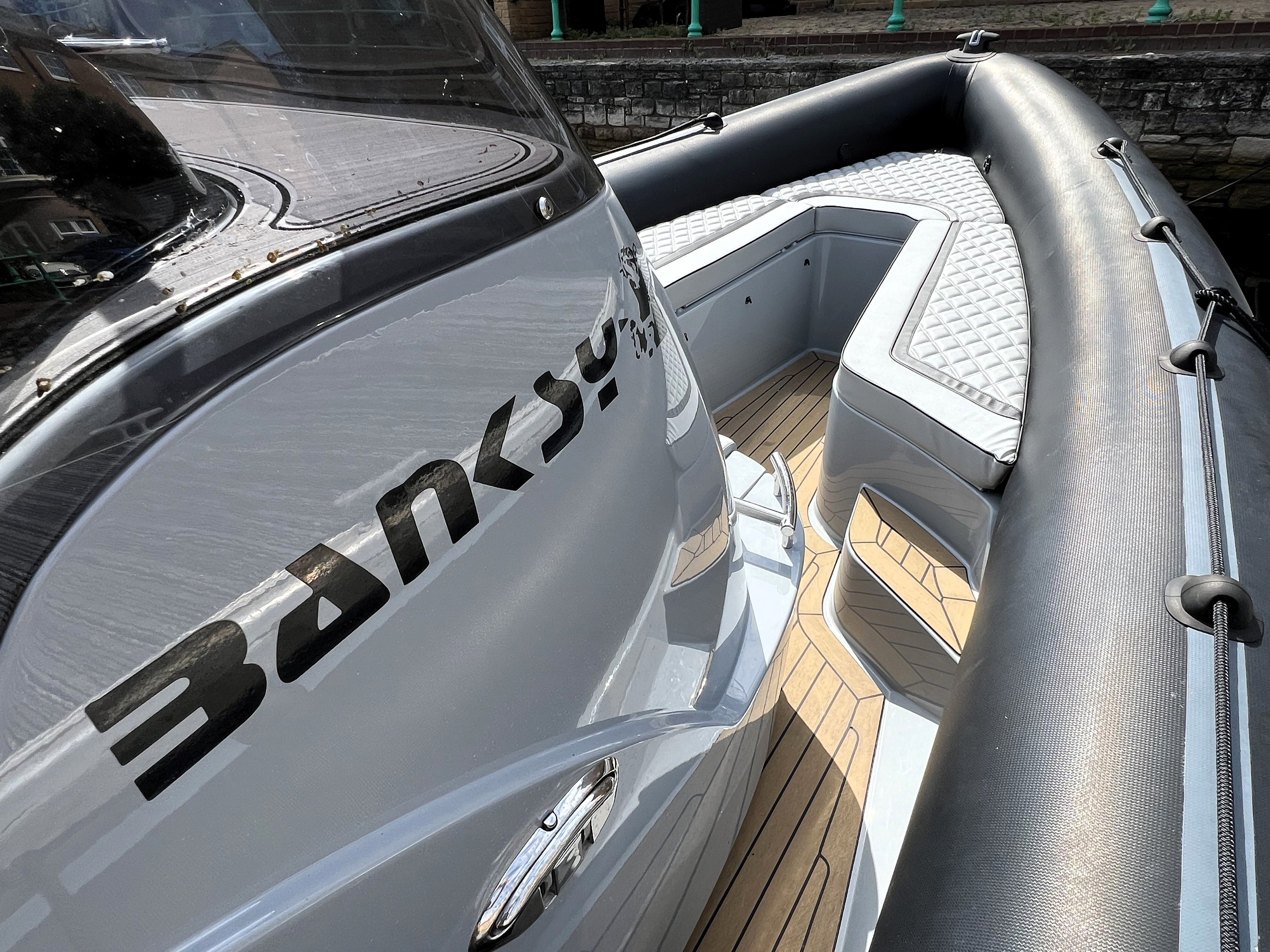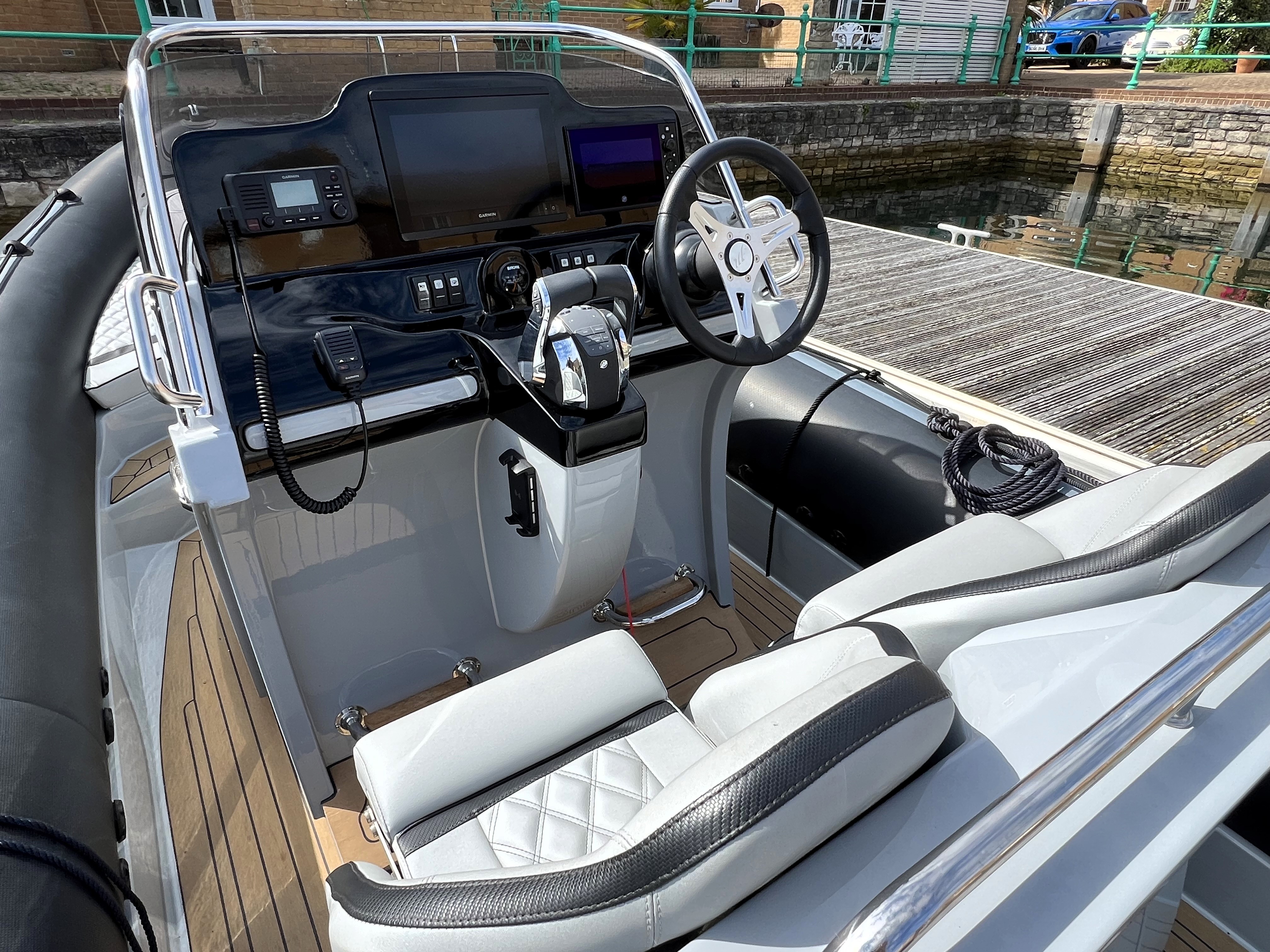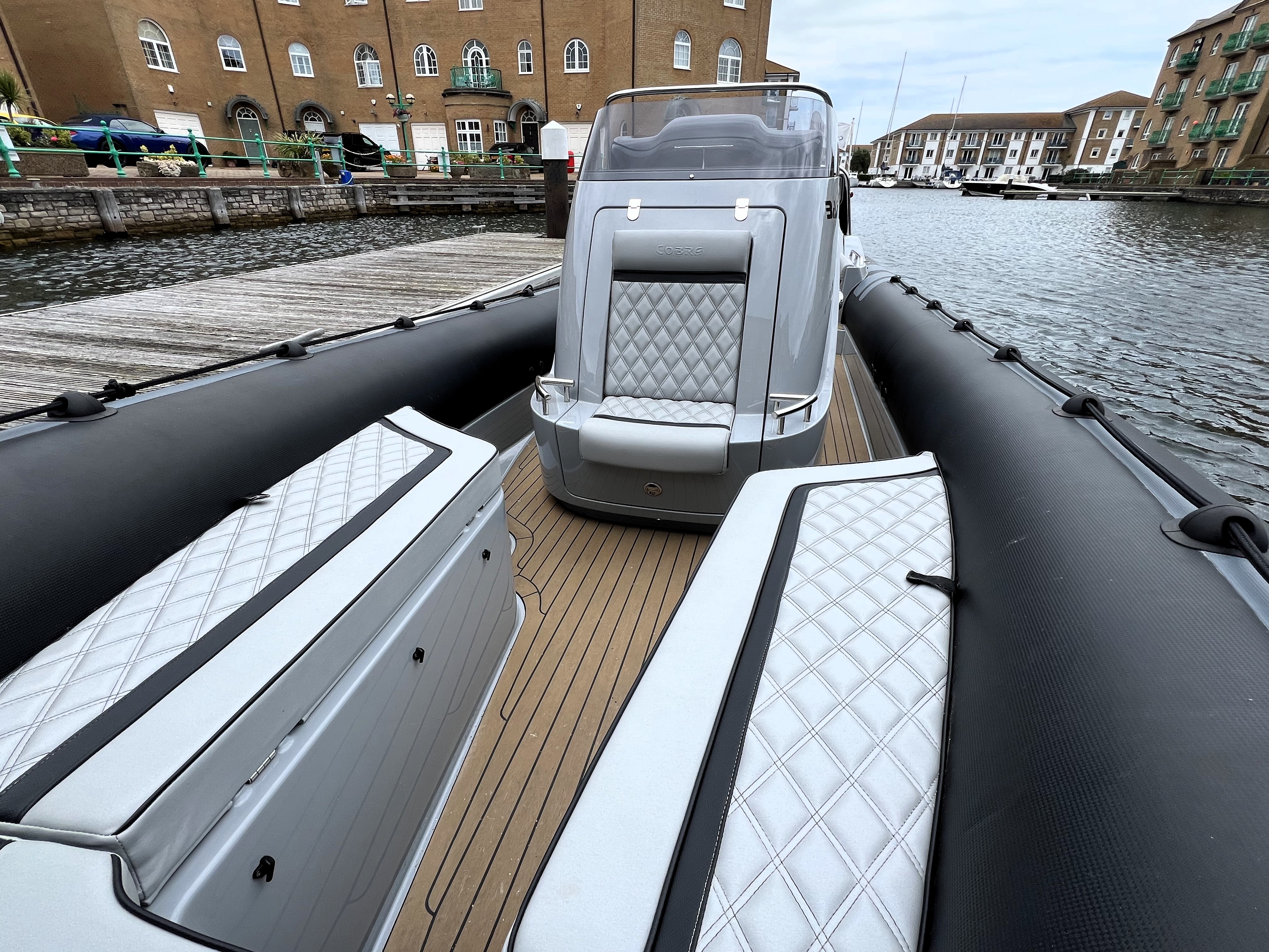 One owner from new. 2023 launch, '22 model; Cobra Nautique 8.7m fitted with Twin Mercury 225hp V6 Outboards. Speeds up to 50 knots and handling only expected from Cobra! Stylish finishings such as Black Carbon Hypalon tubes, grey grp and black accents, she is sure to stand out from the crowd. 'Banksy' is packed full of extras with suppression seats, 12" Garmin plotter, AIS, wireless phone charging, low hours and just serviced ready for the season. We highly recommend a viewing of this performance vessel. Ashore, stored inside for winter on new twin axle SBS trailer.