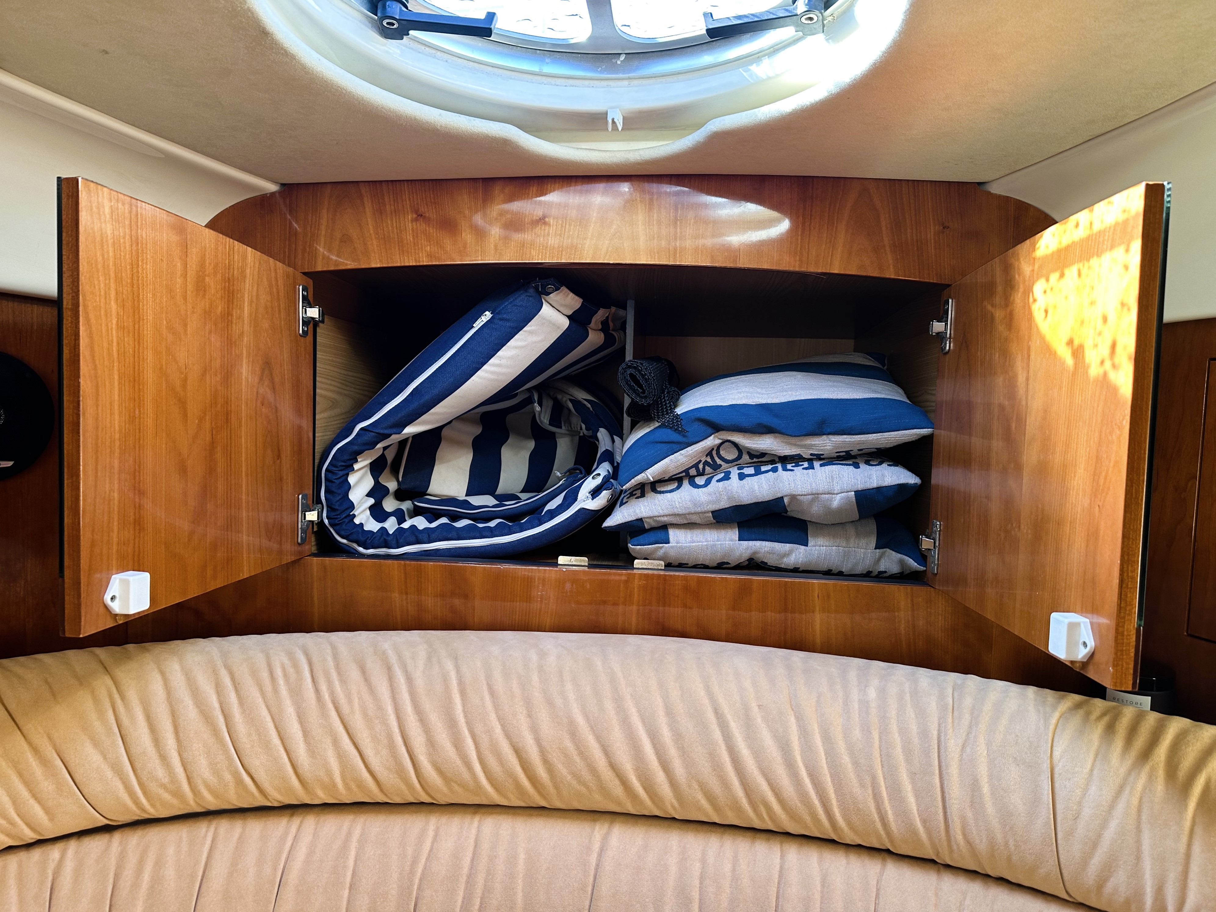 Double berth in mid-cabin under cockpit, storage lockers, additional storage under berth, 2x opening portlights.