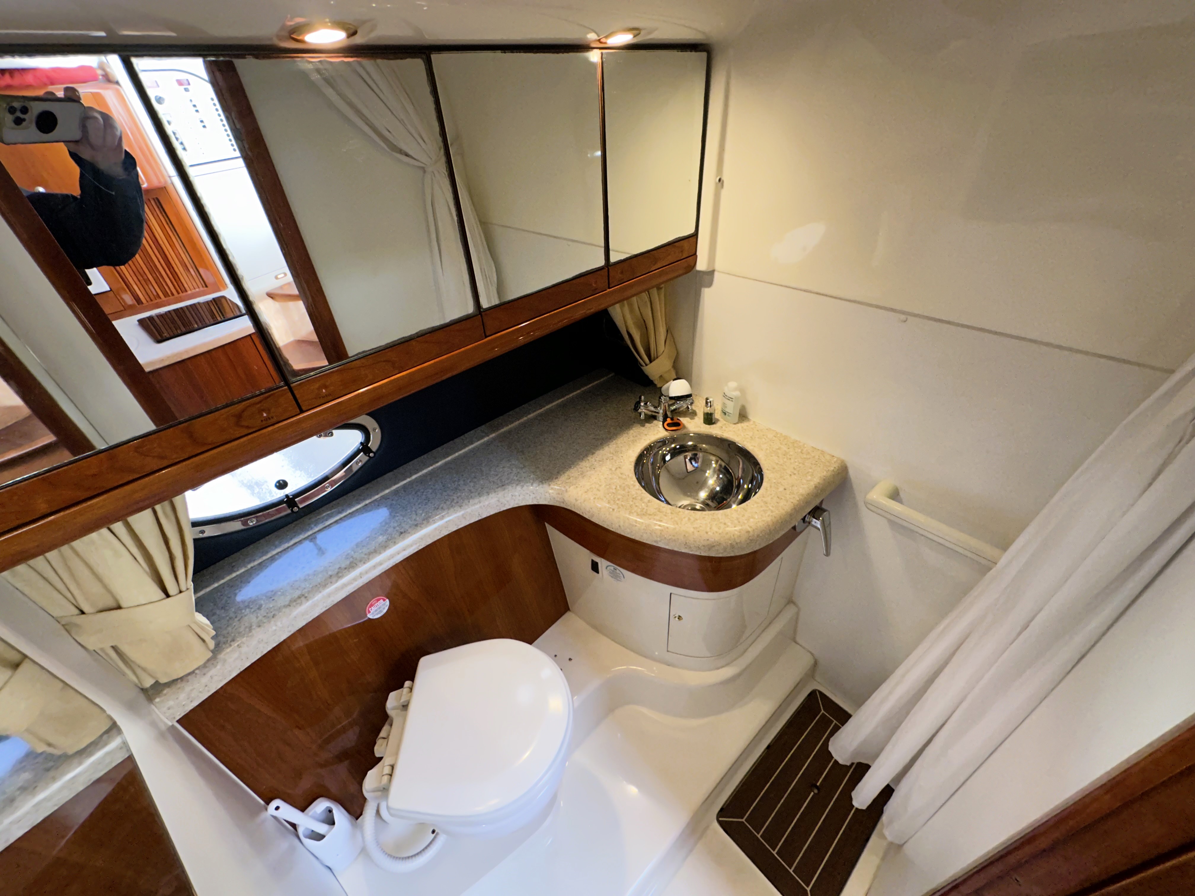 Heads compartment with electric marine WC, shower with mixer, curtain, stainless-steel sink, mirror-fronted storage cupboards, opening portlight.