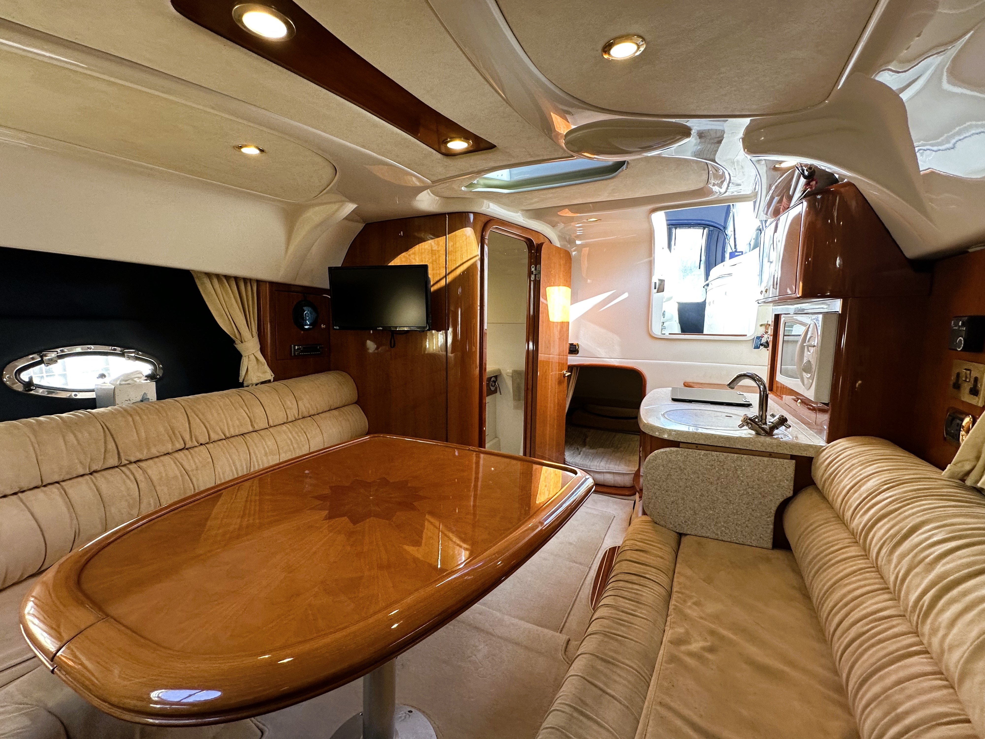 Saloon with U-shaped seating area forward (converts to double berth), height adjustable table, storage cupboards, large storage locker forward with mirror-fronted doors, 2x opening portlights, opening hatch.