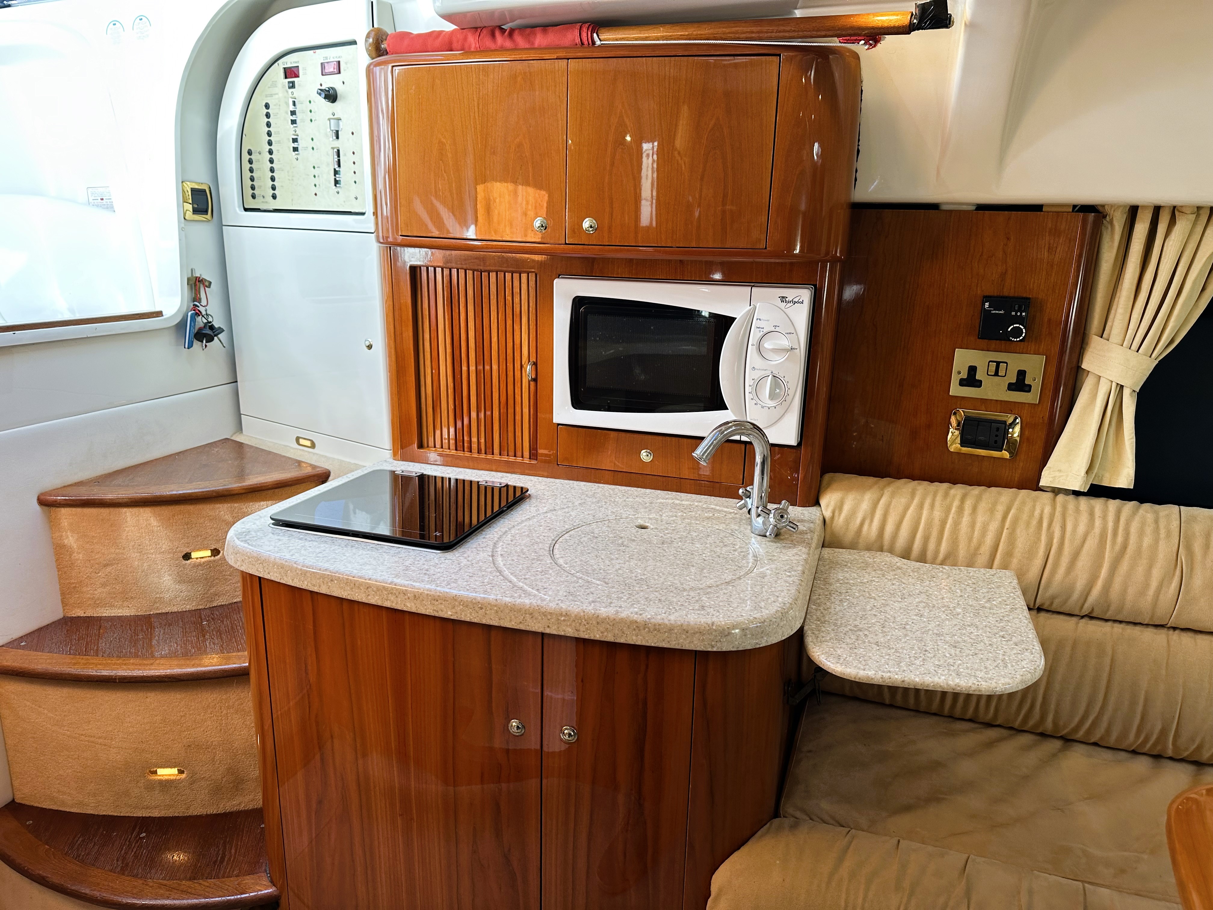 Galley with Corian worktop, Kenyon spirit cooker/stove, Isotherm fridge with icebox, Whirlpool microwave, stainless-steel sink with mixer tap.