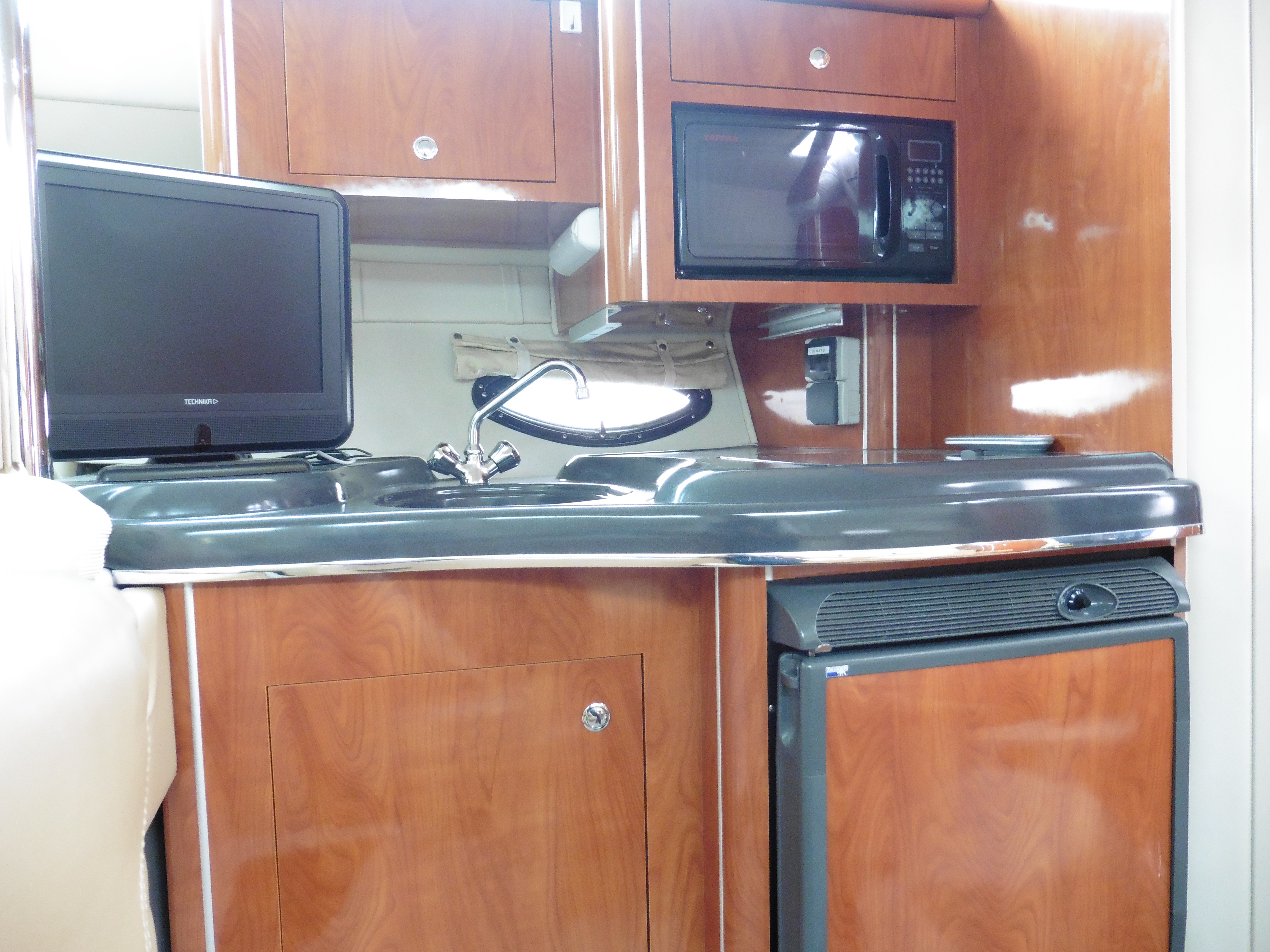 The galley area is to starboard and equipped with a sink, hob, microwave and new refrigerator fitted June 2025