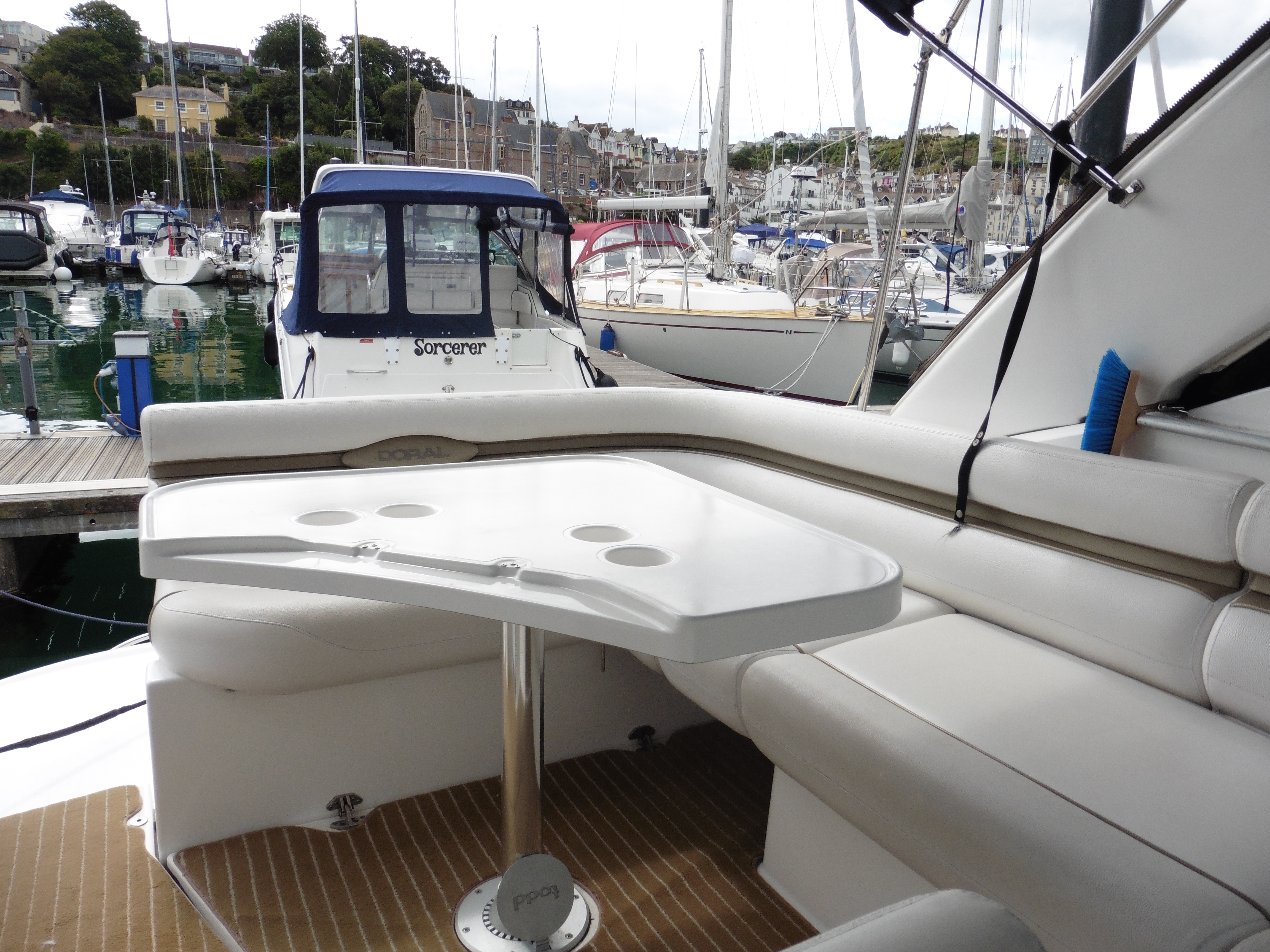 Aft Cockpit with large L-shaped seating to port, helm position to starboard and port bench seat forward
