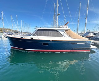 'Dolly' was comprehensively specified at new by an experienced yachtsman – so she sports the smooth-running, powerful twin Yanmar 8LV320HP engines, a Seakeeper gyro stabiliser and stern and bow thrusters for effortless cruising performance, Delightfully styled, with a timeless feel, blending selected oak joinery, teak and holly flooring with intricately executed leather upholstery and this quality is evident everywhere, from her neat wiring runs to her exceptionally clean and accessible engine bay. This is an exceptional opportunity to purchase this lightly used, stunning example of the beautiful Duchy 35 motor launch with an excellent specification including Heating, Electric Sunroof plus a comprehensive Raymarine electronics and navigational package. Stylishly finished with her navy hull, varnished transom, varnished cockpit doors and light leather and oak interior. She has a spacious galley and a large and light saloon. She has been lovingly maintained to an exceptional standard and viewing is highly recommended.