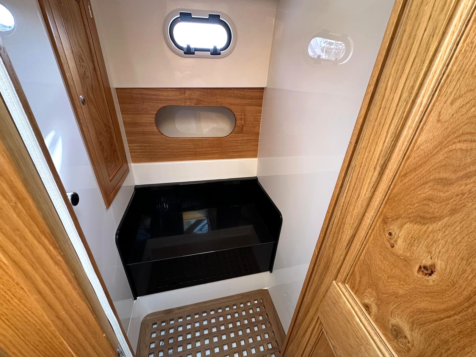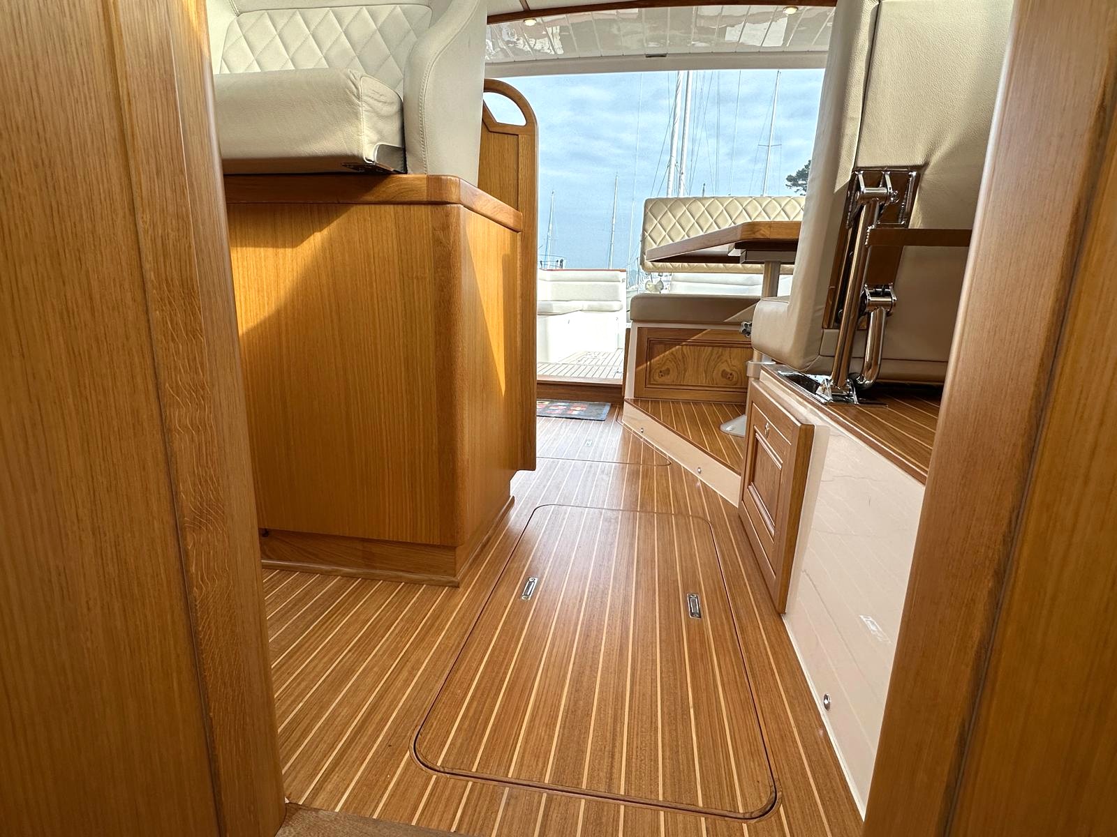 Hatch located forward in the saloon, between the two helm seats, giving access to a large storage area and to systems located under the helm seat on starboard. These systems include the black water tank, pumps and the DC distribution system.