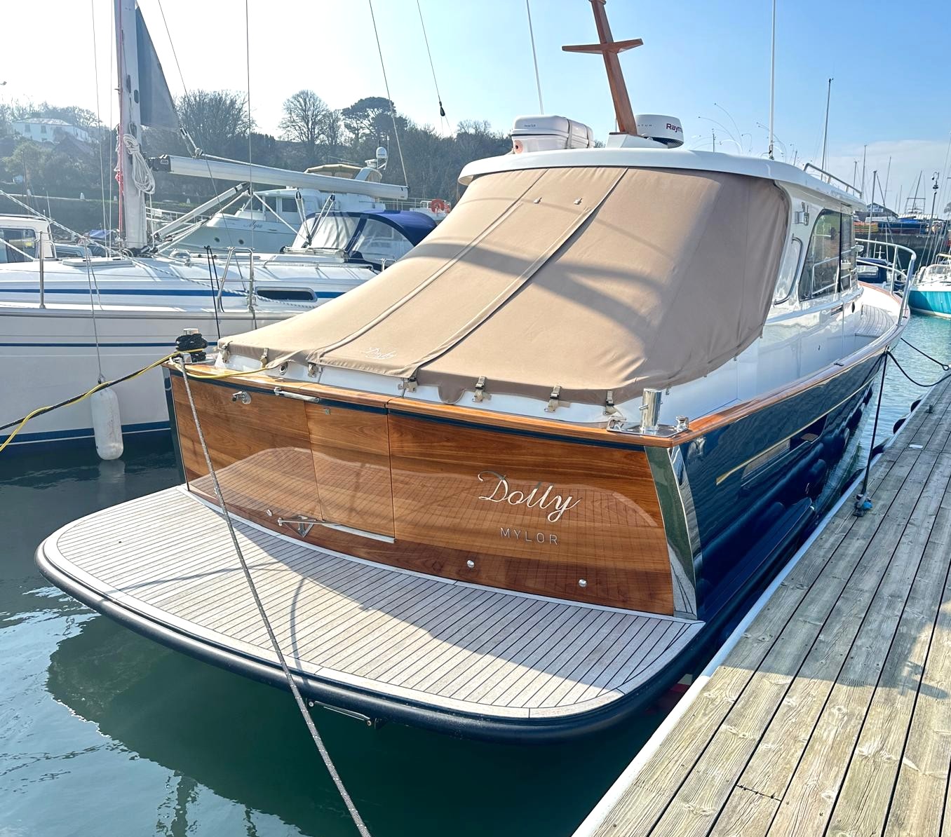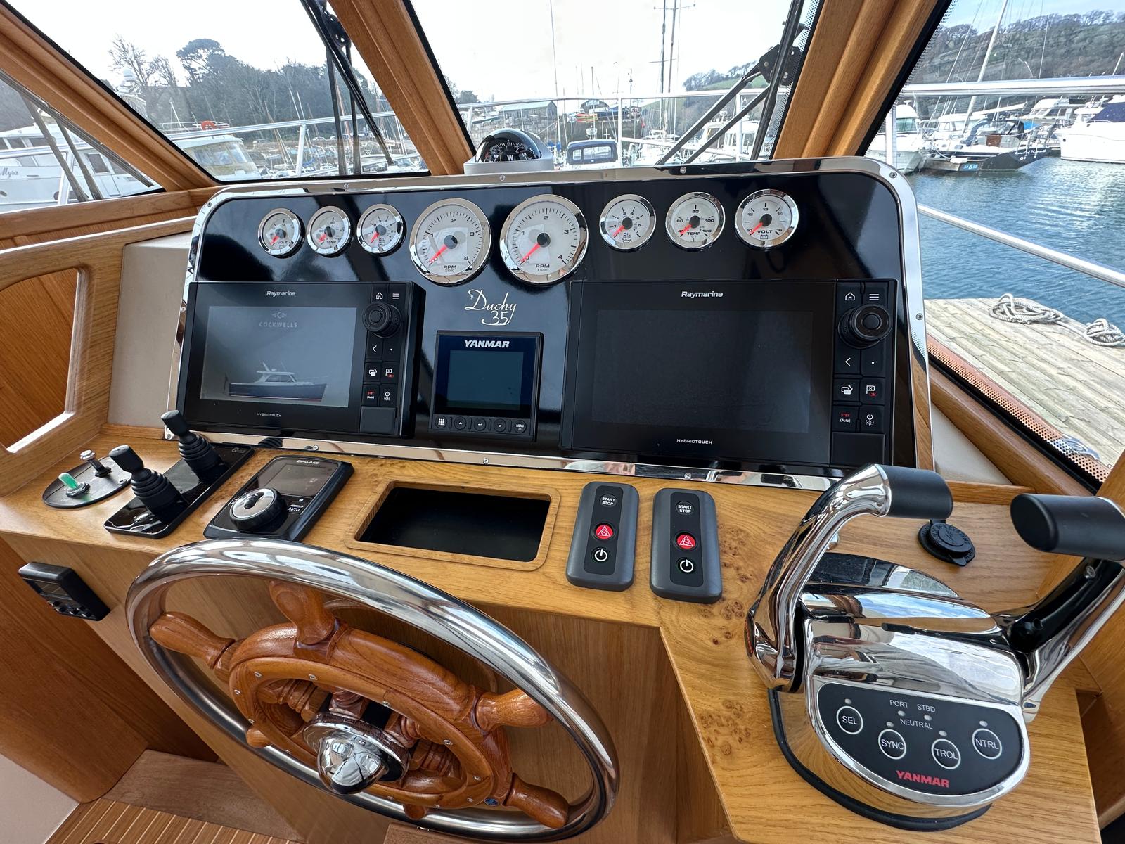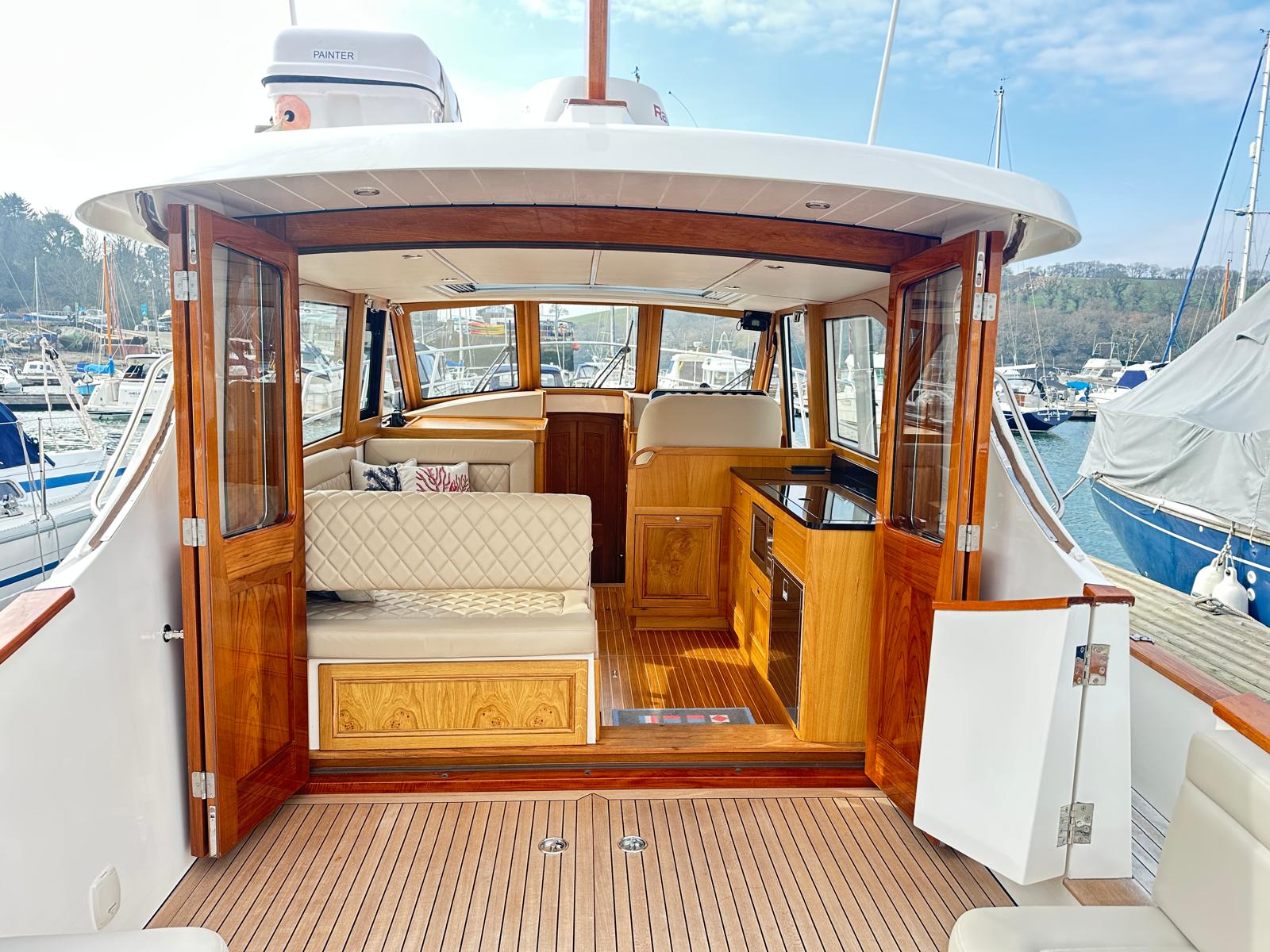 'Dolly' was comprehensively specified at new by an experienced yachtsman – so she sports the smooth-running, powerful twin Yanmar 8LV320HP engines, a Seakeeper gyro stabiliser and stern and bow thrusters for effortless cruising performance, Delightfully styled, with a timeless feel, blending selected oak joinery, teak and holly flooring with intricately executed leather upholstery and this quality is evident everywhere, from her neat wiring runs to her exceptionally clean and accessible engine bay. This is an exceptional opportunity to purchase this lightly used, stunning example of the beautiful Duchy 35 motor launch with an excellent specification including Heating, Electric Sunroof plus a comprehensive Raymarine electronics and navigational package. Stylishly finished with her navy hull, varnished transom, varnished cockpit doors and light leather and oak interior. She has a spacious galley and a large and light saloon. She has been lovingly maintained to an exceptional standard and viewing is highly recommended.