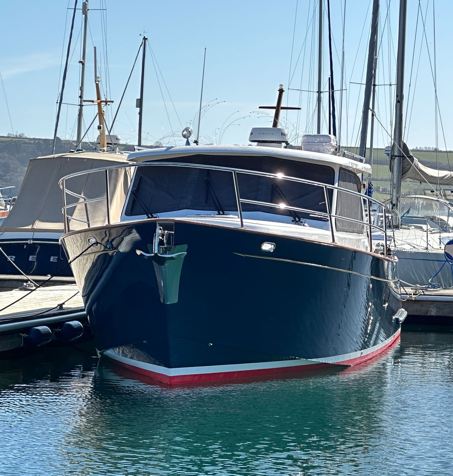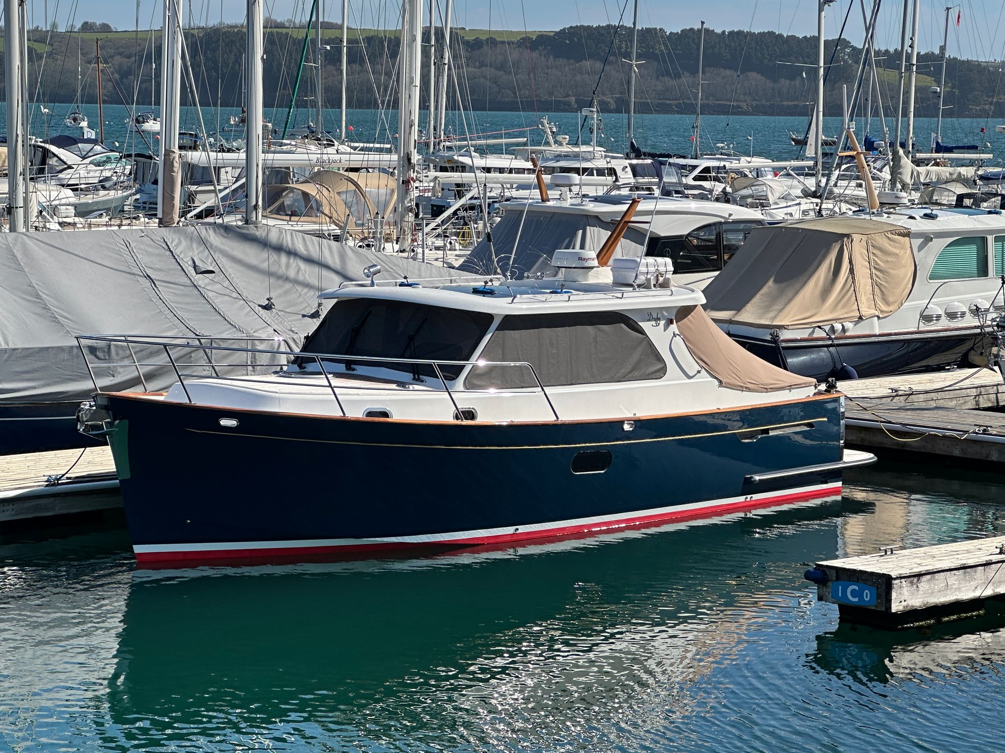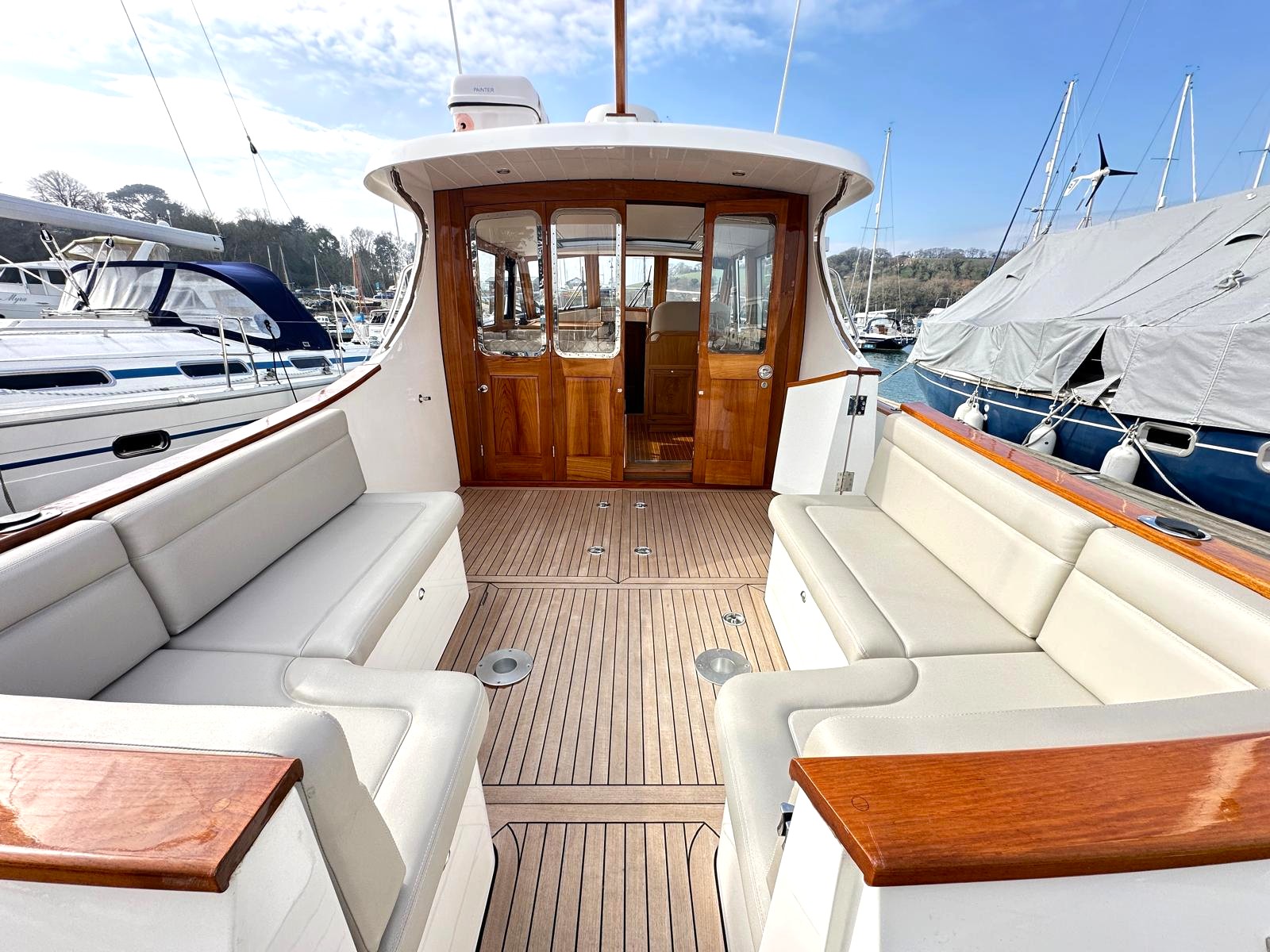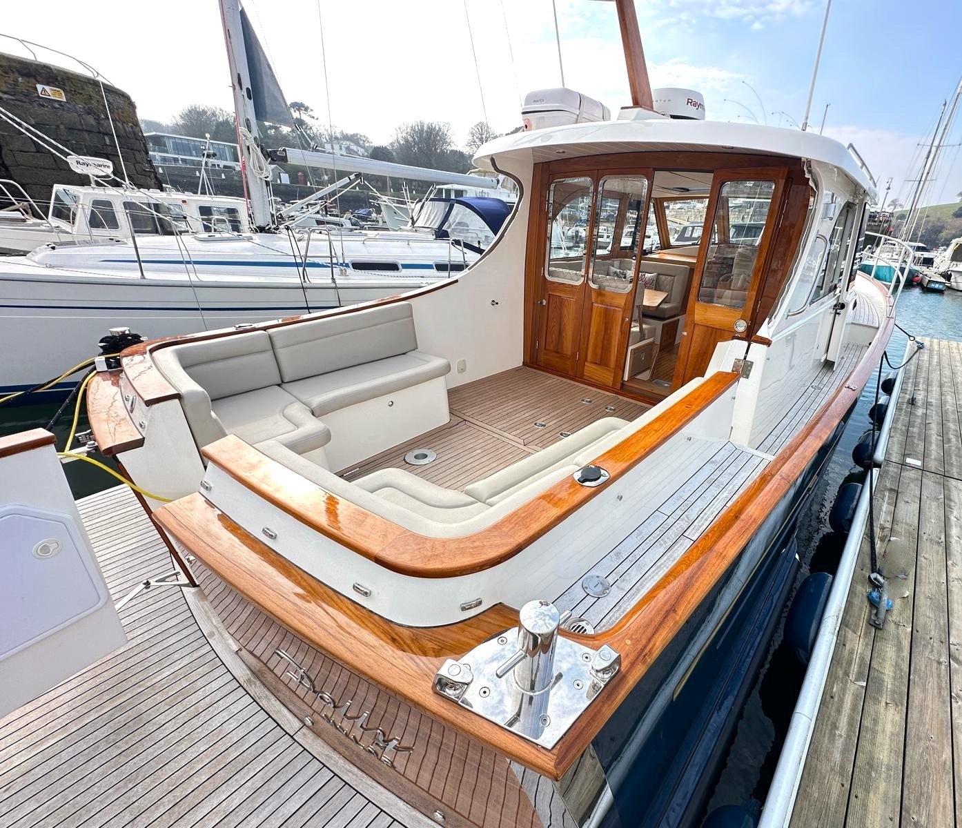 'Dolly' was comprehensively specified at new by an experienced yachtsman – so she sports the smooth-running, powerful twin Yanmar 8LV320HP engines, a Seakeeper gyro stabiliser and stern and bow thrusters for effortless cruising performance, Delightfully styled, with a timeless feel, blending selected oak joinery, teak and holly flooring with intricately executed leather upholstery and this quality is evident everywhere, from her neat wiring runs to her exceptionally clean and accessible engine bay. This is an exceptional opportunity to purchase this lightly used, stunning example of the beautiful Duchy 35 motor launch with an excellent specification including Heating, Electric Sunroof plus a comprehensive Raymarine electronics and navigational package. Stylishly finished with her navy hull, varnished transom, varnished cockpit doors and light leather and oak interior. She has a spacious galley and a large and light saloon. She has been lovingly maintained to an exceptional standard and viewing is highly recommended.