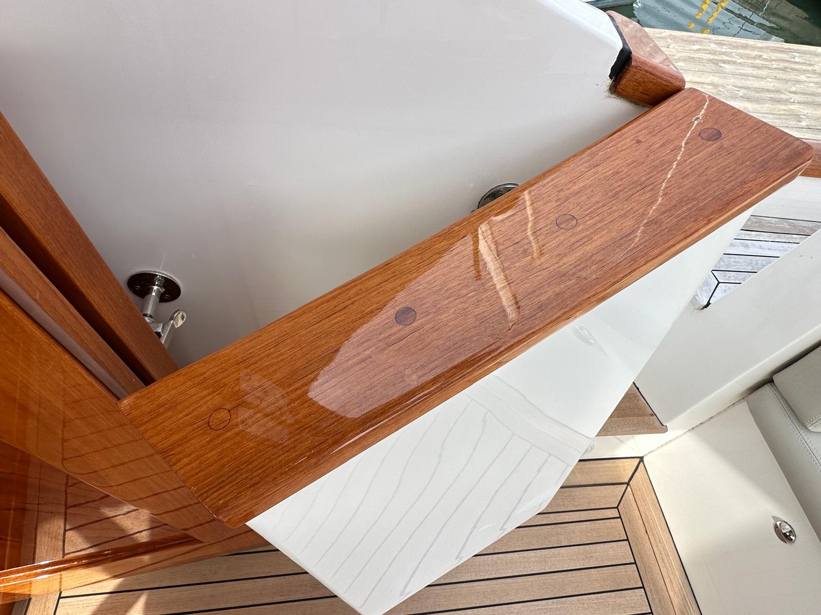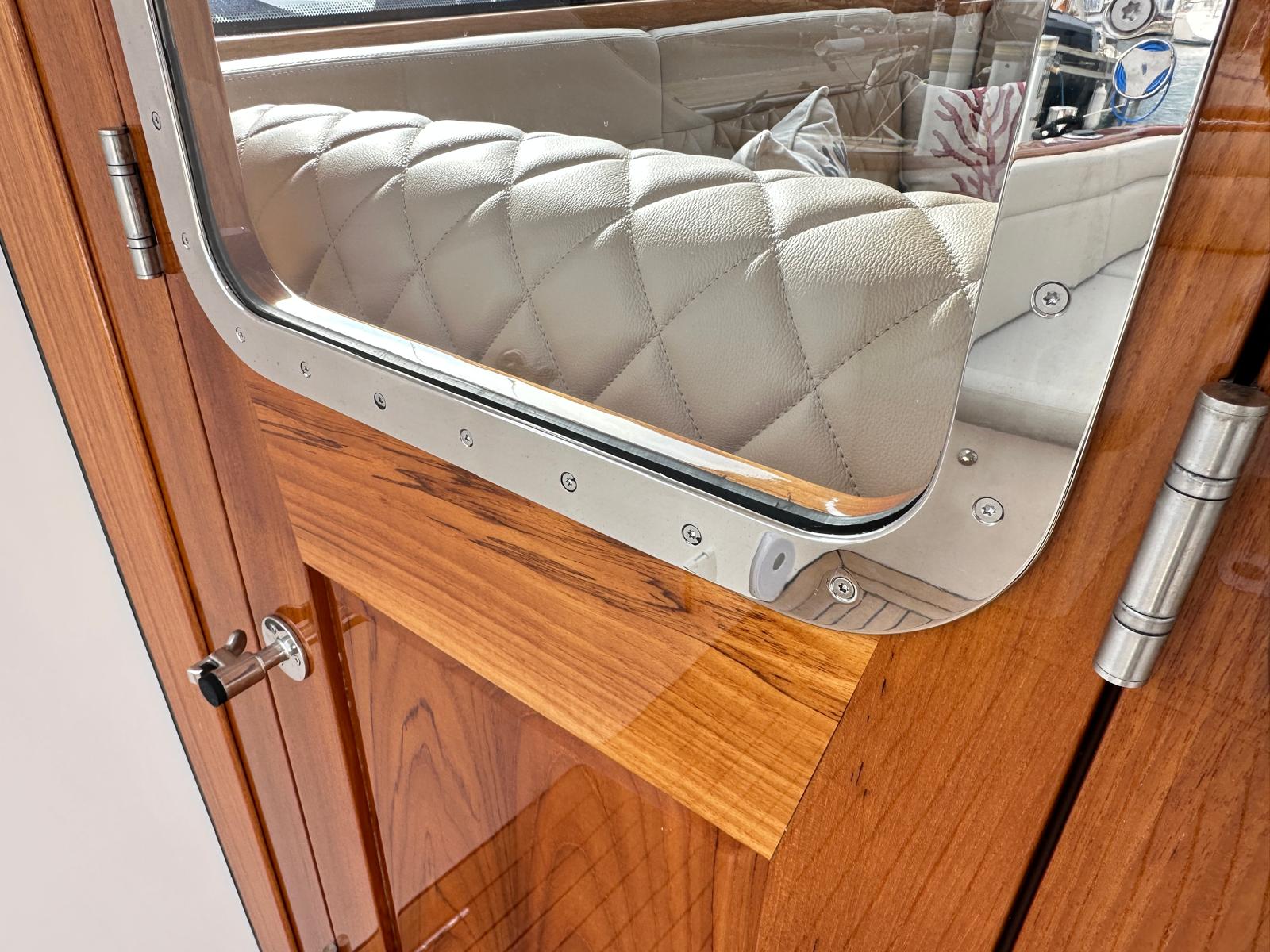 On the starboard side of the helm console, a helm door gives access to the side decks