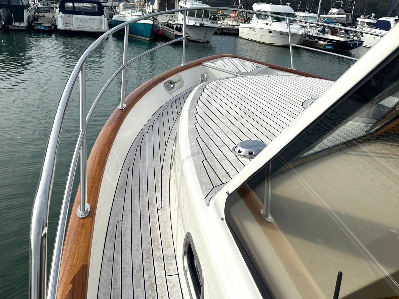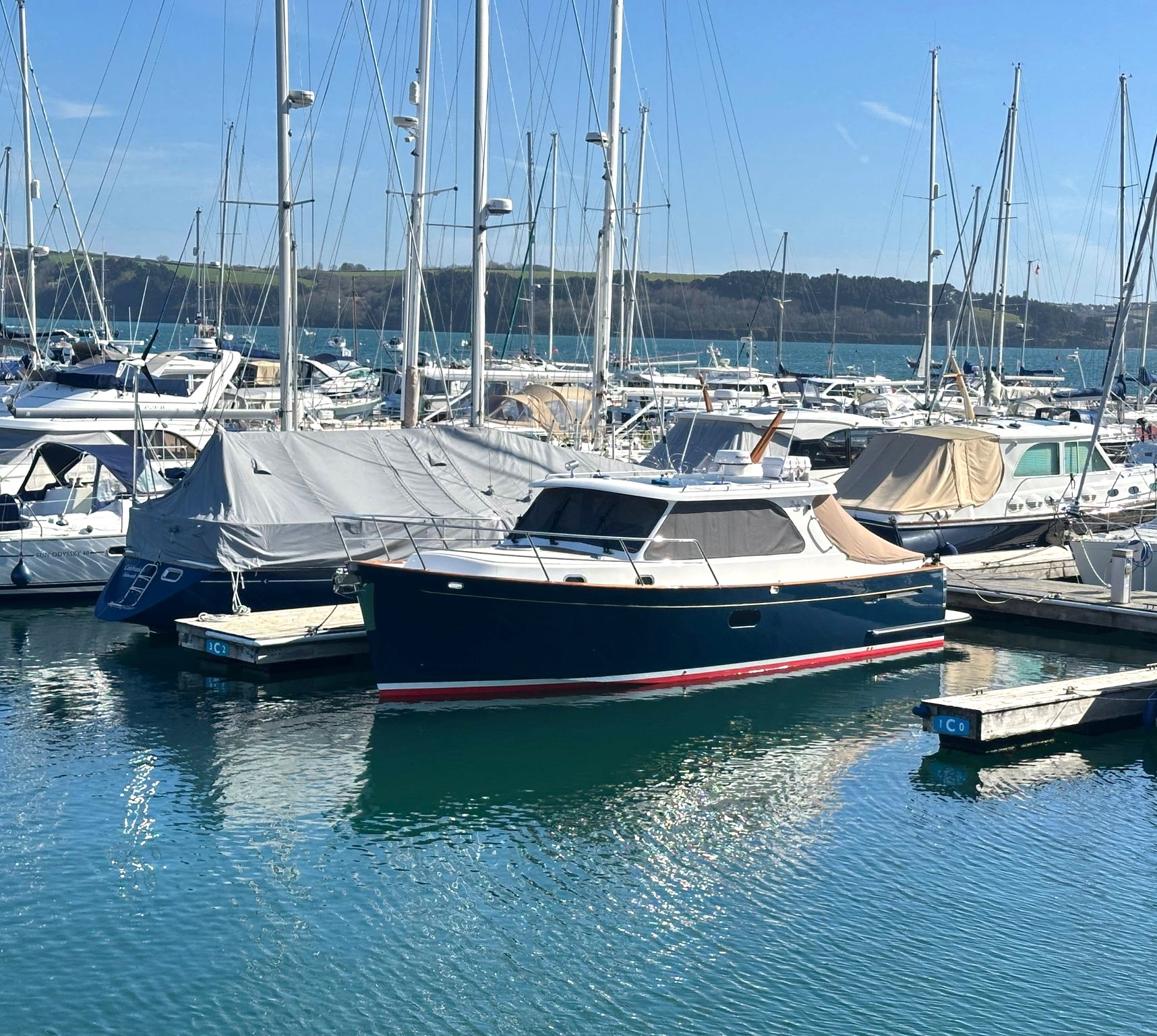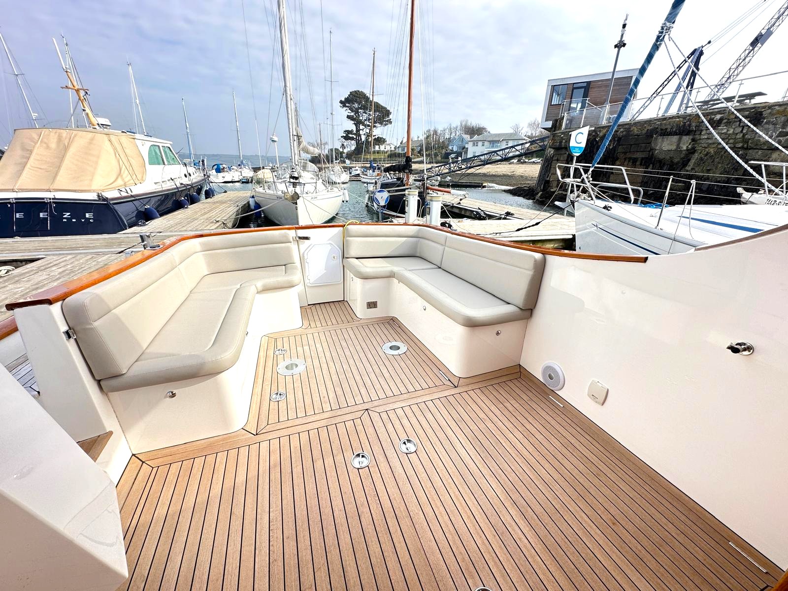 She is located within just a mile of the 'Cockwells' factory in Mylor Yacht Harbour where she was built, giving the unique and perfect option for her owners to have the factory maintain and service her from New, in addition to a professional cleaning schedule whether ashore or on her pontoon berth, Cockwells are also to hand to help and advise buyers during the purchase.