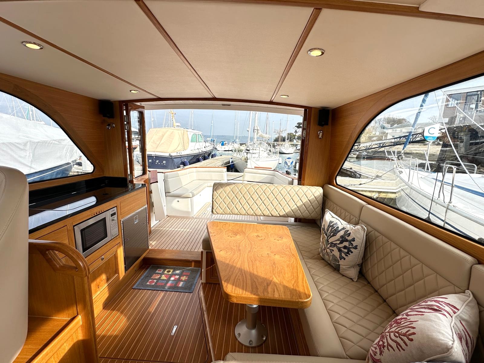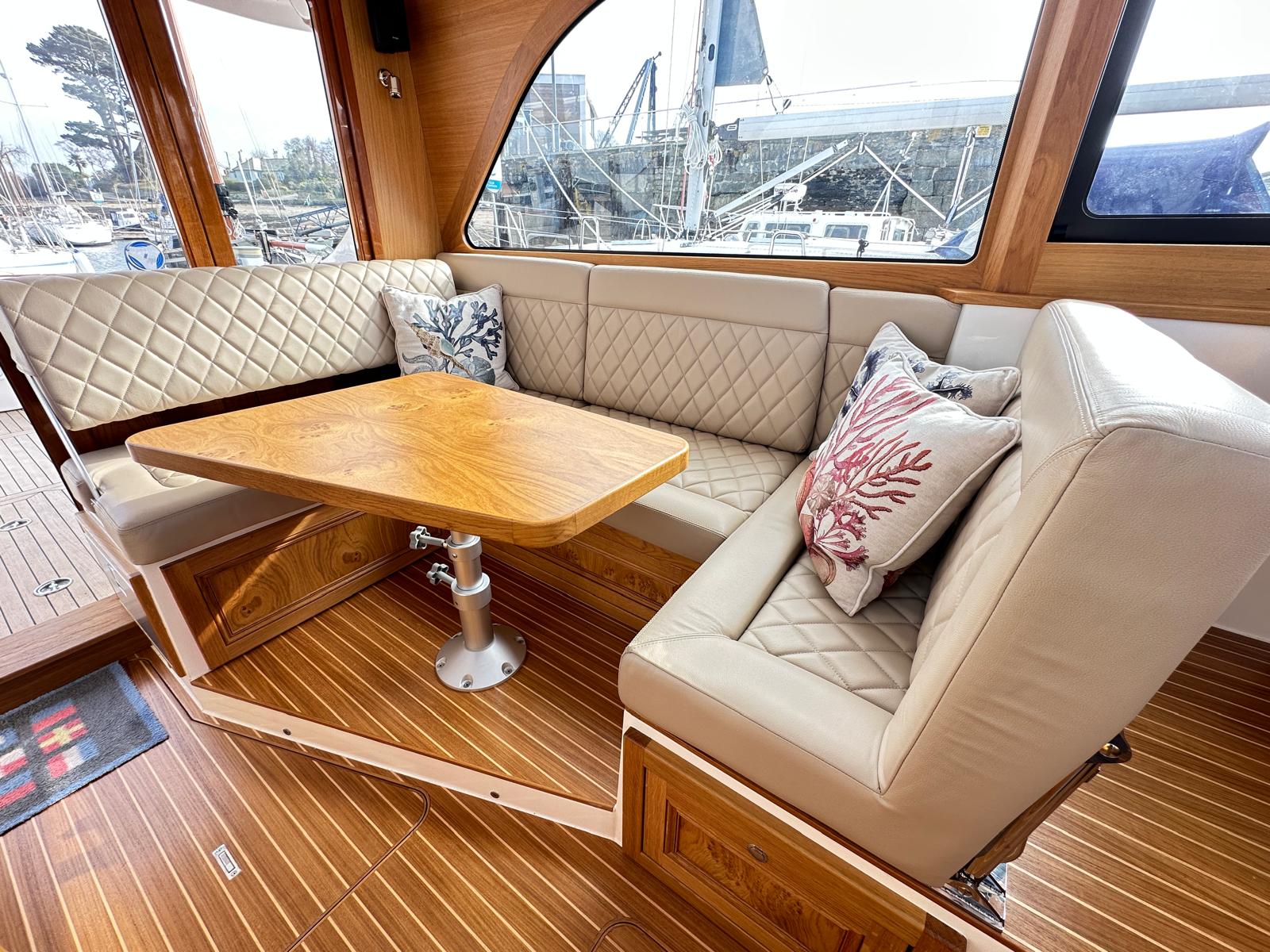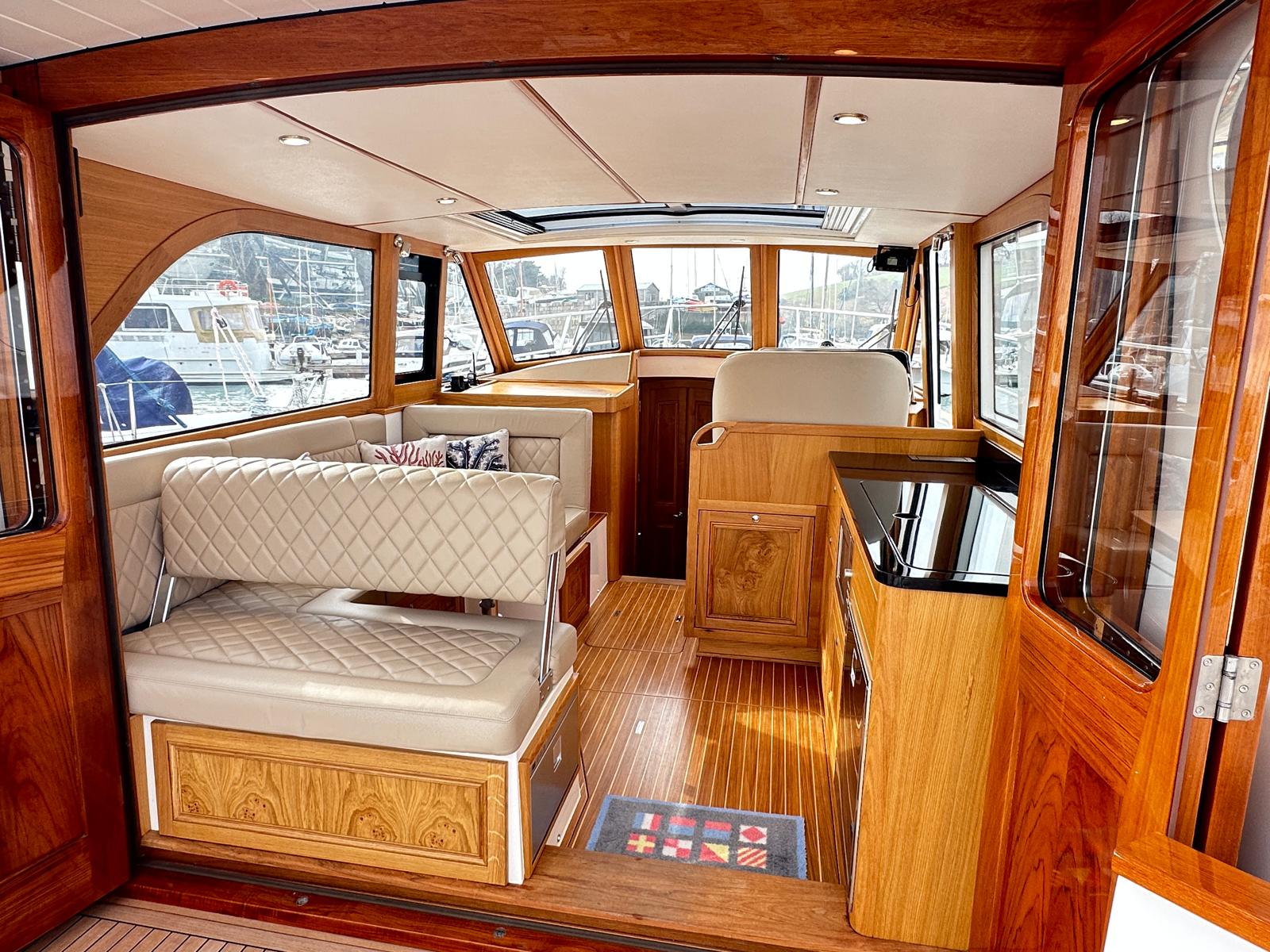 The spacious saloon includes a fully equipped galley above deck. As you relax, the full-width electric sunroof opens, allowing sunlight to flood the space, while panoramic sea views surround you through all-round windows.