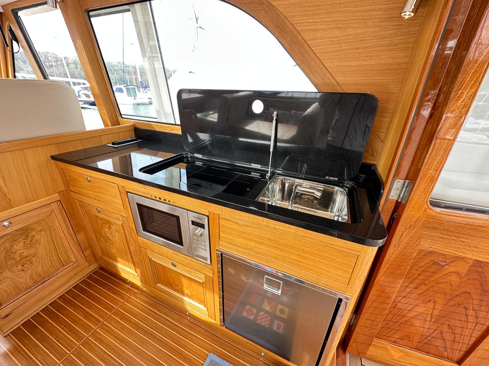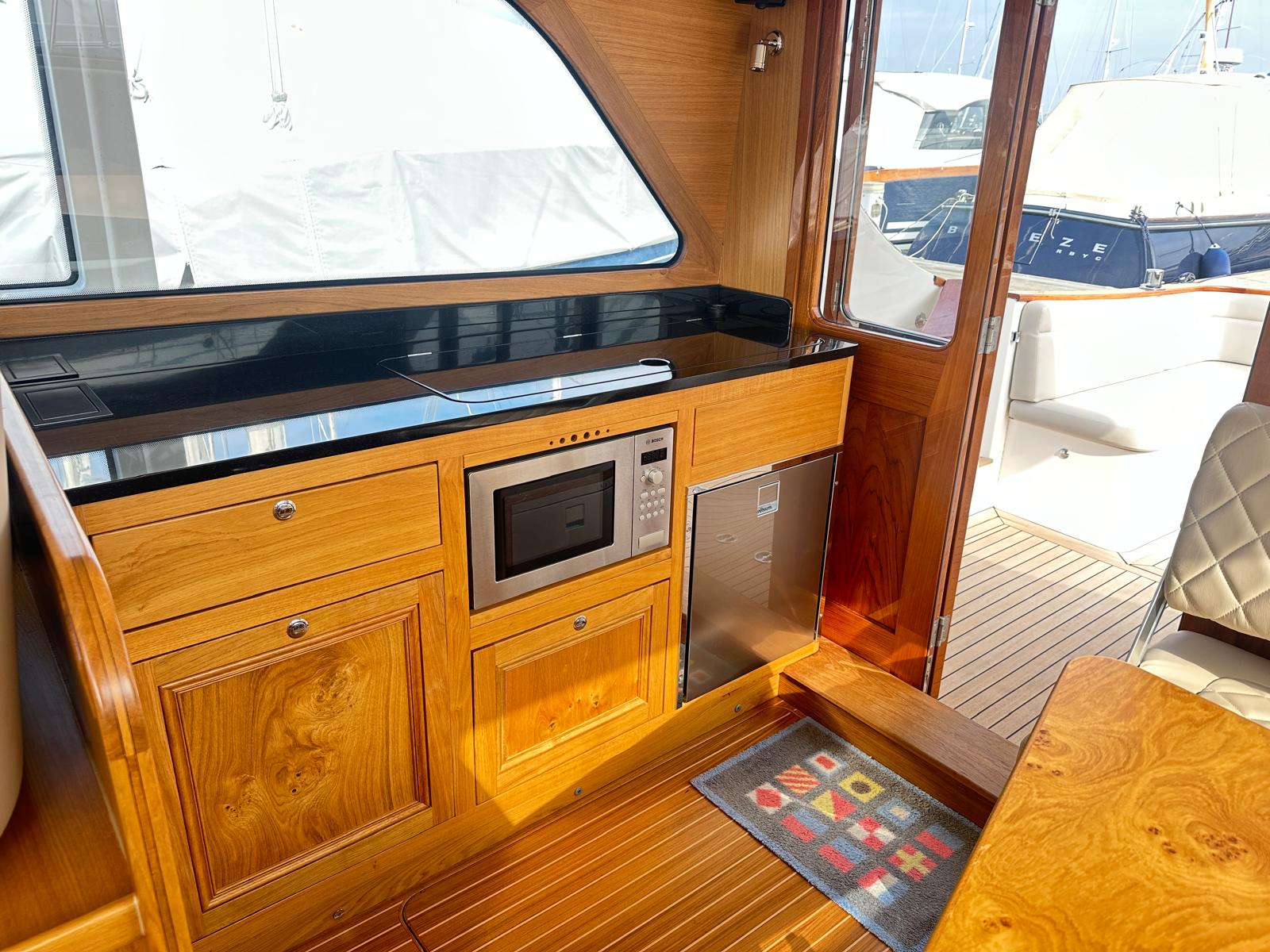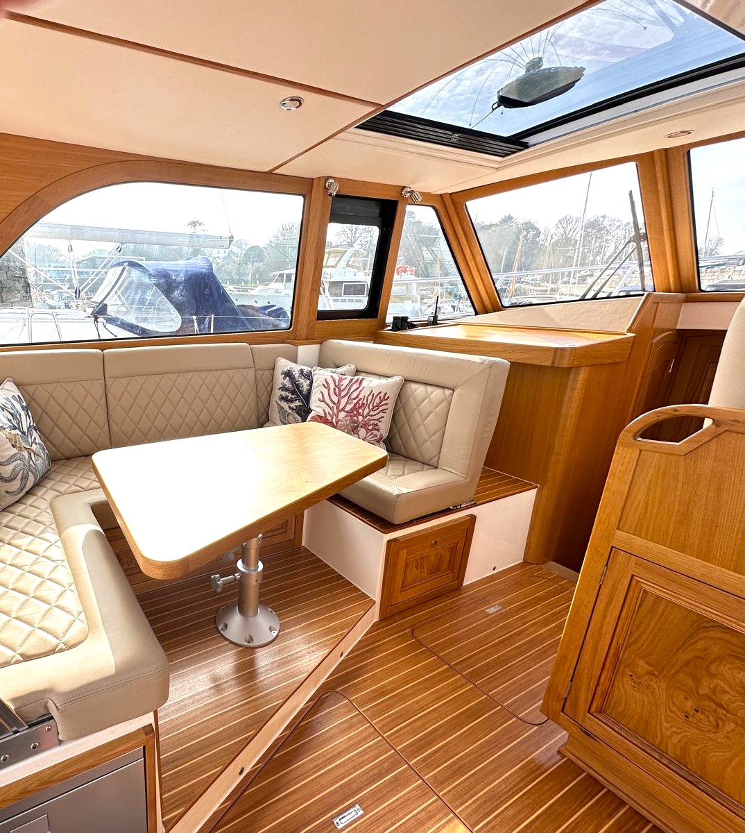 The spacious saloon includes a fully equipped galley above deck. As you relax, the full-width electric sunroof opens, allowing sunlight to flood the space, while panoramic sea views surround you through all-round windows.