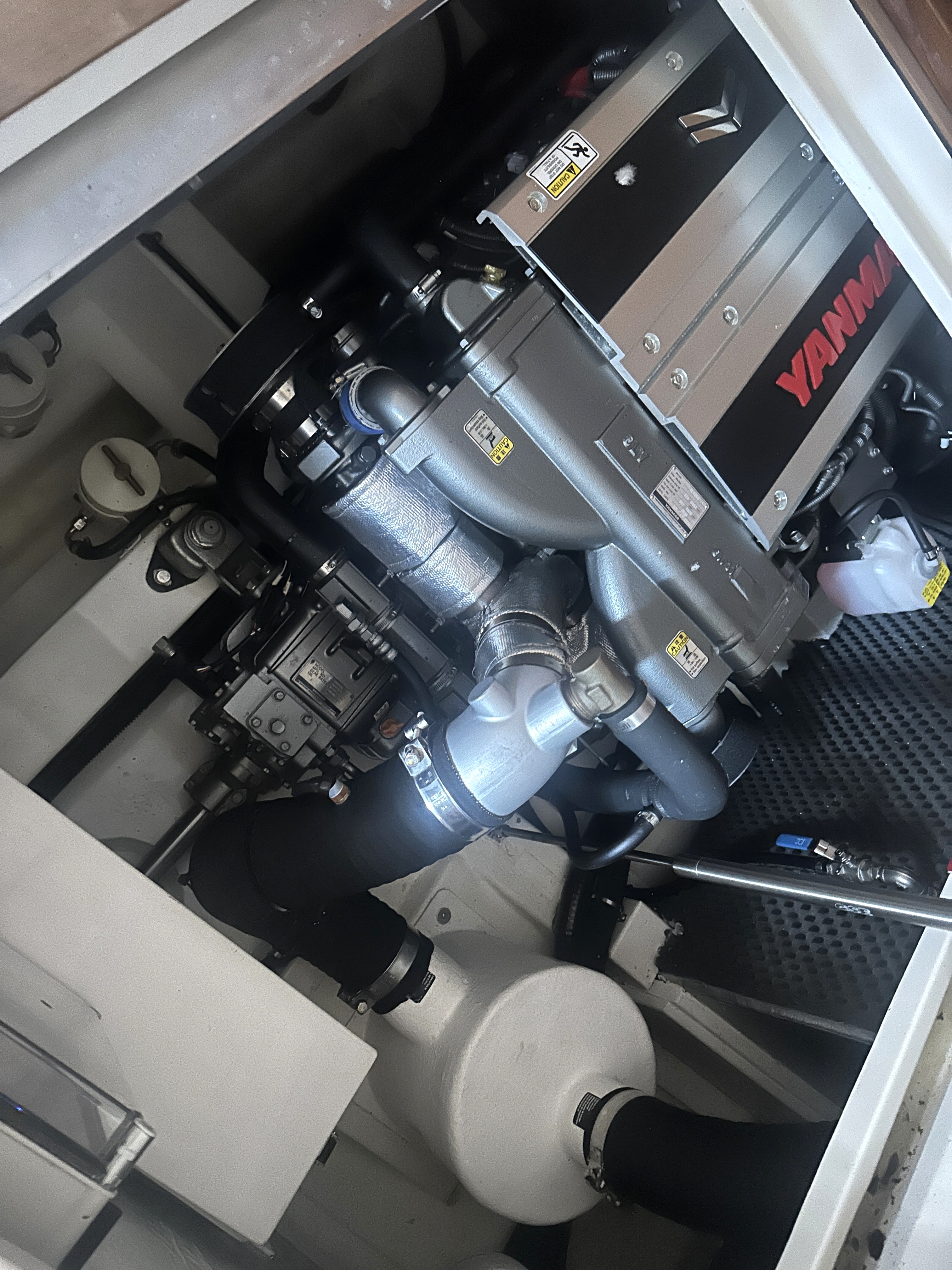 Access to engine compartment through the sole just forward of the lazarette, with two gas strut assisted engine hatches opening outwards