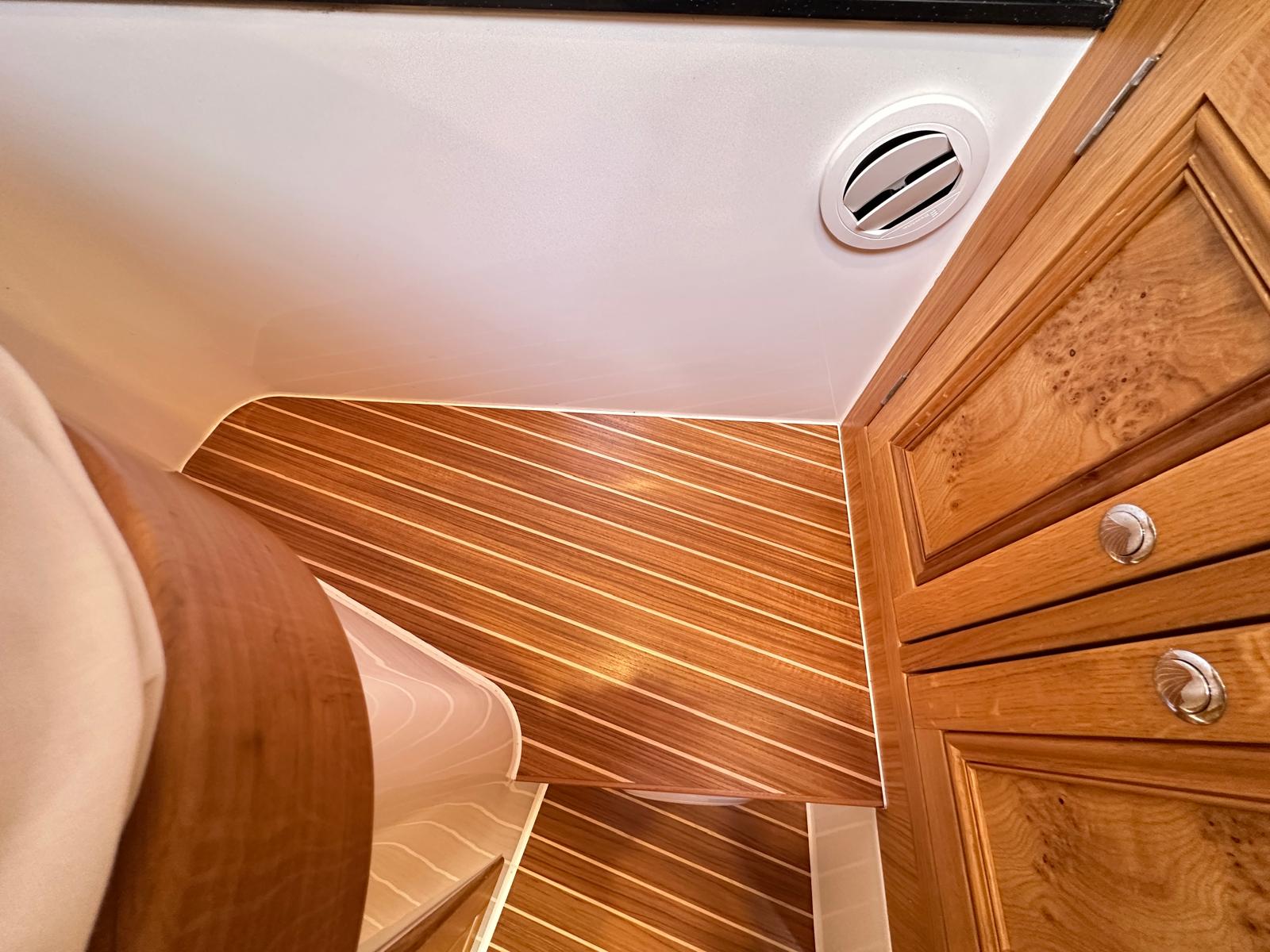 Leather seat cushions that sit on Corian sides in forward cabin