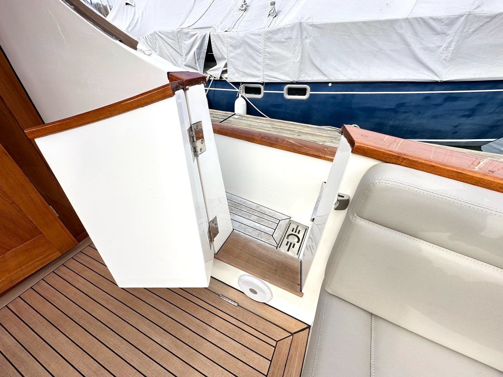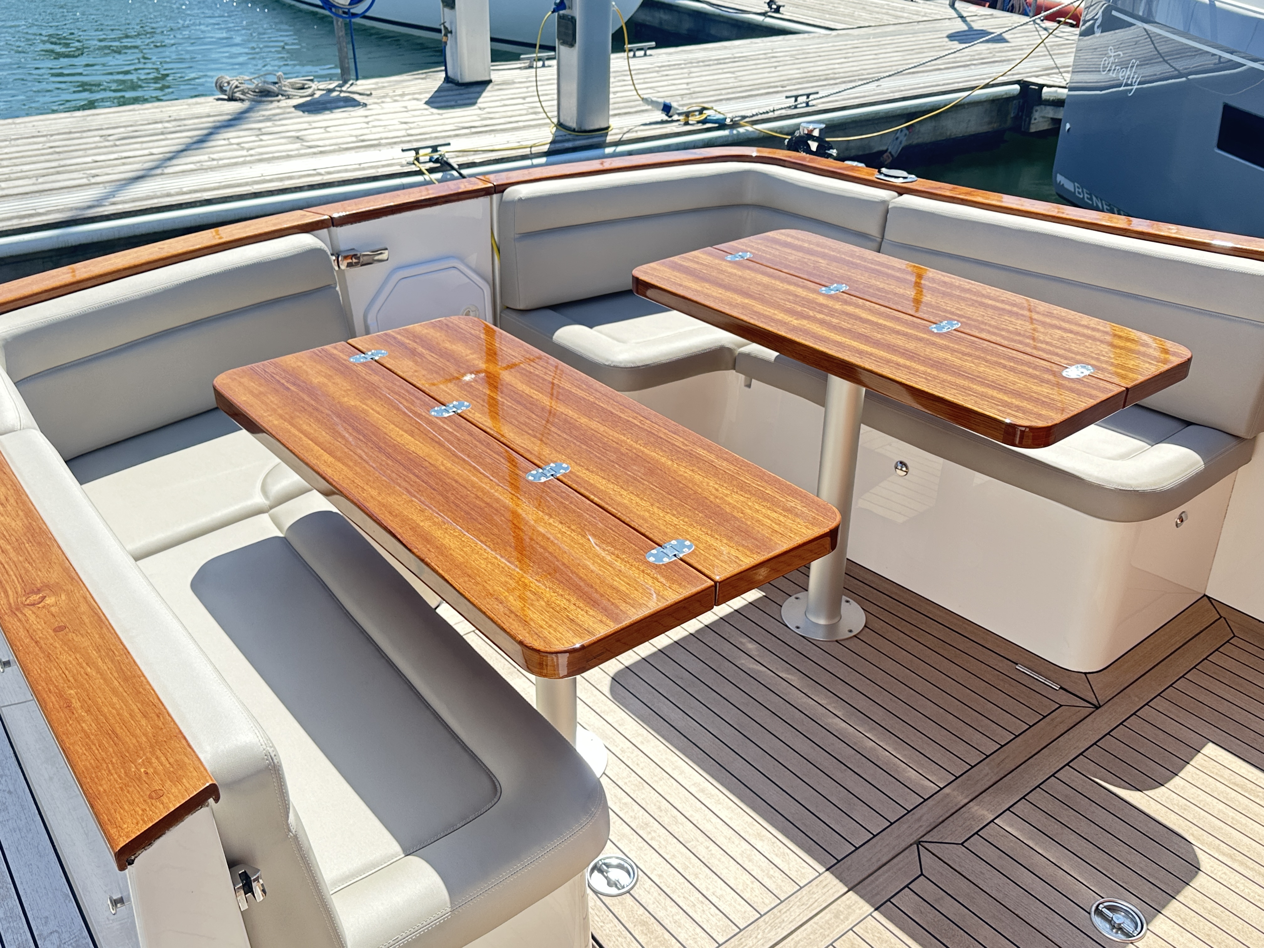 Teak removable folding tables, with a designated storage space under the cockpit seating