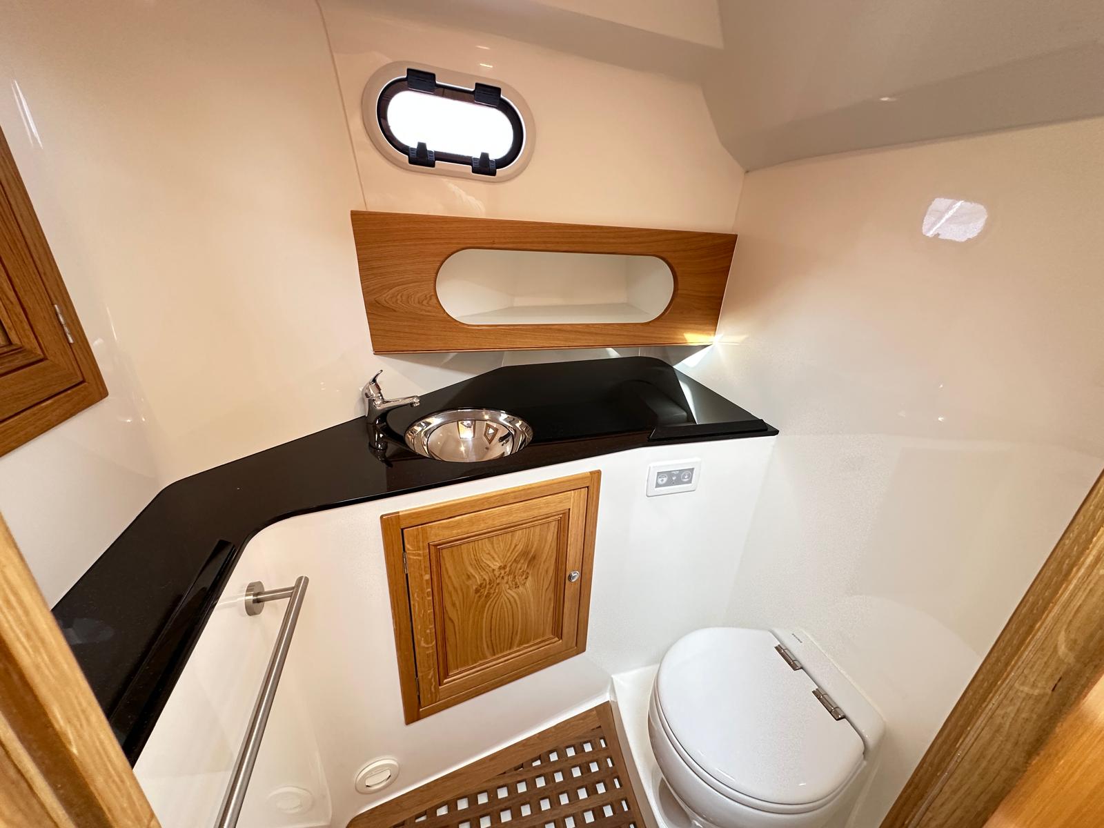 Heads located starboard side with matching Corian top and electric flush toilet