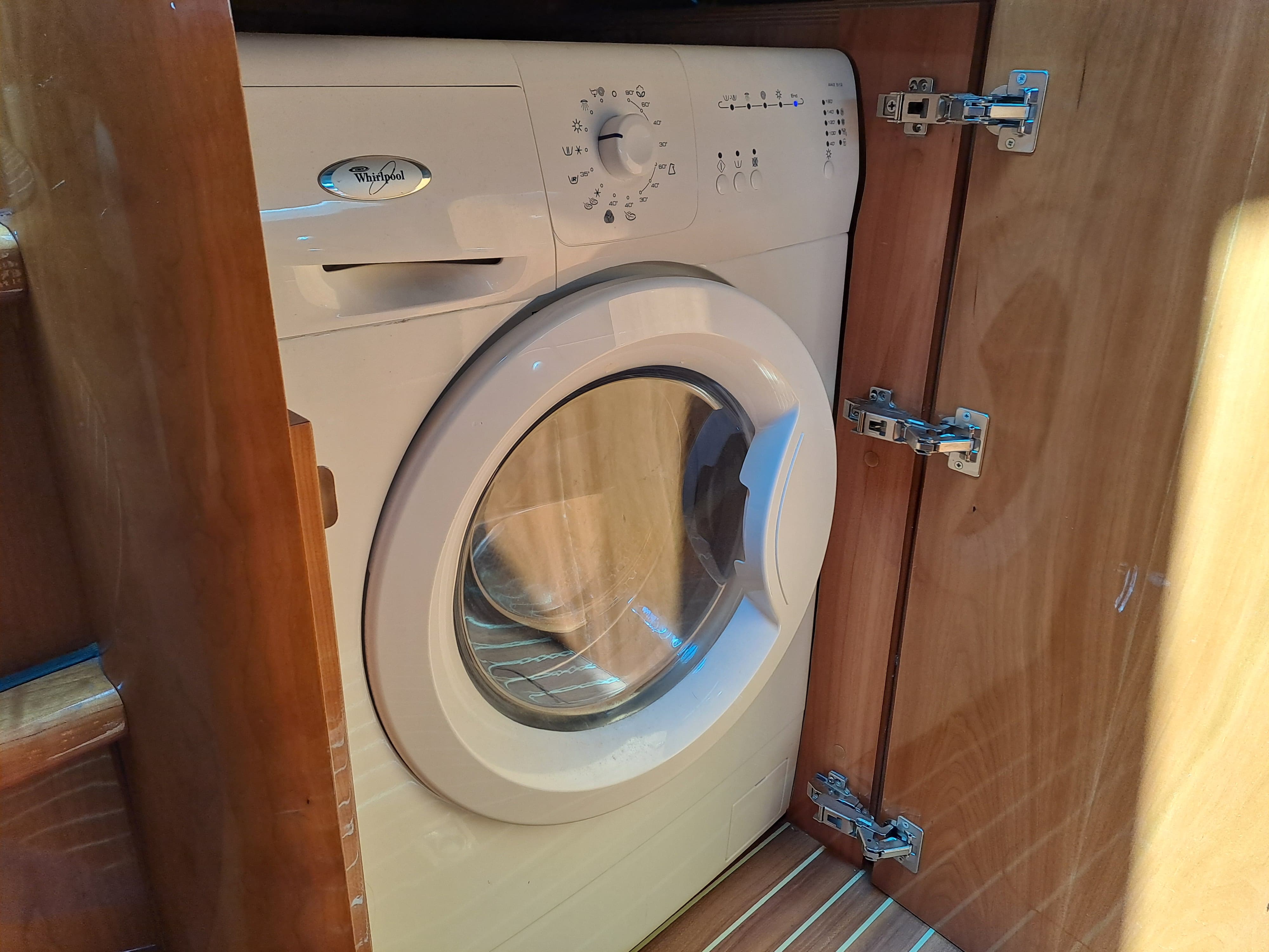 Linear galley with large fridge/ freezer, Samsung combi microwave/convection oven, new in 2023, Siemens 4 ring ceramic hob, Whirlpool dishwasher, whirlpool washing machine, stainless steel sink & tap, ample storage drawers and cupboards, large kitchen worksurface to both sides with additional plug sockets