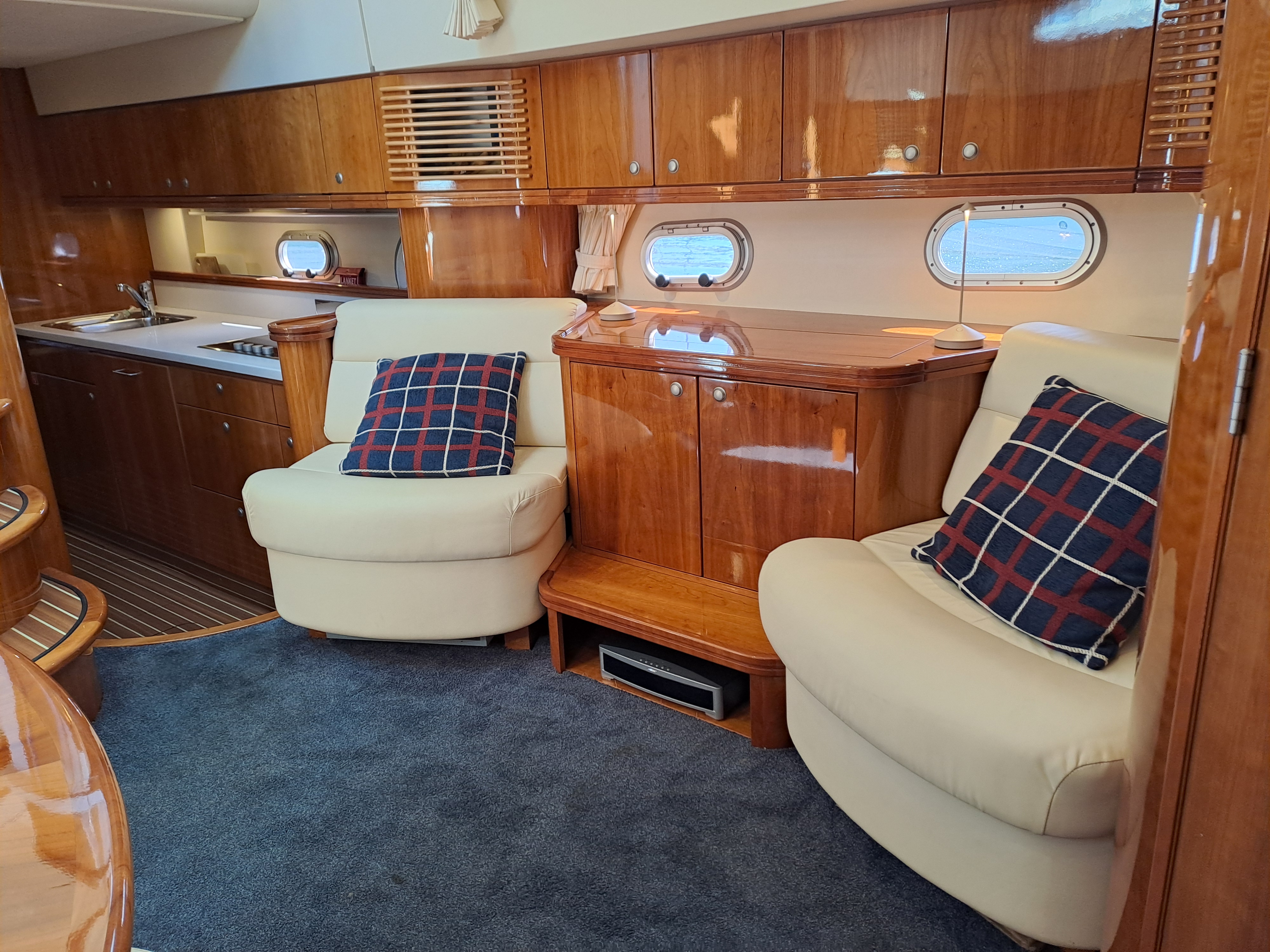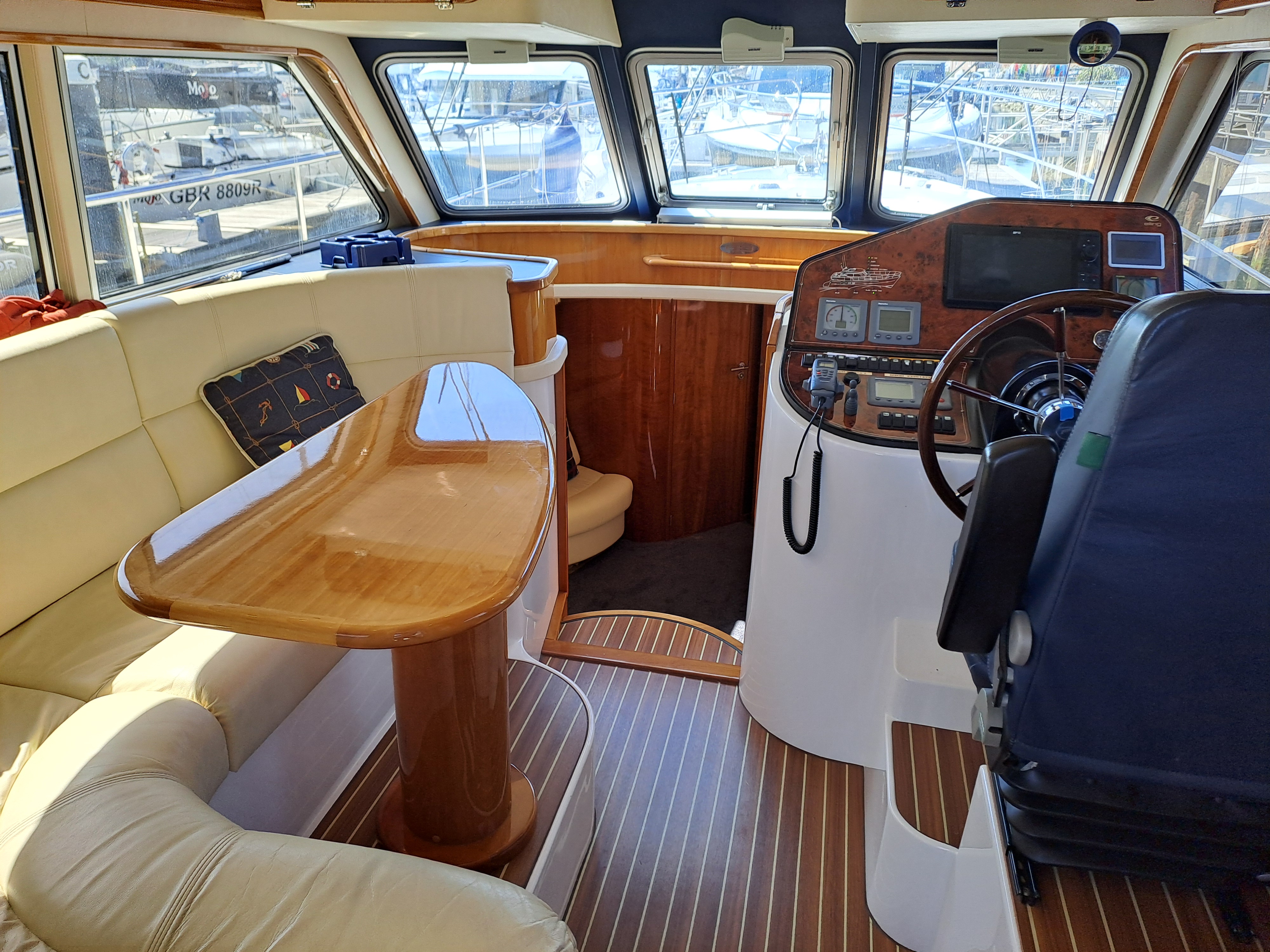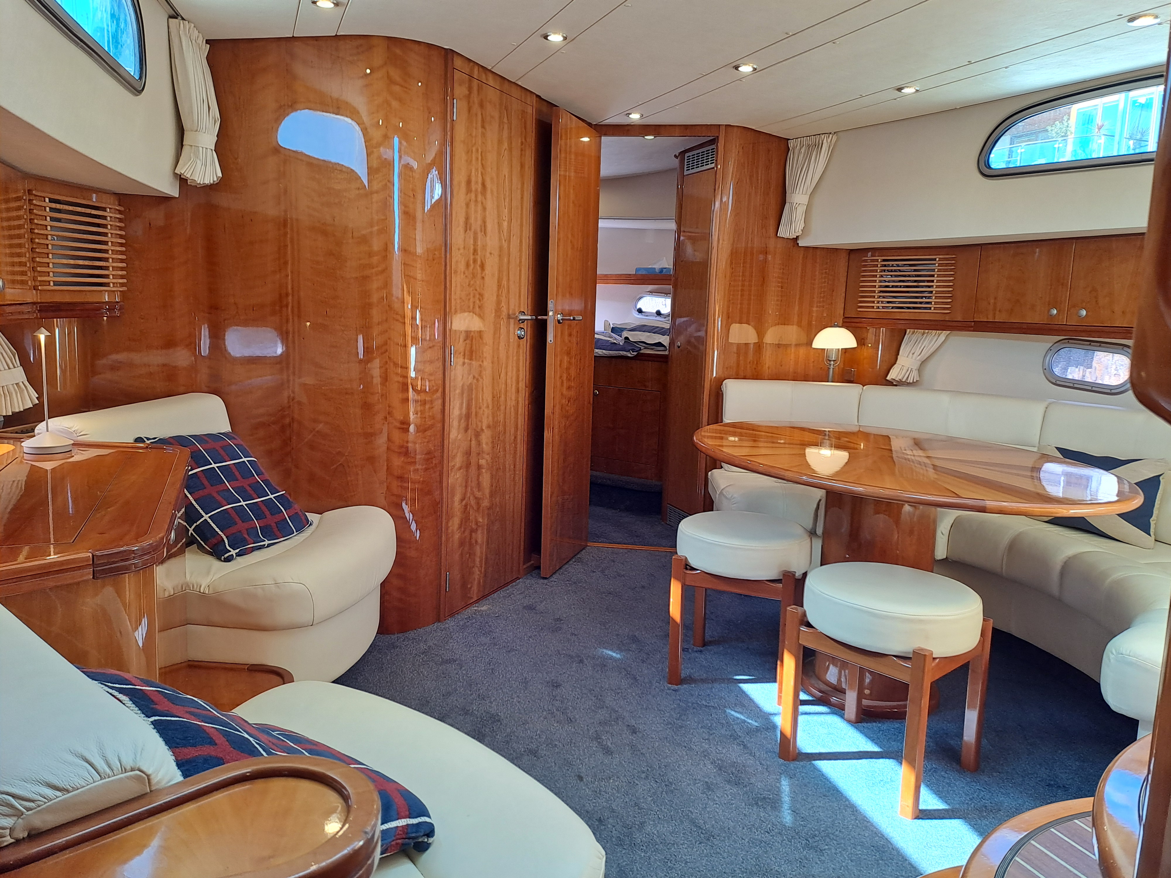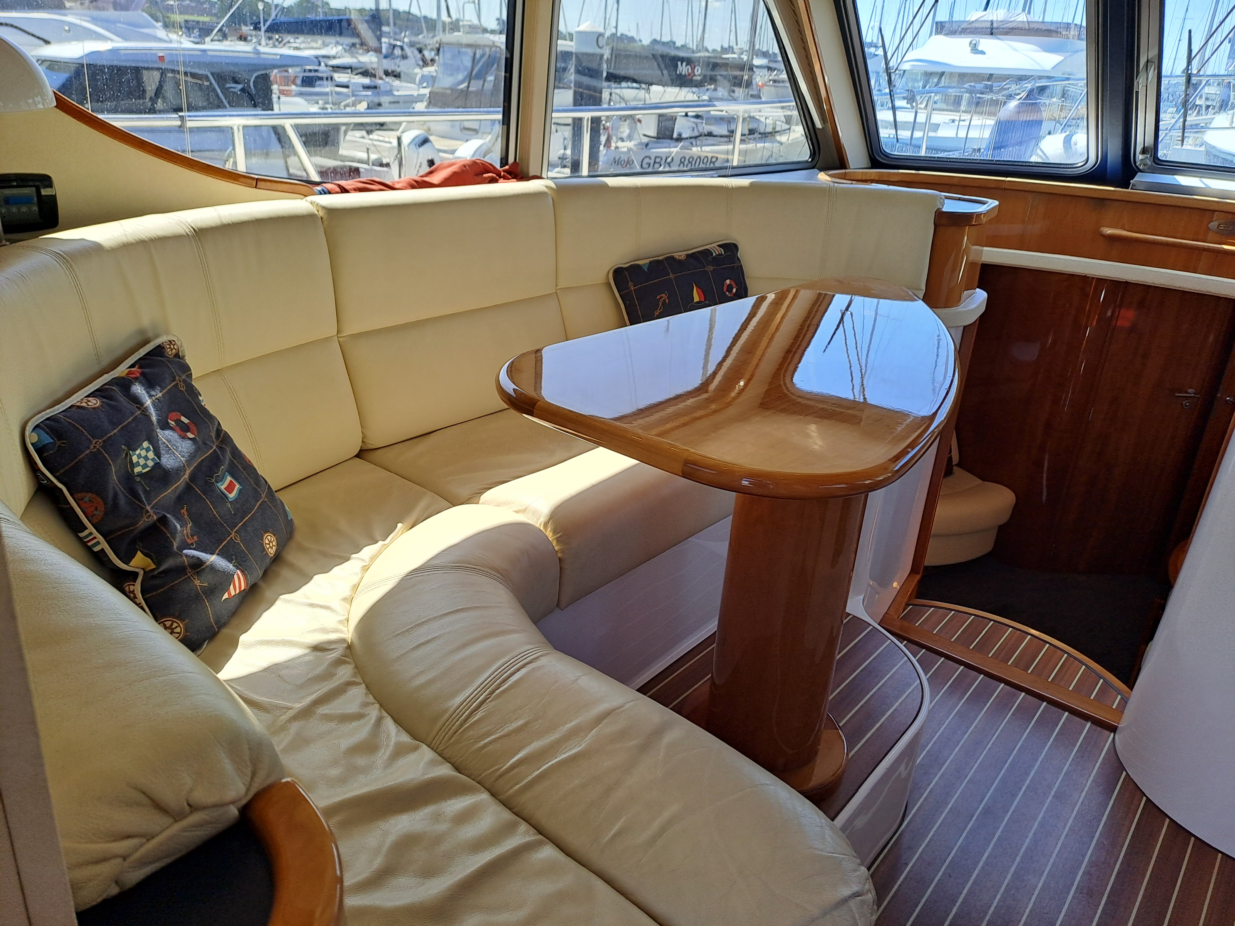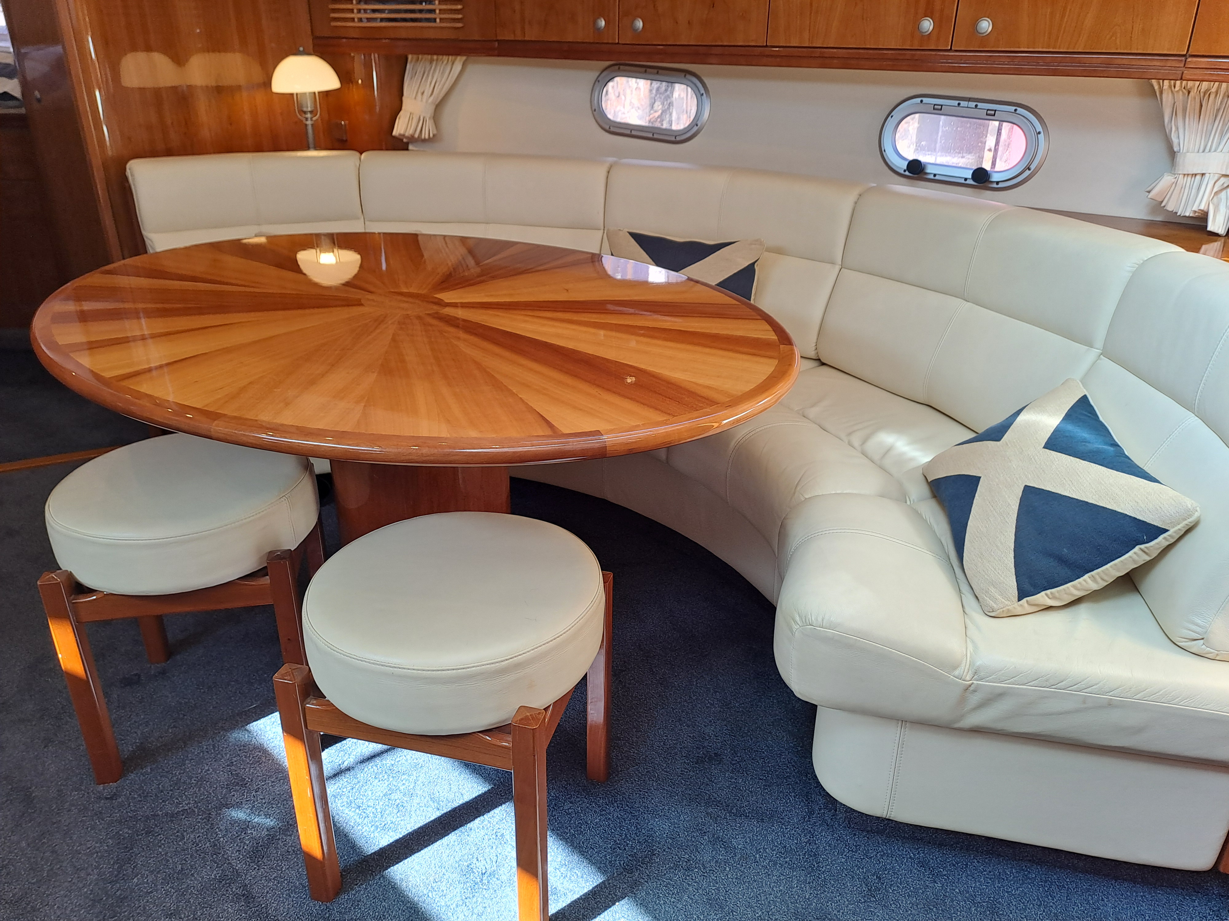 Cream leather upholstery to both upper seating area and lower saloon