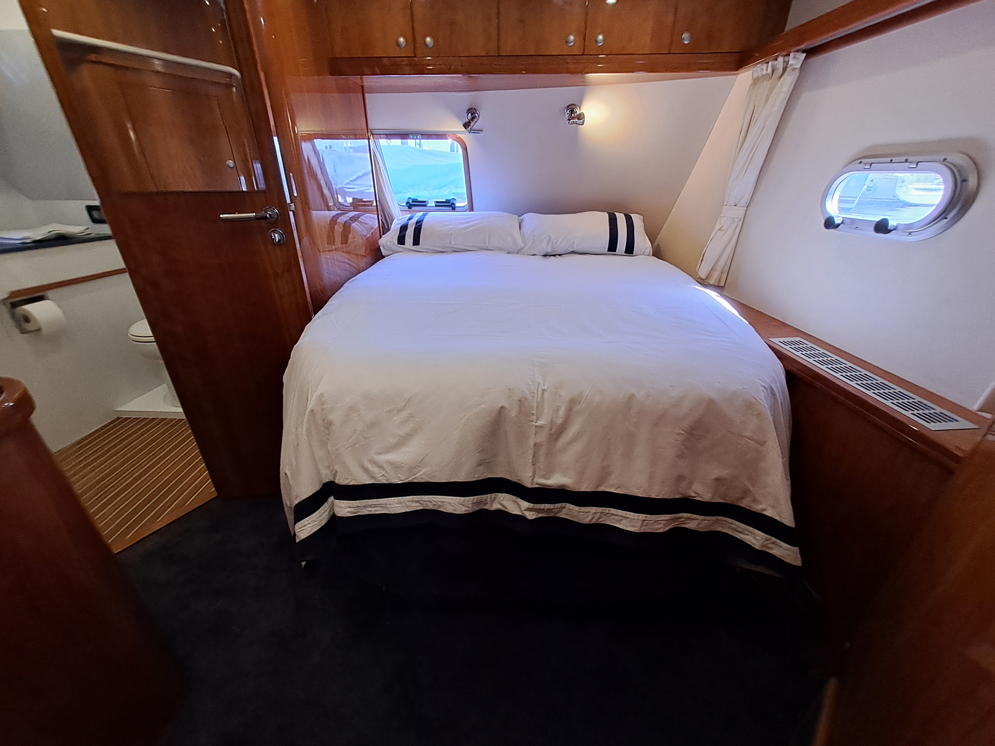 Master cabin aft with spacious double berth, storage above berth, mirror, hanging storage, indirect lighting, reading lights, opening portholes and hatches. Master cabin ensuite with electric flush toilet, storage with mirror, sink and towel radiator, substantial shower compartment