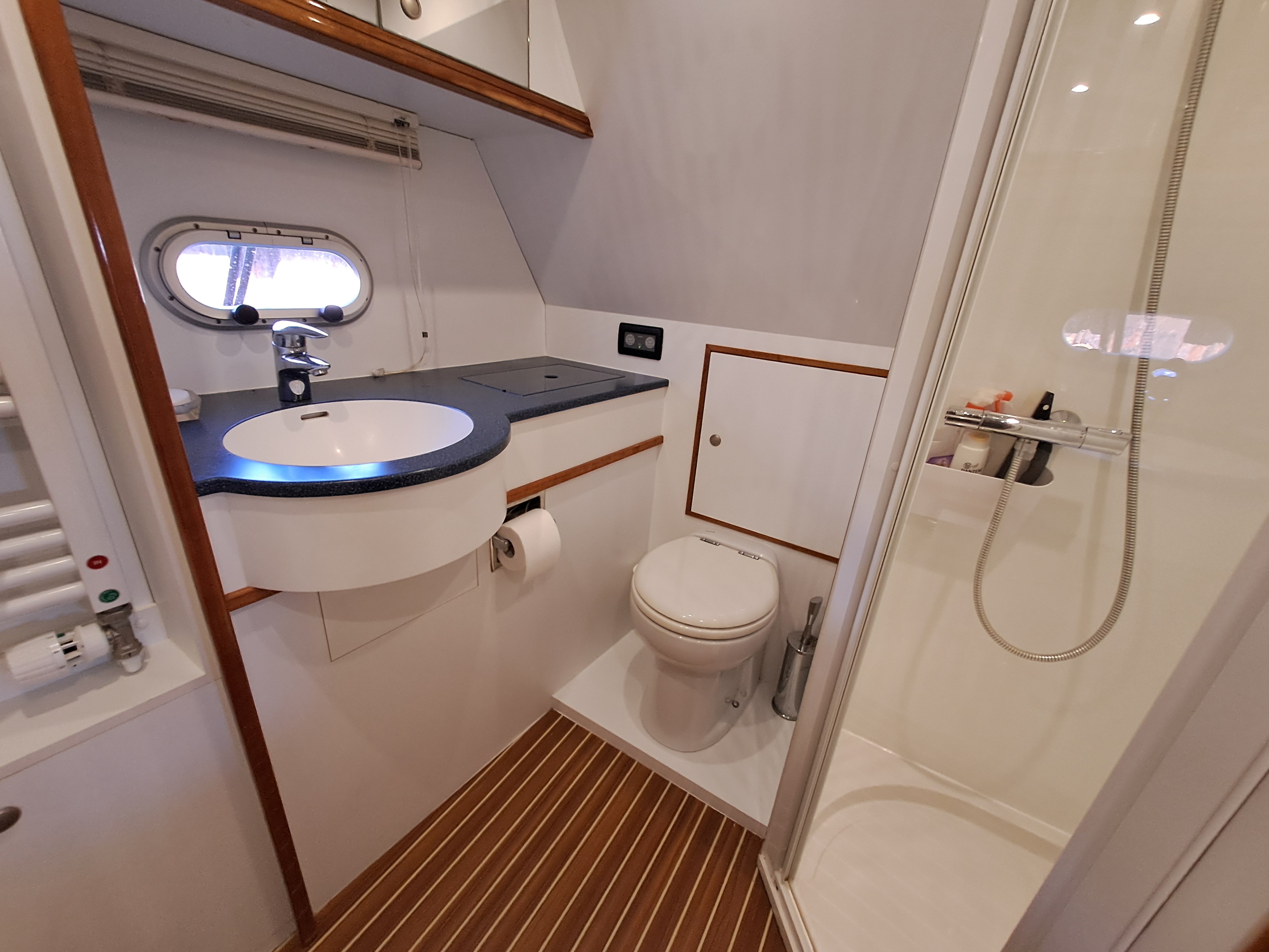 Day/ guest cabin heads to port with electric toilet, separate substantial shower compartment, storage with mirror, towel radiator, down-lights and opening porthole