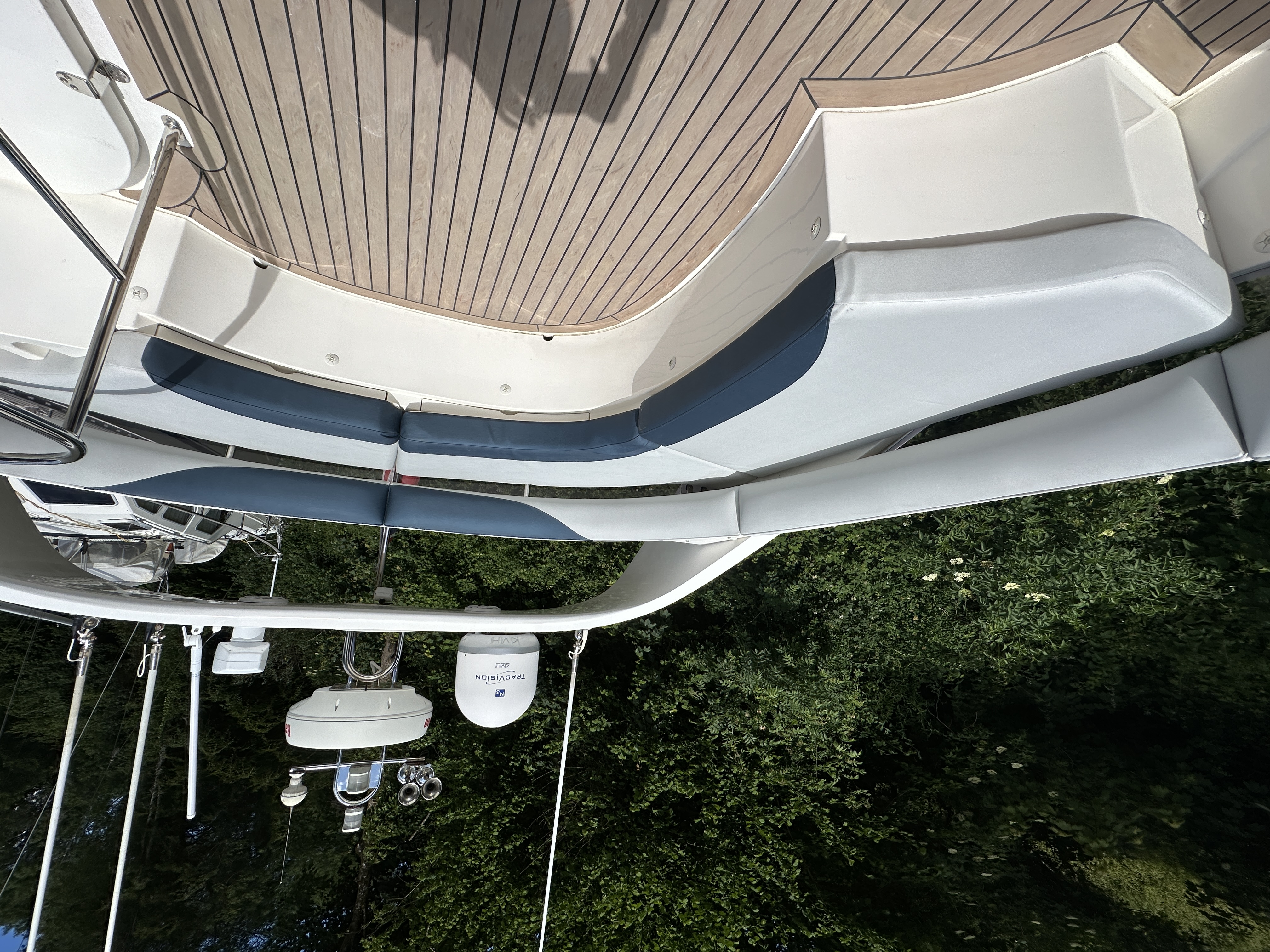 Adjustable helm seat on fly-bridge. 2 x co-pilot seats on fly-bridge - newly upholstered by Setag 2022