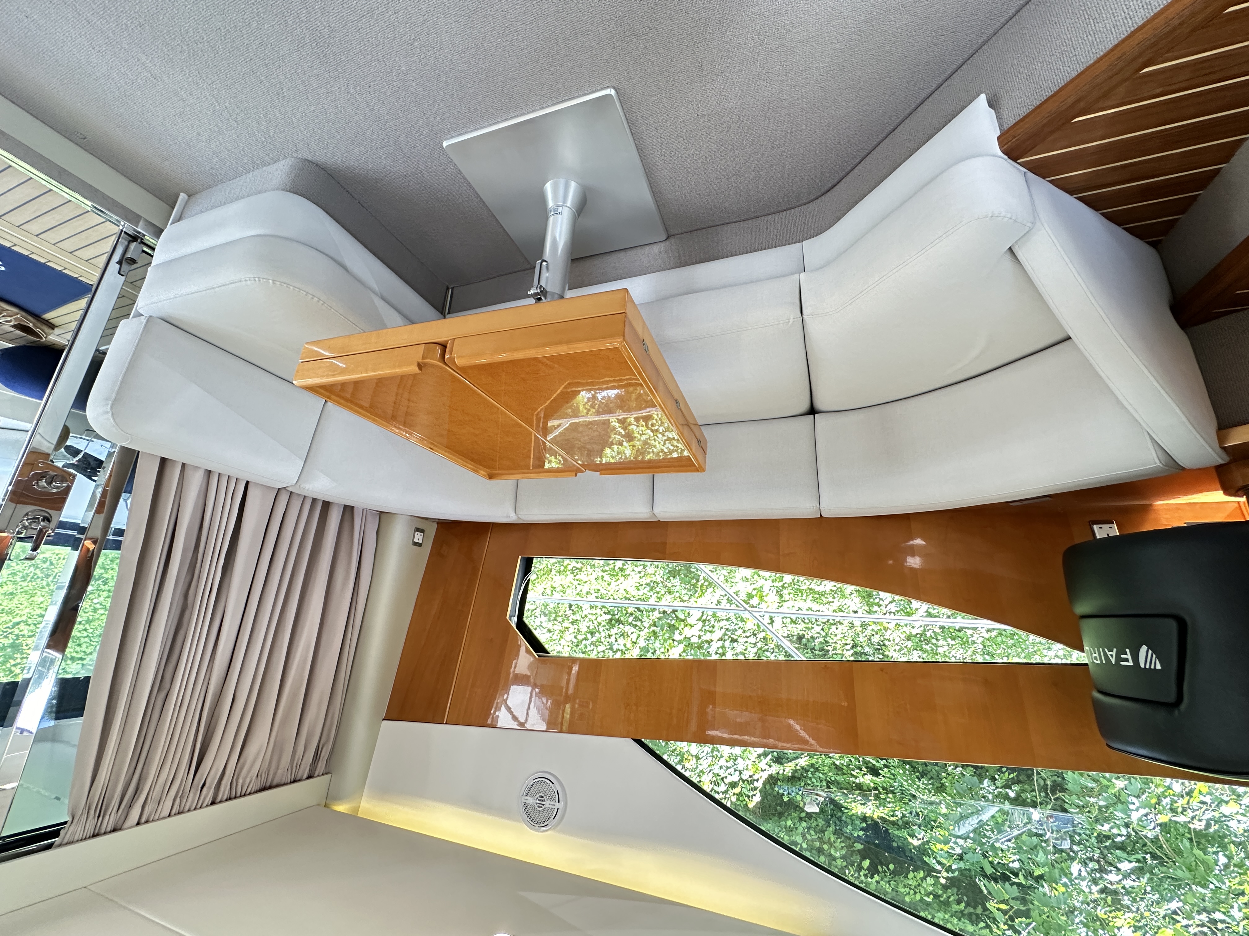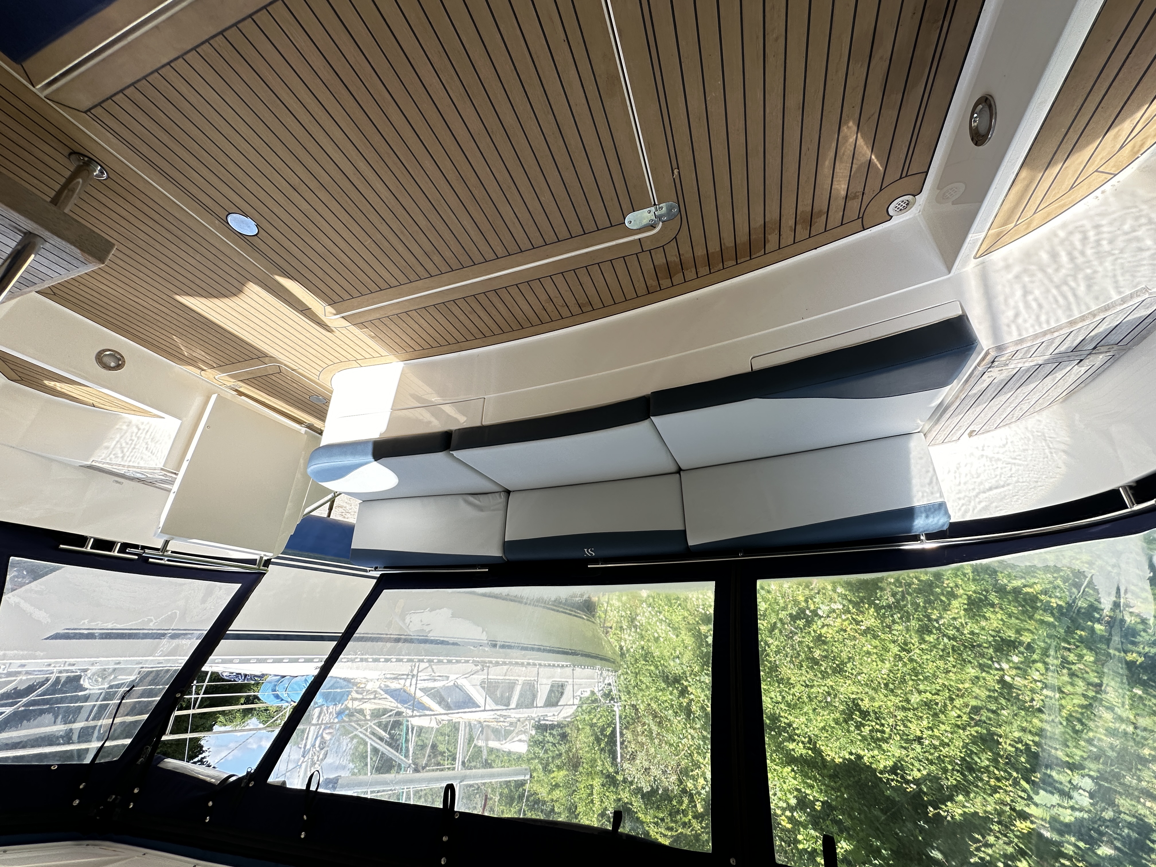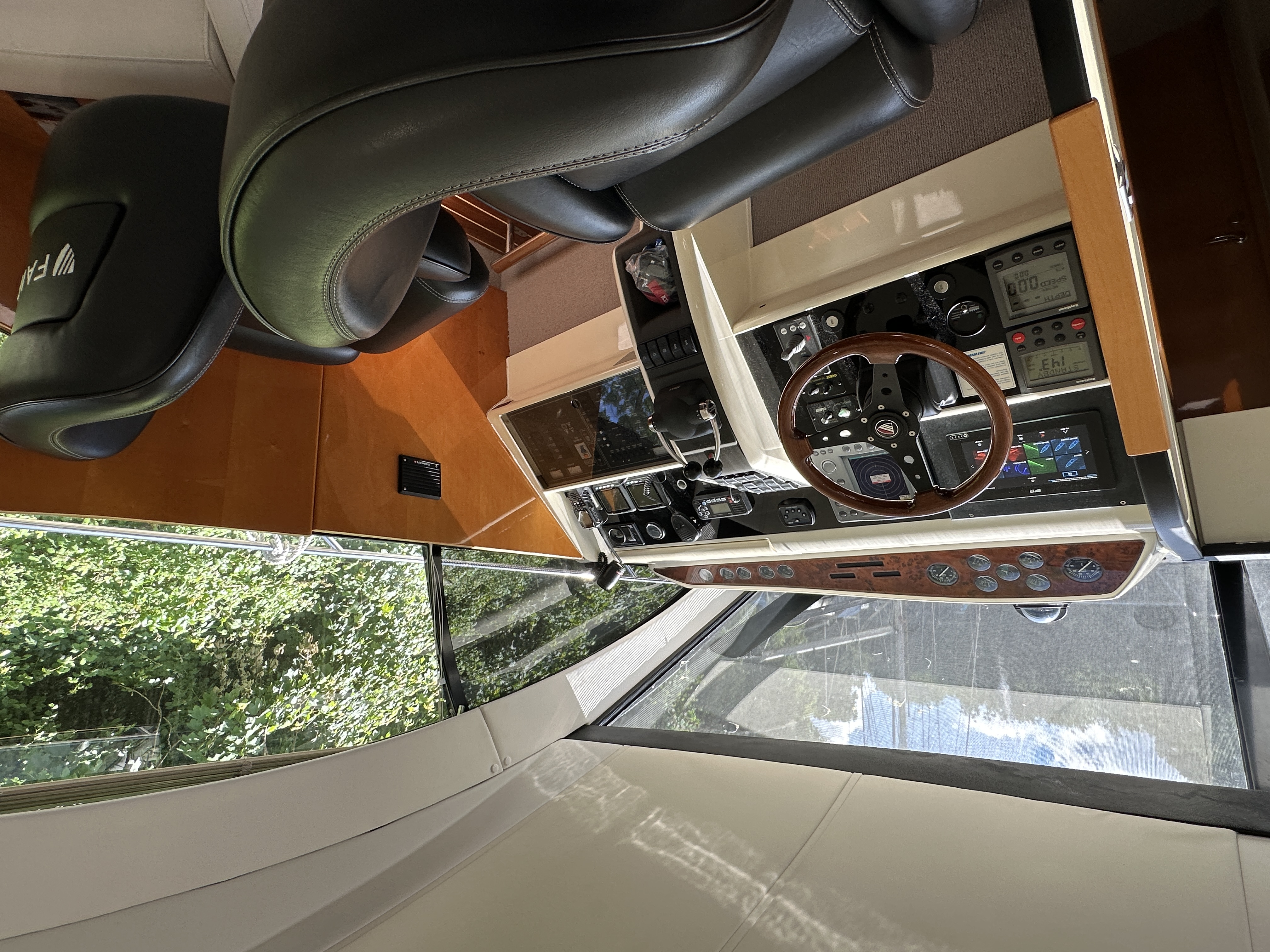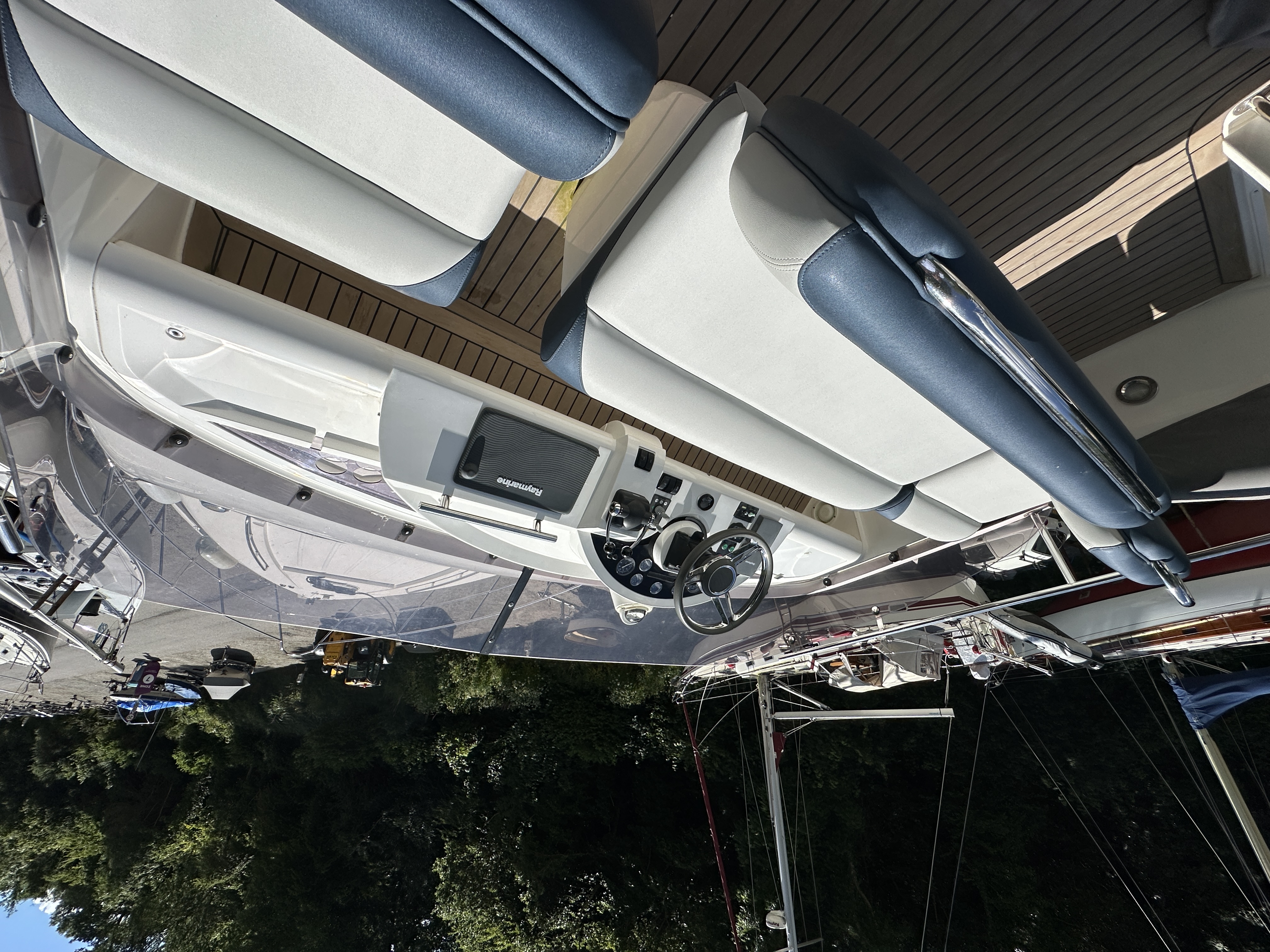 Flybridge helm position with double helm seat + two co-pilot seats.