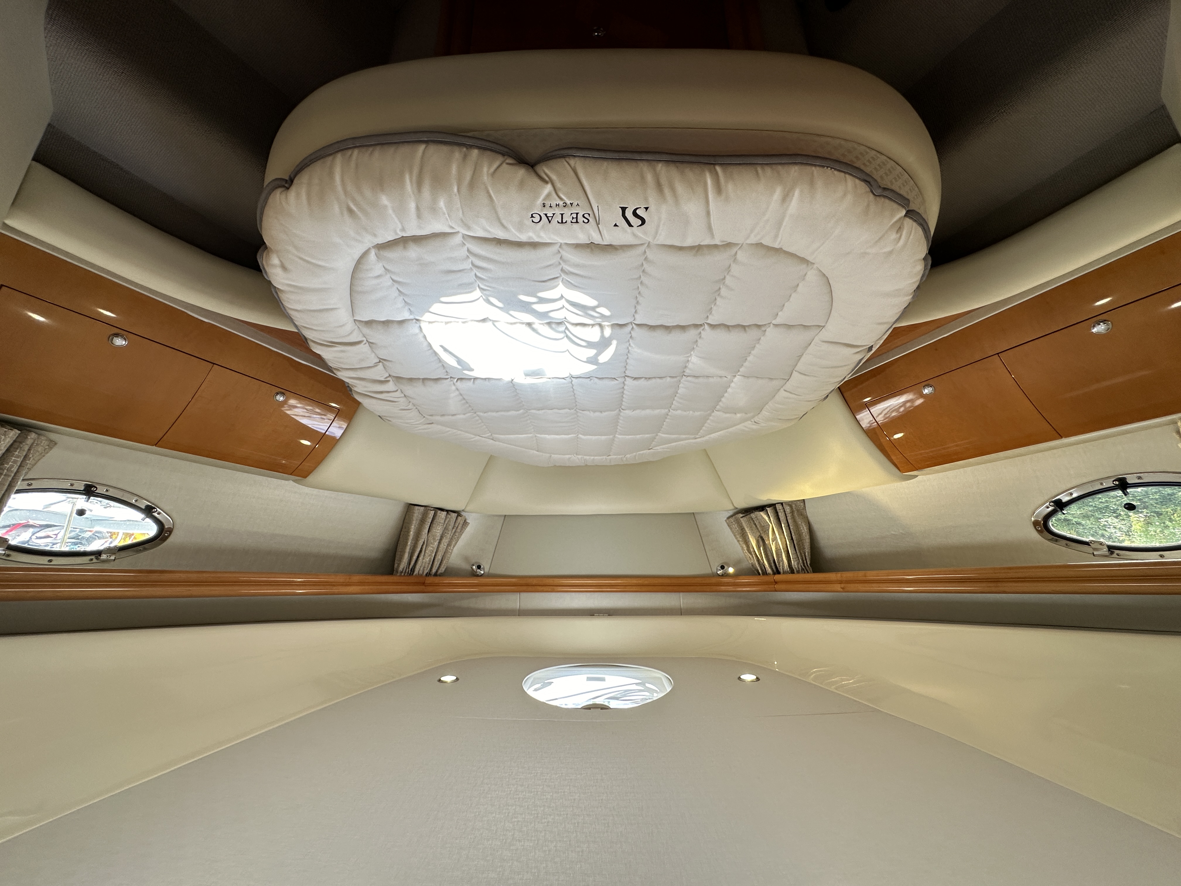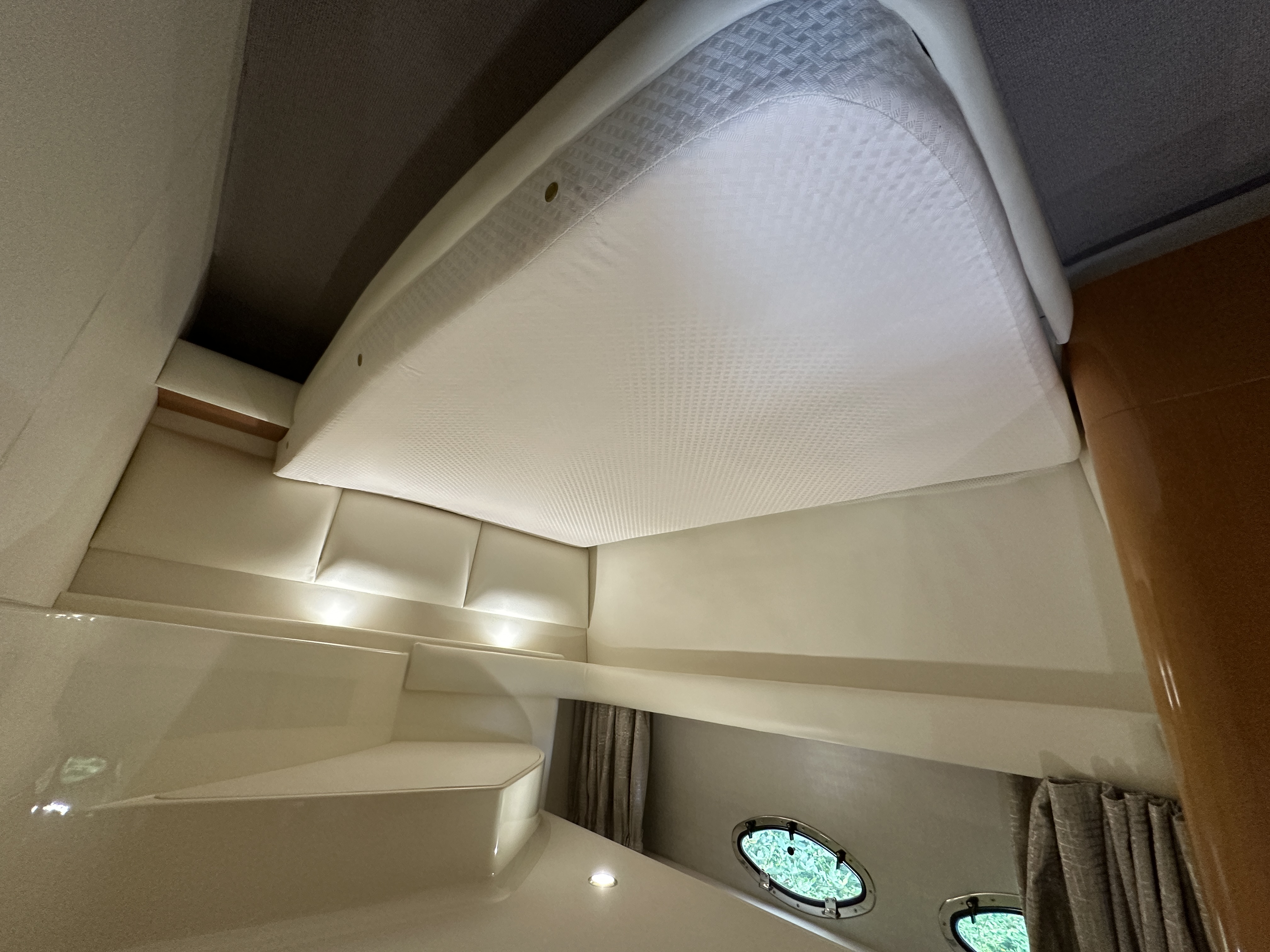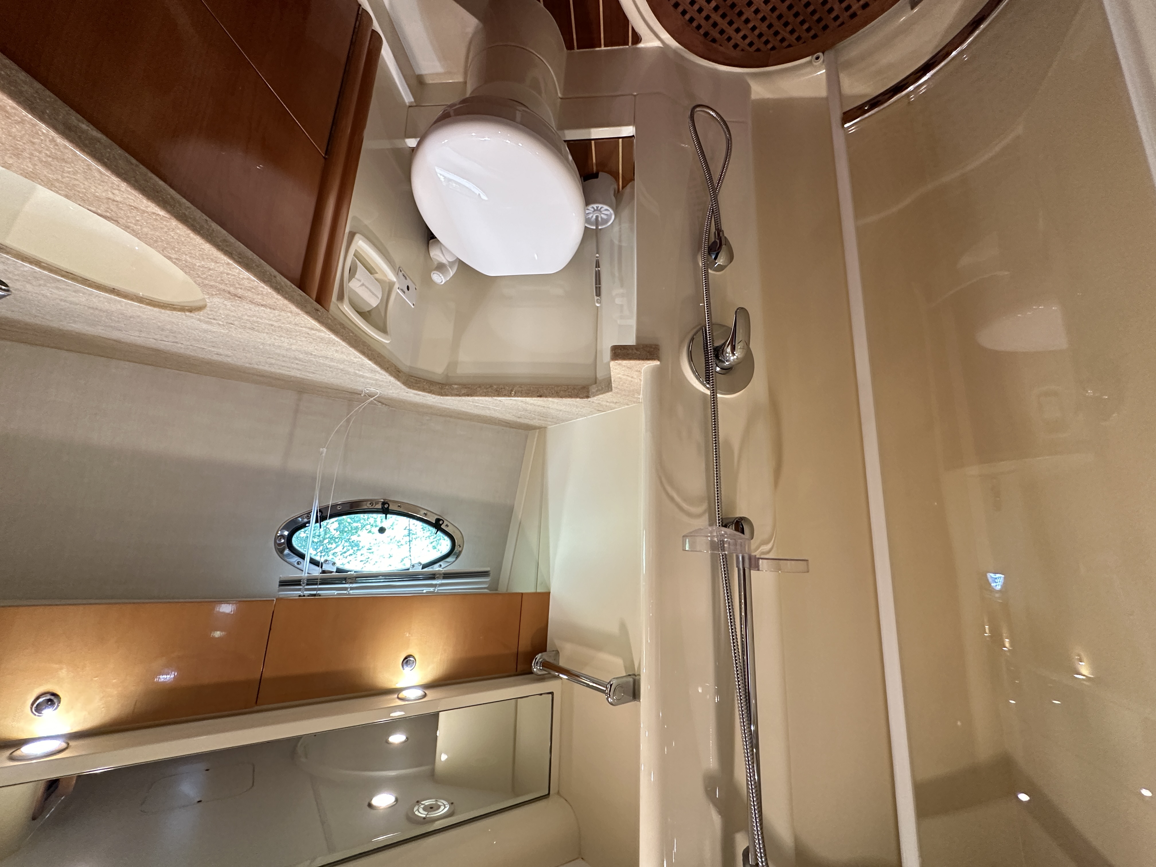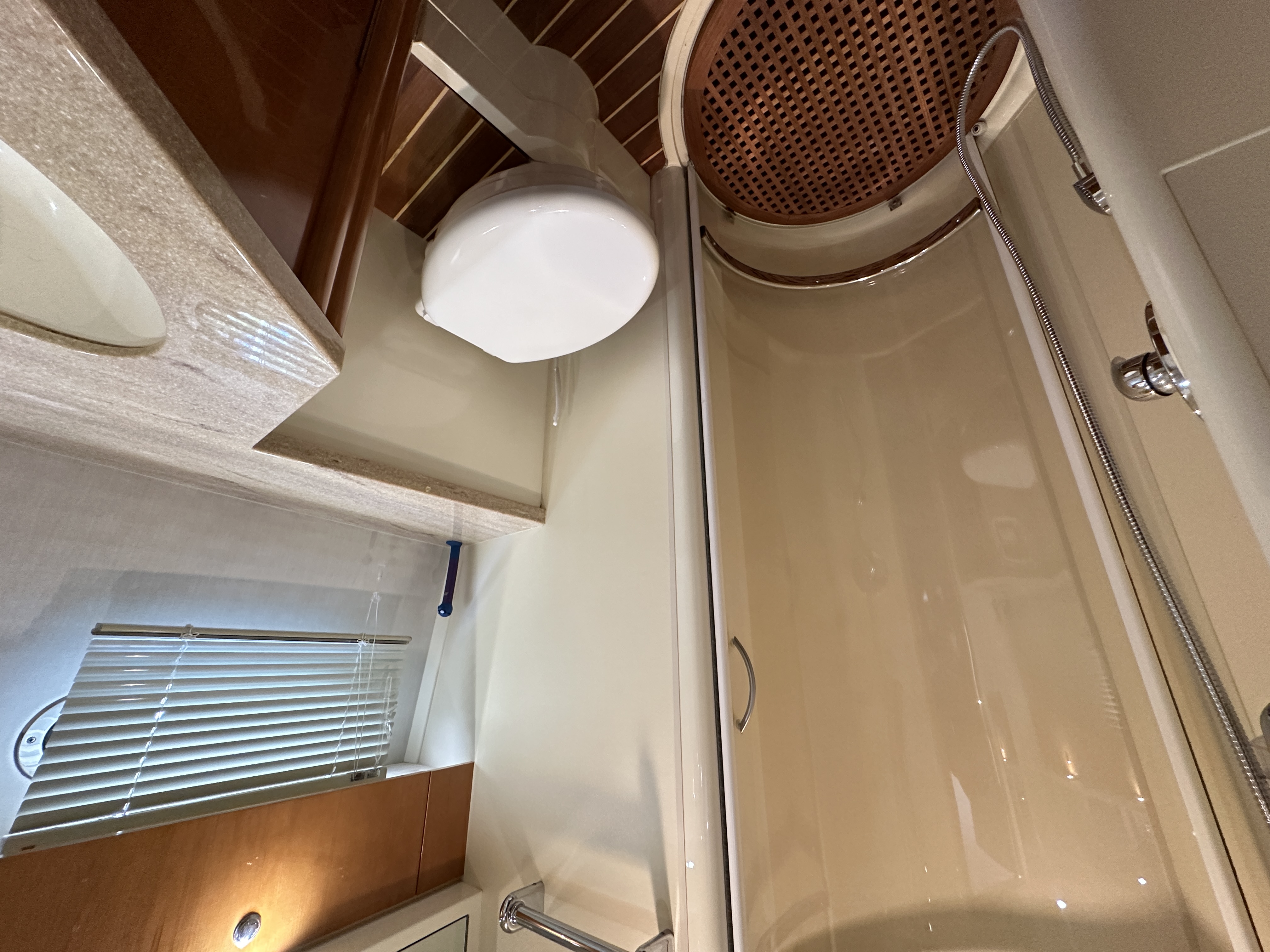 Master Cabin forward with en-suite electric freshwater flush toilet (Replaced January 2023) and shower with hoses and shower grates refurbished in January 2023