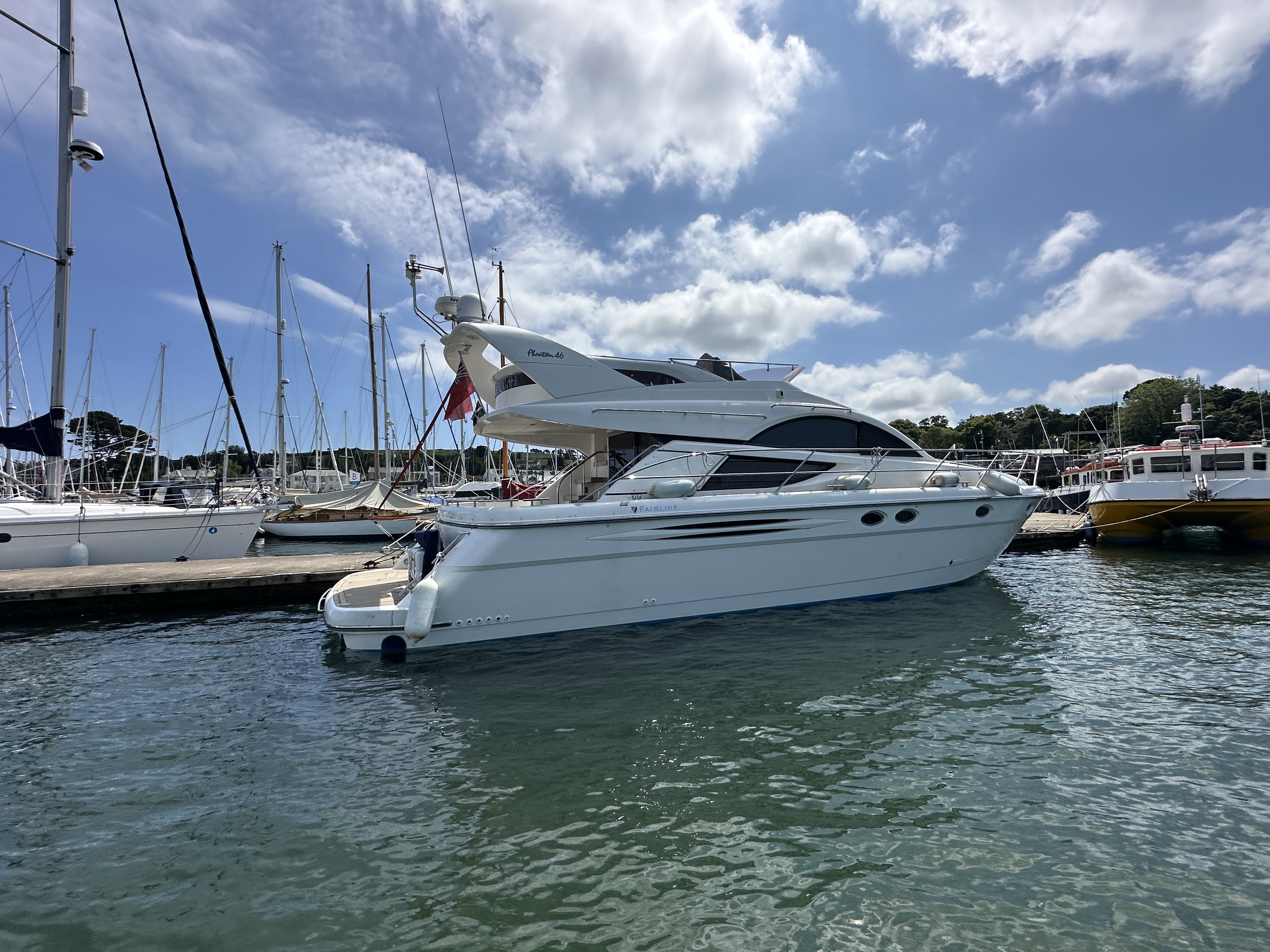 Presented to an exacting standard this boat has undergone a considerable refit / refurbishment during 2022 and carrying through to 2023 mainly carried out by Setag of Plymouth and totalling over £100,000. 'Fiona Rae' has a great specification including bow and stern thrusters, electric anchor windlass, radar, plotter and autopilot, holding tank and more. Her spacious accommodation offers 6 berths in 3 cabins- two doubles and one twin cabin, with Eberspacher heating, two heads, dinghy crane. A wonderful boat for socialising, she provides plenty of room outside as well, with a large flybridge, bow sunbathing area and canvas-covered aft cockpit. Well maintained boat, this Fairline Phantom 46 is only in her 4th ownership from new.