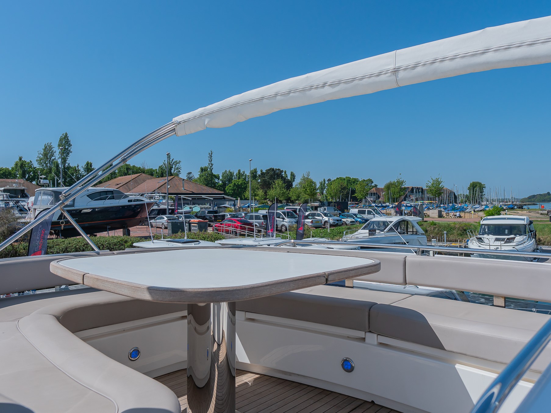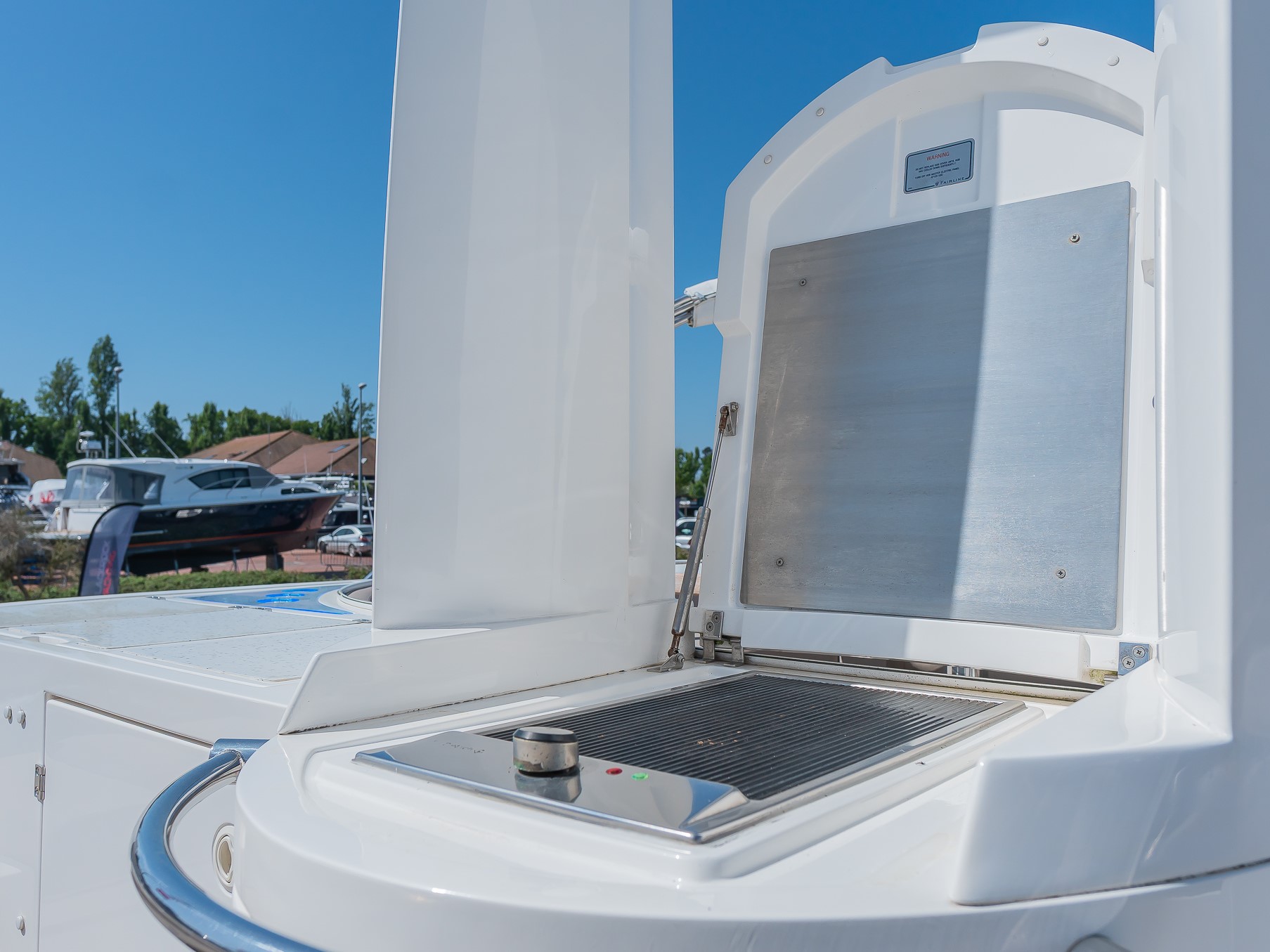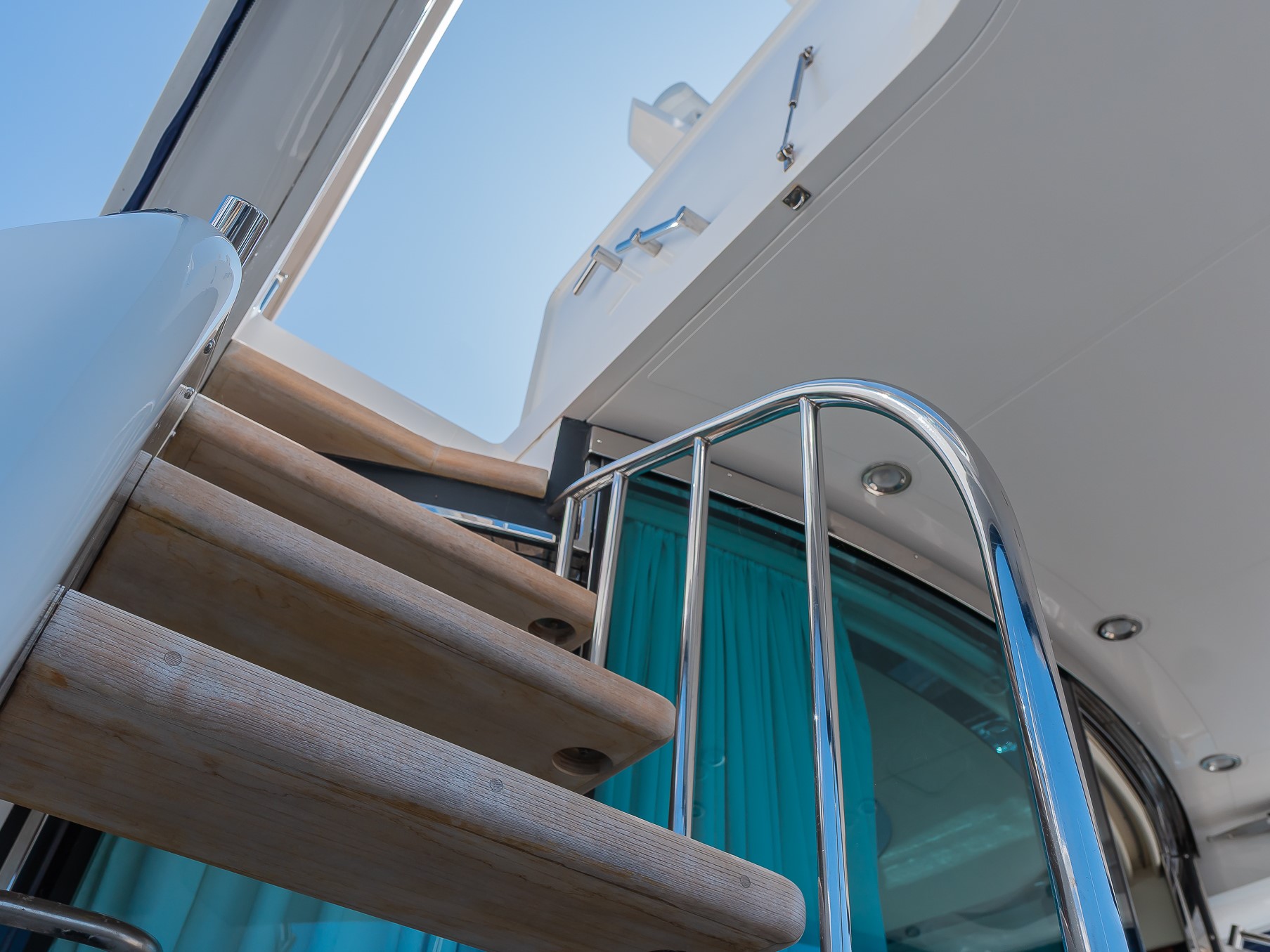 The open-plan interior combines high-end finishes with practical features, making it ideal for extended cruising or entertaining. A key highlight is the beach club option, offering water-level access for swimming, relaxing, or launching water toys.