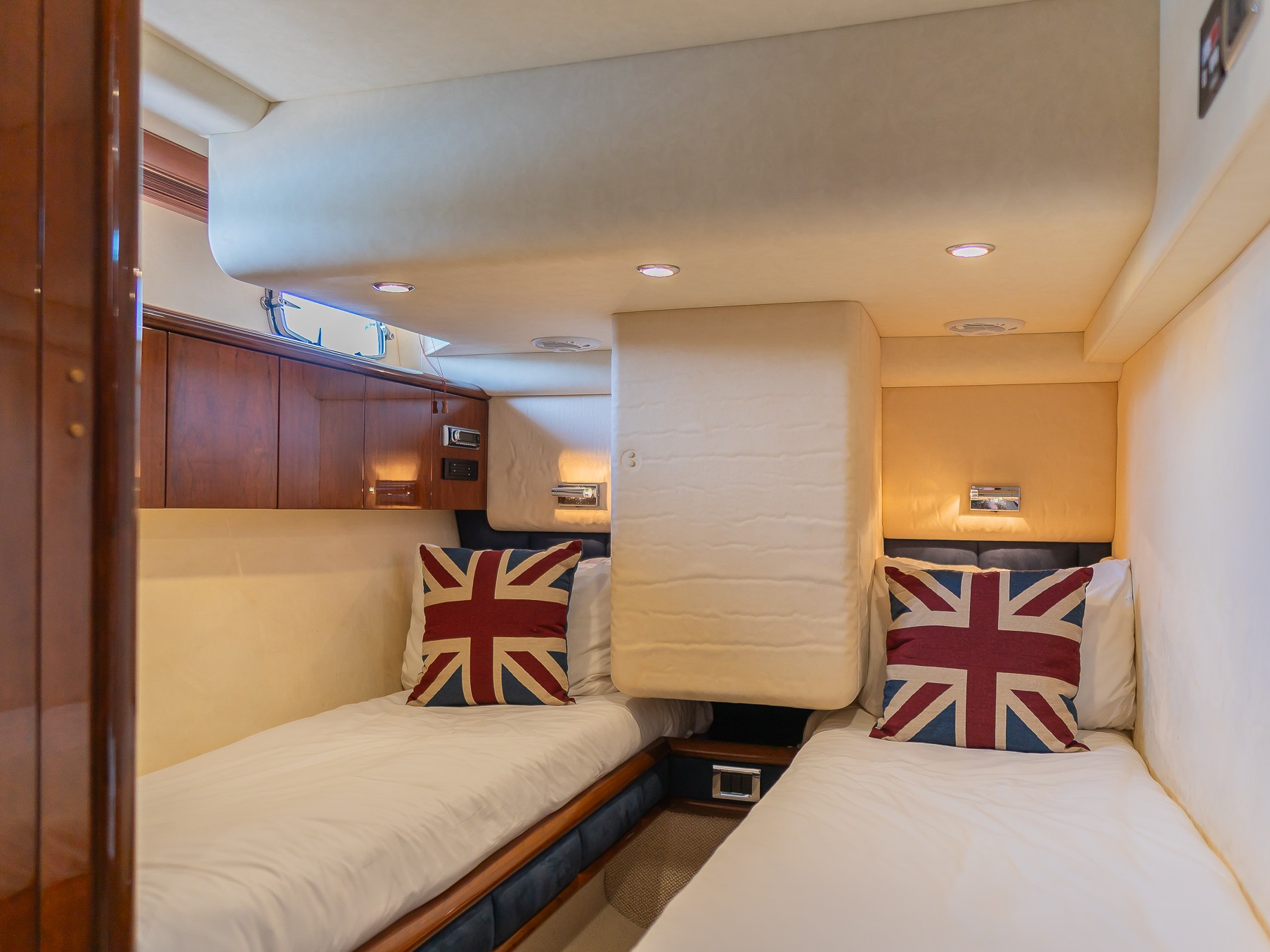 Starboard guest cabin with two single berths, mid level cupboards, double wardrobe and flatscreen TV/DVD.