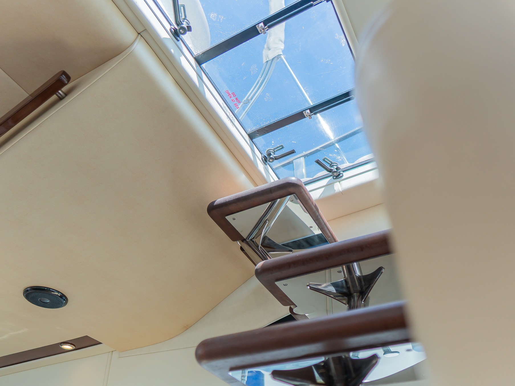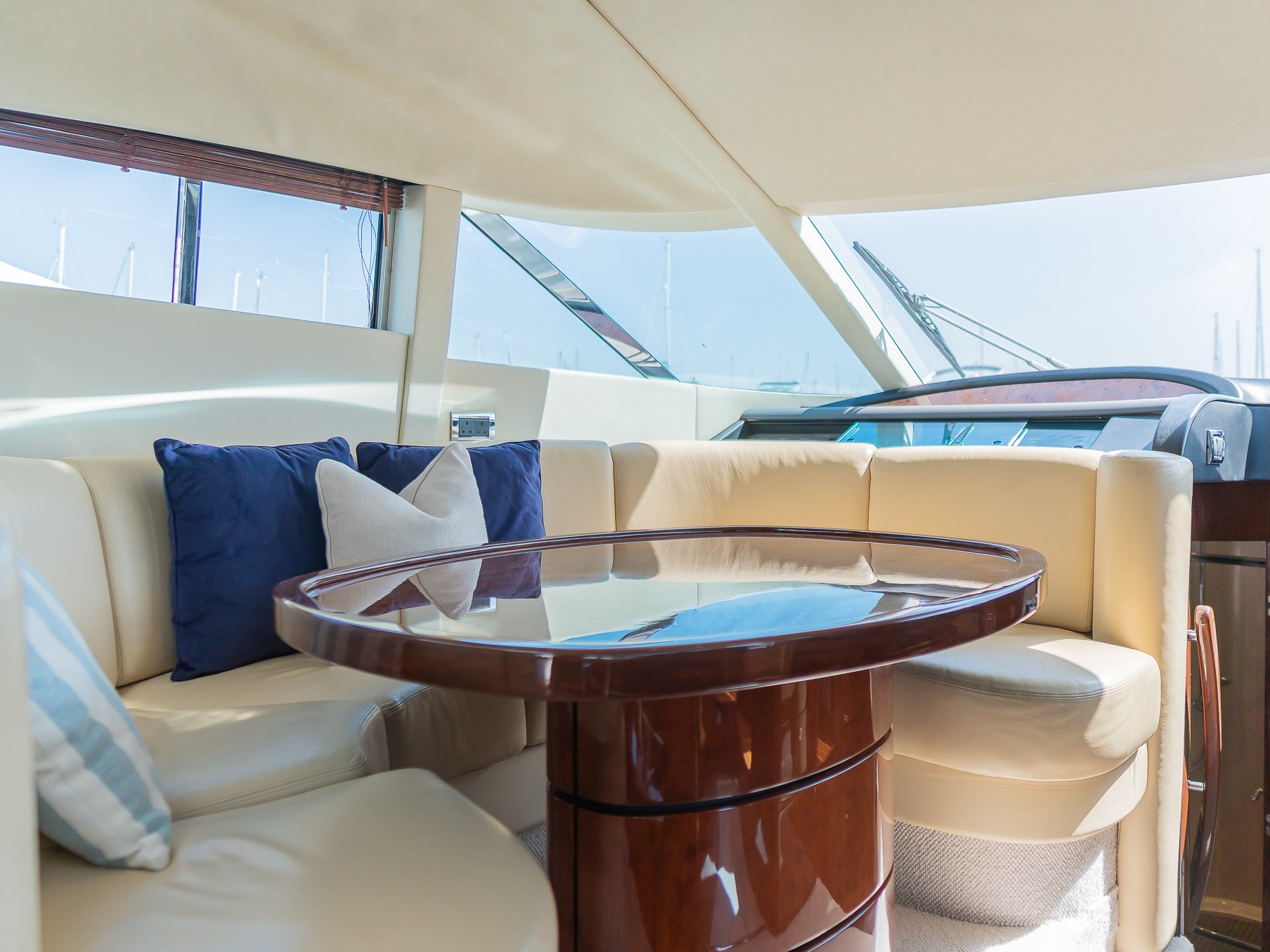 Dinette opposite lower helm with large high gloss cherry joinery table. Side access door on to starboard side deck. Stairwell up to flybridge.