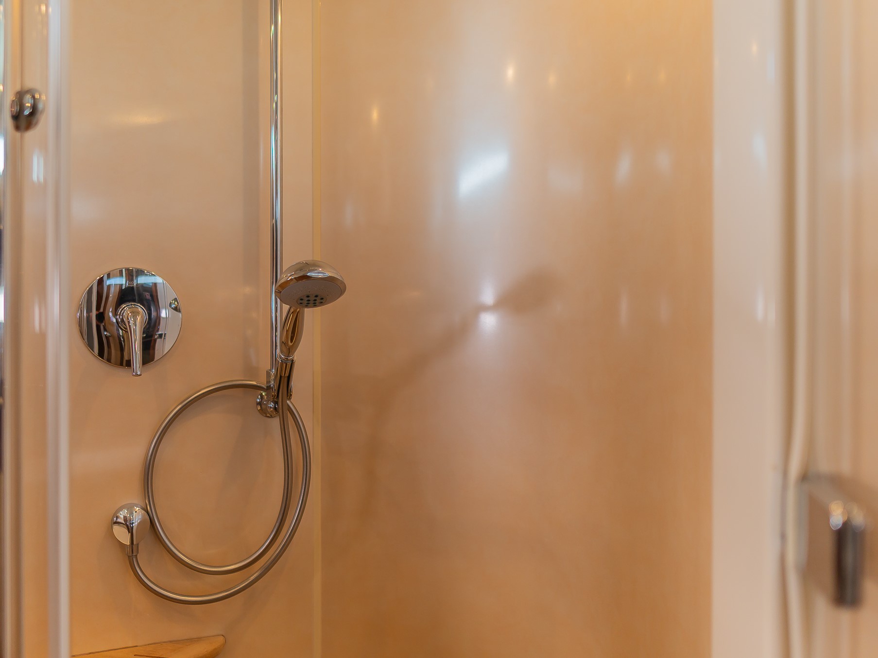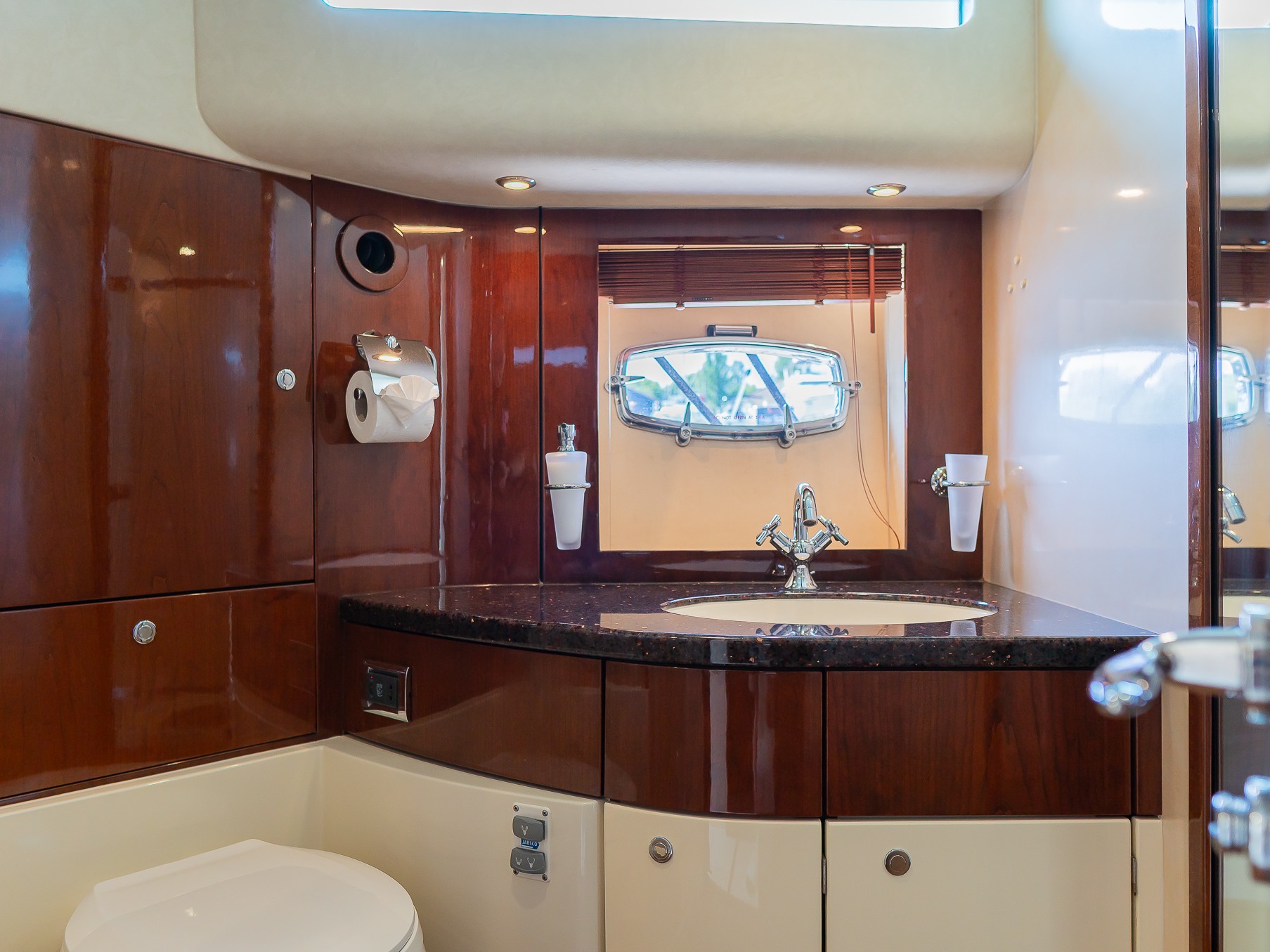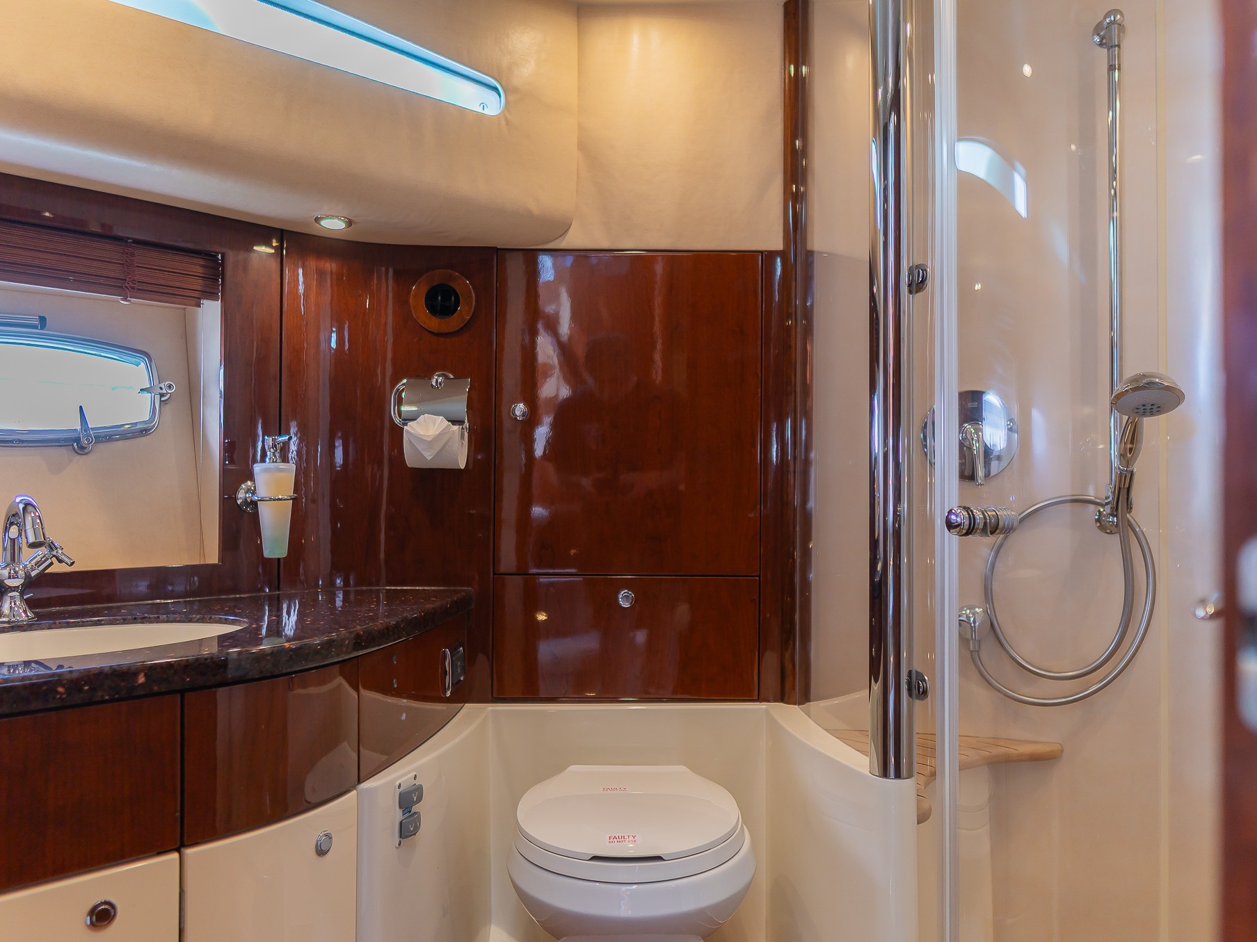 En-suite access to guest / day heads with electric fresh water flush toilet, hand basin and separate shower cubicle.