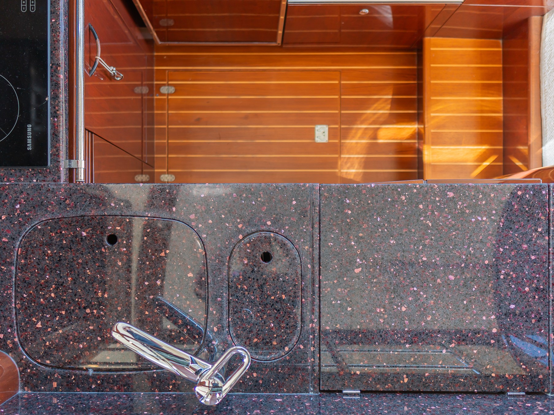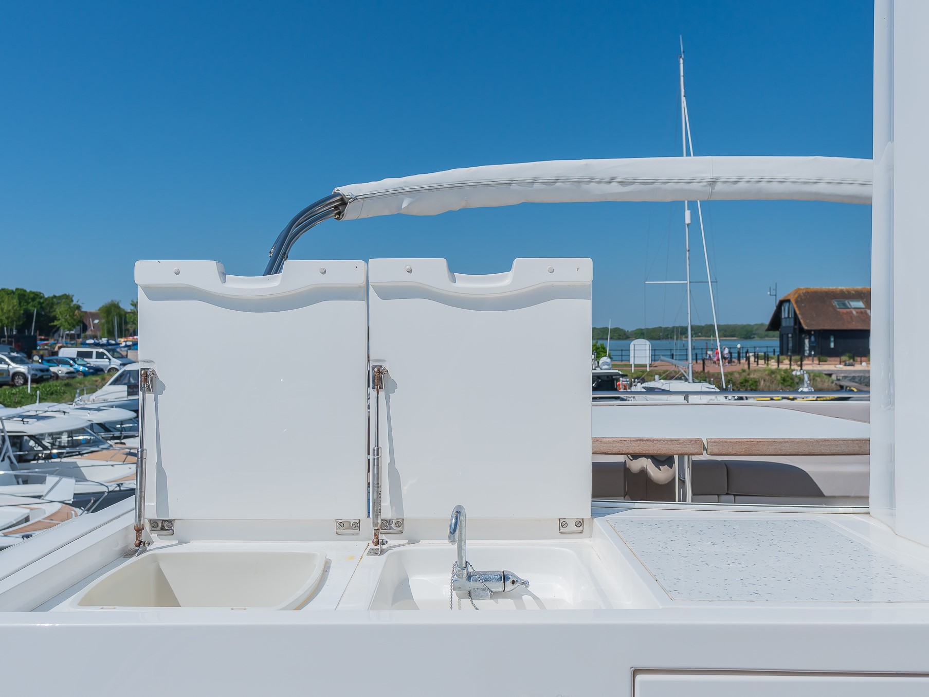 Galley behind helm to starboard equipped with Samsung 4-burner ceramic hob, Sharp microwave, fridge with small freezer compartment, twin sinks with hot and cold mixer tap, Avonite worktop, storage cupboards and drawers, dishwasher, deep storage under teak & holly flooring.