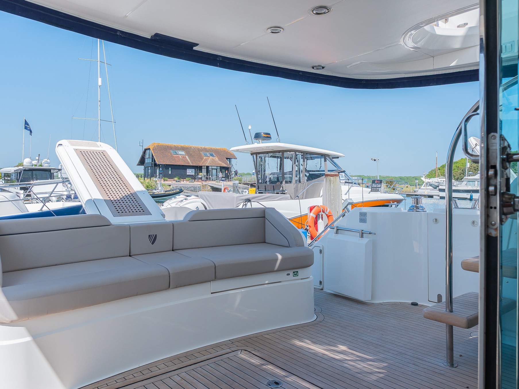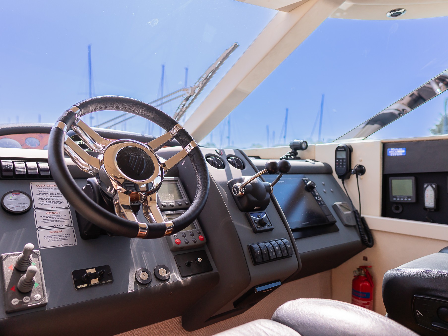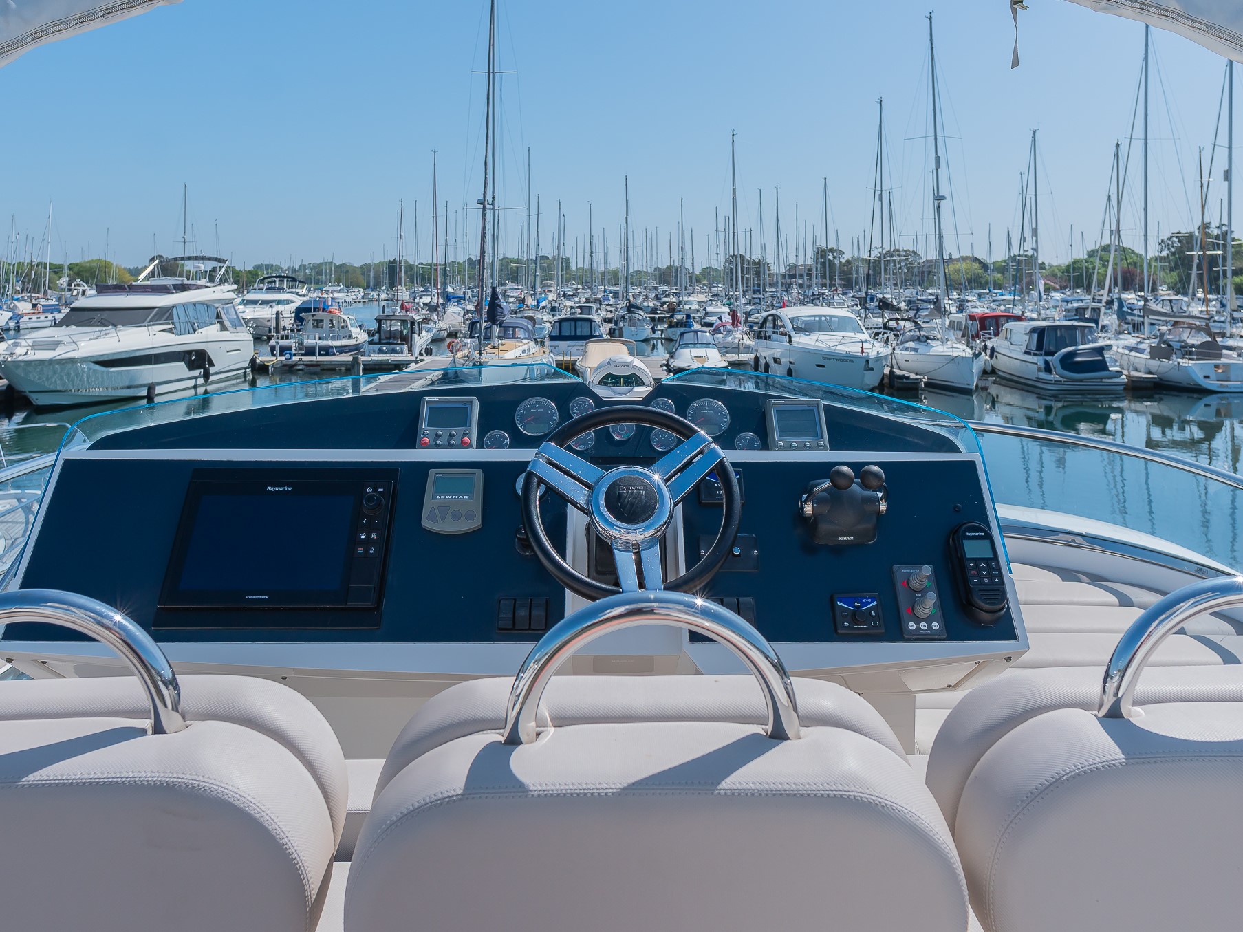 The flybridge features a fully equipped helm, along with seating and sunbathing areas perfect for enjoying time on the water with family and friends.
