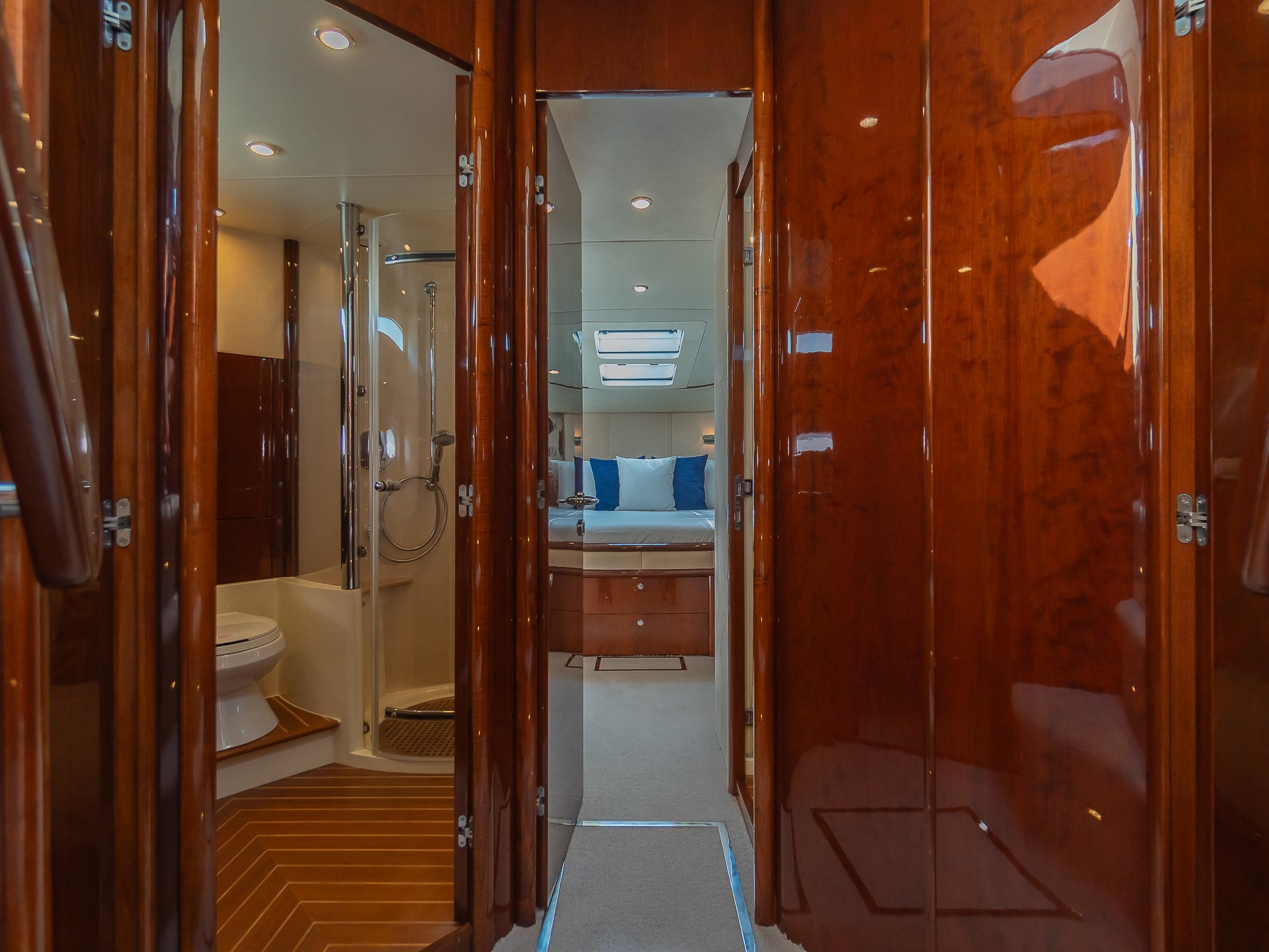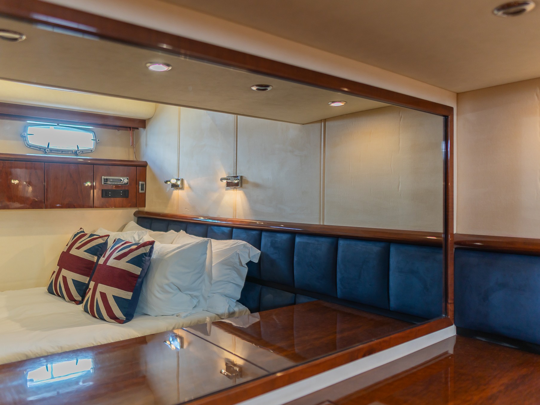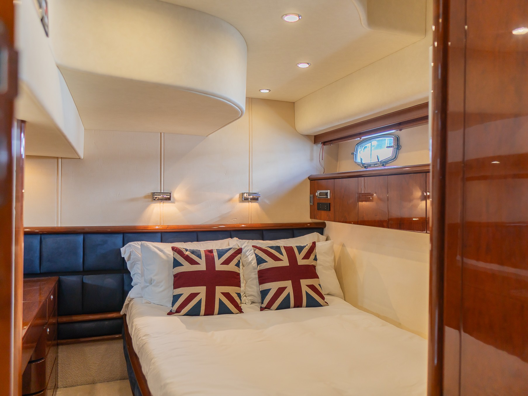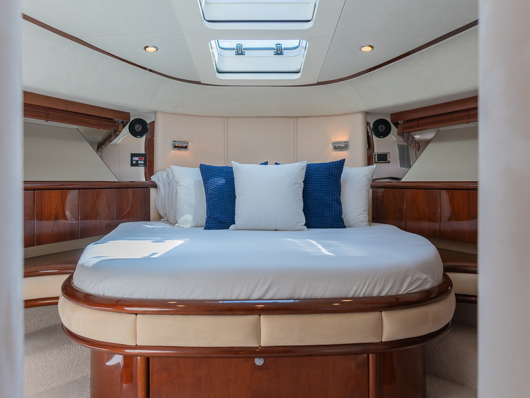 Master cabin forward with king-size double berth, twin wardrobes, mid level cupboards, storage in drawers under berth and large hatch with flyscreen and concealed blinds to foredeck. Flatscreen TV/DVD player.
