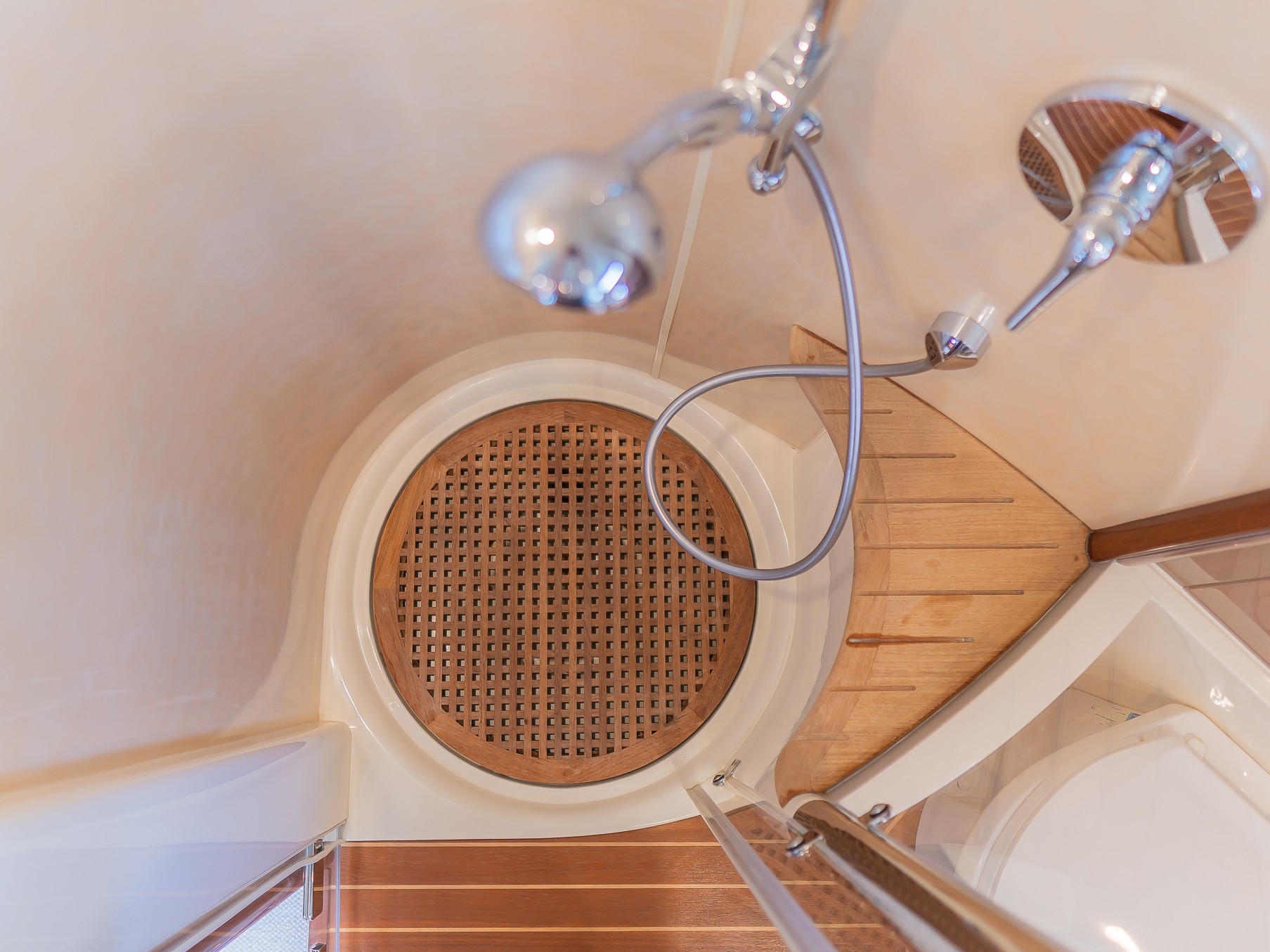 En-suite heads compartment with electric freshwater flush toilet, hand basin and separate shower cubicle with teak grating, storage cupboard, teak & holly floor.
